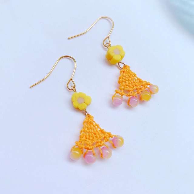 最近見たとても鮮やかな黄色のお花畑。 ほんのりホワイトやピンクが光に透けてとても綺麗でした。 そんな自然で素敵な風景を身にまとえたらいいな・・・鮮やかな黄色のお花のアクセサリーです。 [サイズ] 縦 3cm 横3cm [材料] 黄色糸・ガラスビーズ・ハンドメイド樹脂ビーズ・ピアス金具 ------------------------------------------ 糸だけでできた不思議な感覚のアクセサリー 『ニャンドゥティ』 技法は南米パラグアイで生まれました。 布に引っ掛ける様に刺繍するため最後に糊付けし、固めるとパリッと布から剥がれます。 そのためとても軽く透明感があり、強度も強いアクセサリーになります。 絶対なくさないピアスをお探しの皆様へ ◉壊れた、なくした等ご連絡ください!無料でリペアして送付させて頂きます。 (リペアは全く同じでない場合がございます。リペアの際には片方の写真を添付頂きます旨をご了承下さい) ◉作り方などの詳細はこちら https://thebase.in/mag/aminbo-base-shop/2020/10/17/131407 ◉2回め以降のご注文よりオーダーも受け付けています https://thebase.in/mag/aminbo-base-shop/2020/11/05/171844 水洗い不可 イヤリングに変更可能 *必ず備考欄にイヤリング変更希望とご記入ください。 ◆交換は破損時以外は行っておりませんのでご了承ください。 ◆ハンドメイド作品の為、とてもデリケートな作りとなっております。 強く引っ張ると破損の恐れがありますのでご注意ください。 ◆糸を固める事で少し強度をあげております。 水に濡れると耐久性が落ちる場合がございます。 ◆web 上と若干お色が違って見える場合がございます。 s819