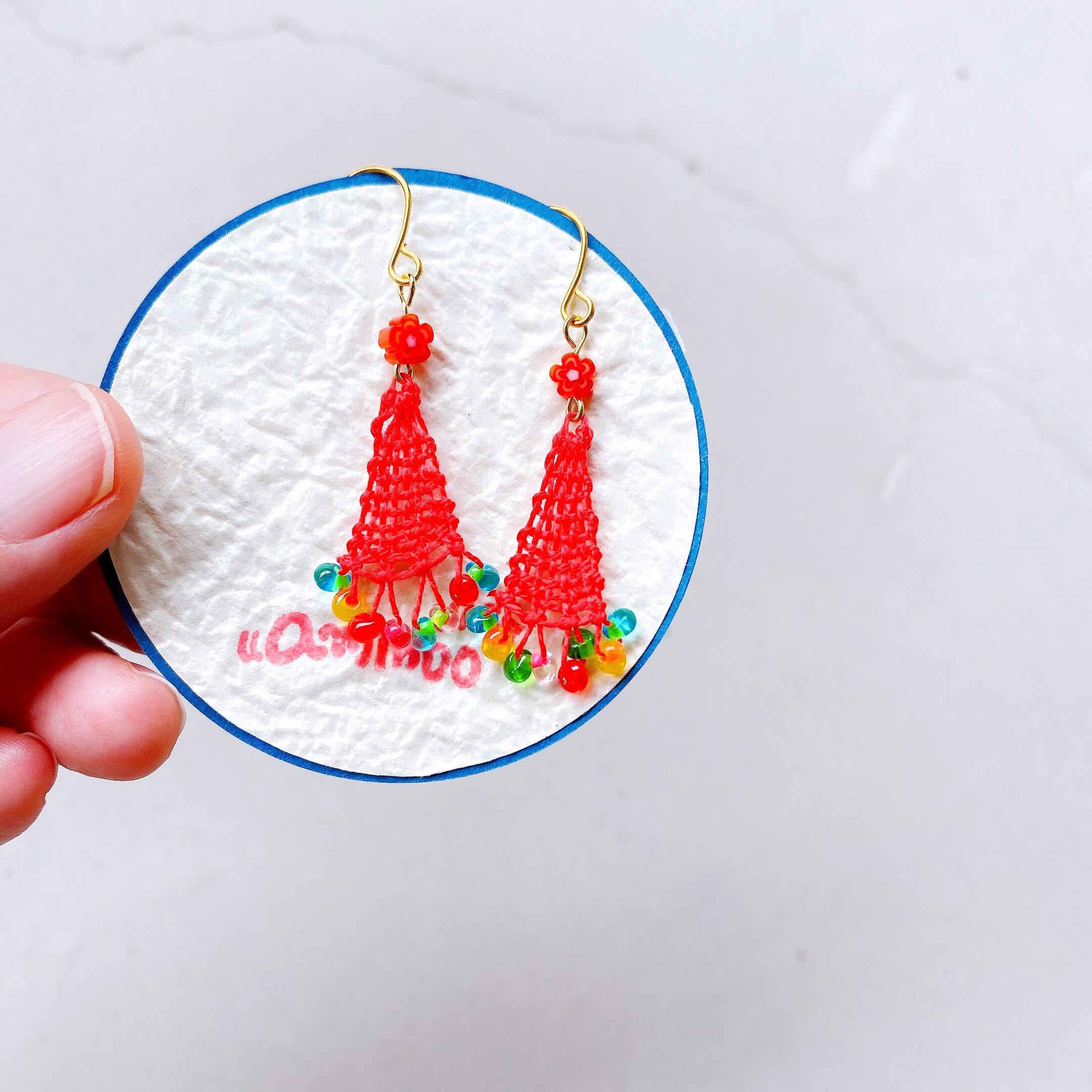 鮮やかな赤にネオンカラーのとても楽しいガラスビーズを合わせました。