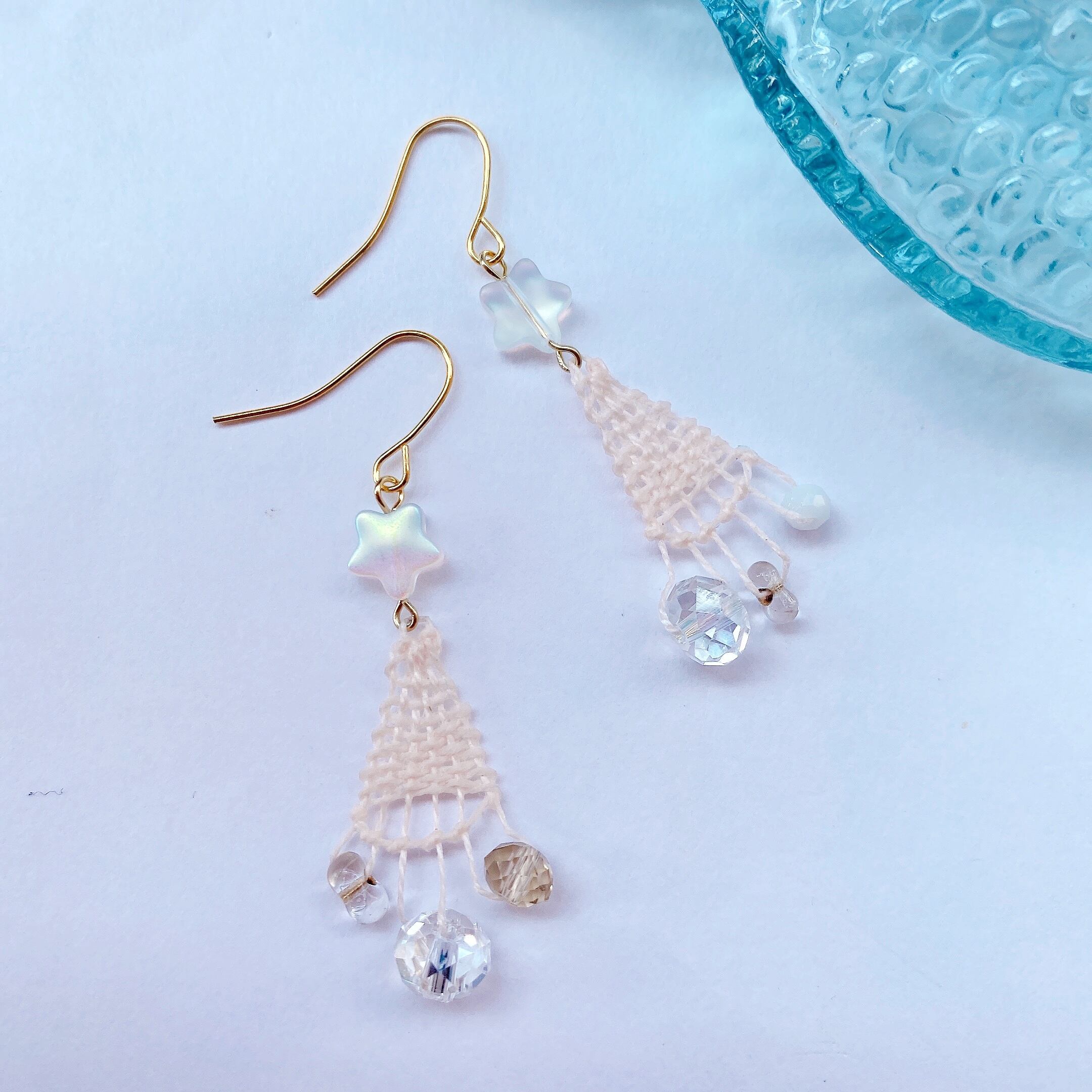 真っ白な糸と透明ビーズ達を合わせ、キラッと輝くガラス星をトップにつけました。