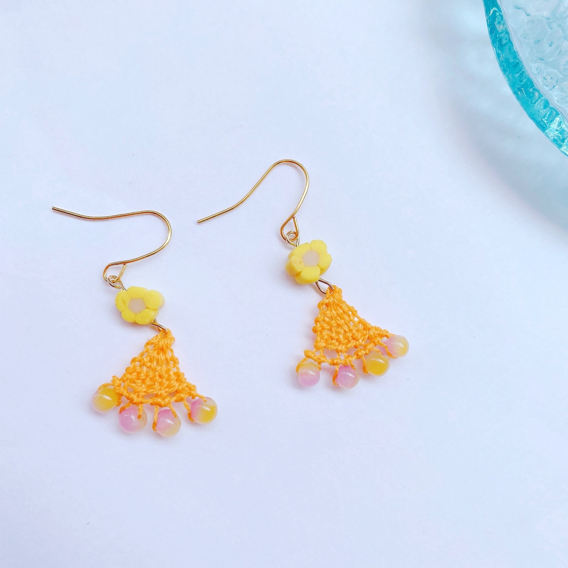 [材料] 黄色糸・ガラスビーズ・ハンドメイド樹脂ビーズ・ピアス金具