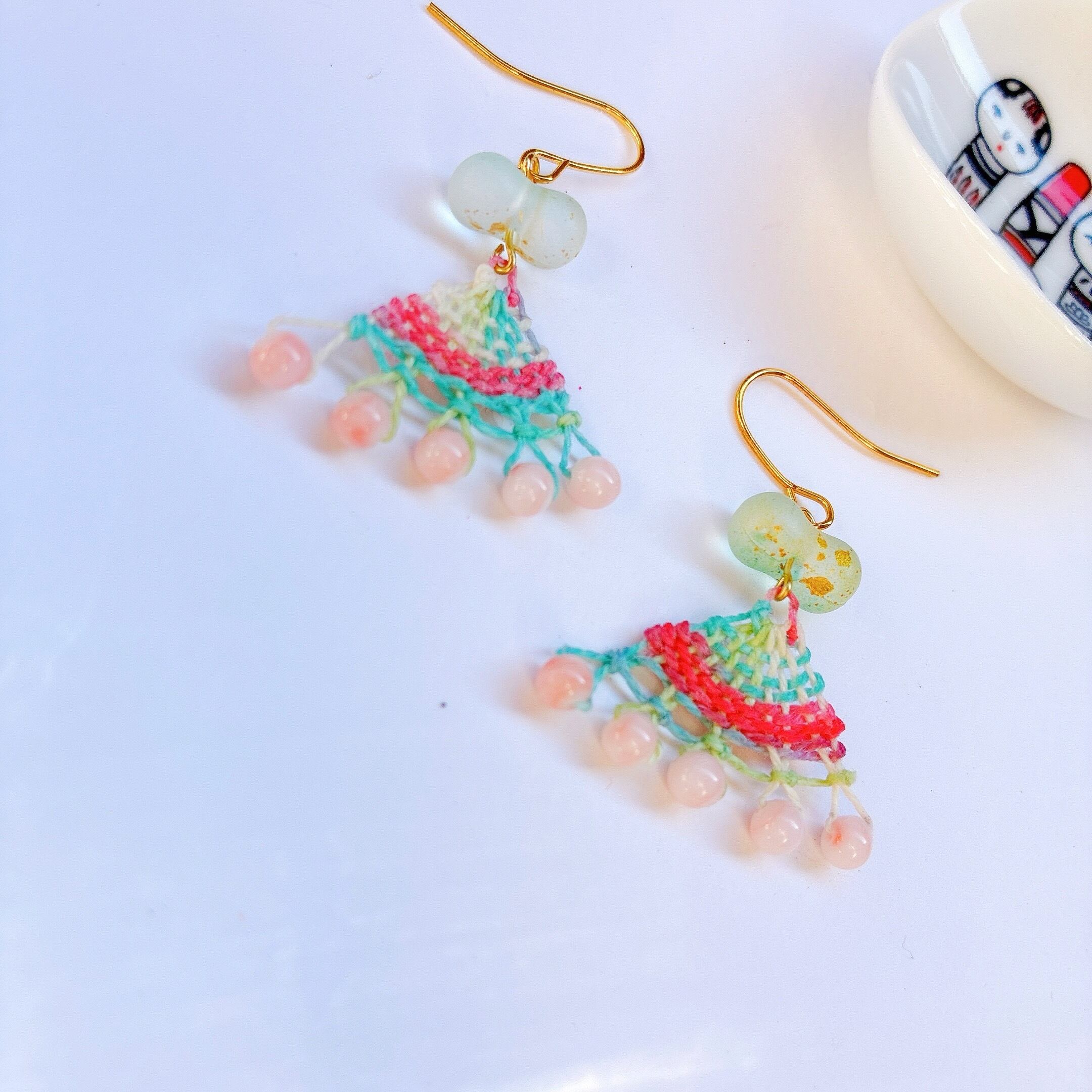 [材料] グリーンとピンクのグラデーション糸・ガラスビーズ・コーラルビーズ・ピアス金具
