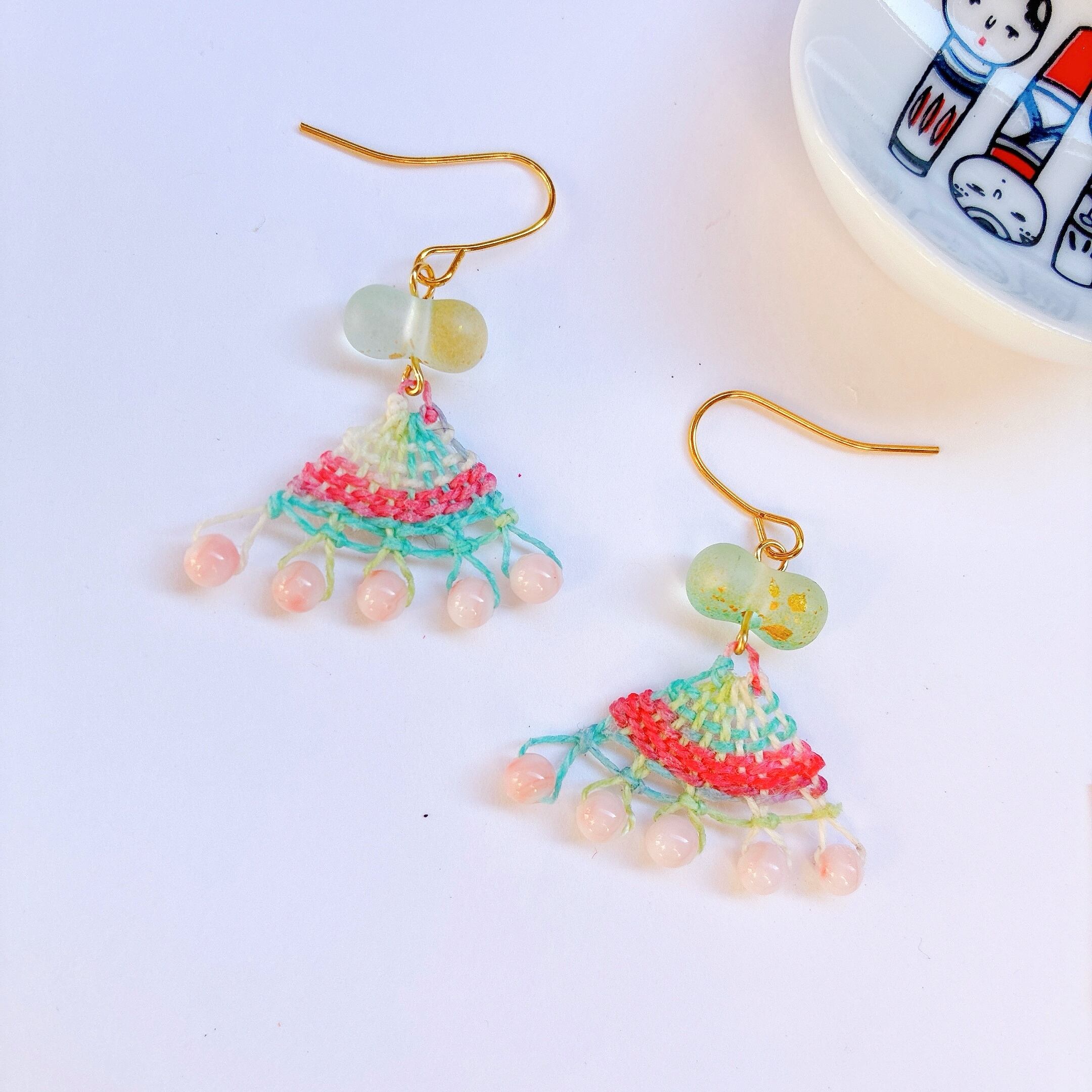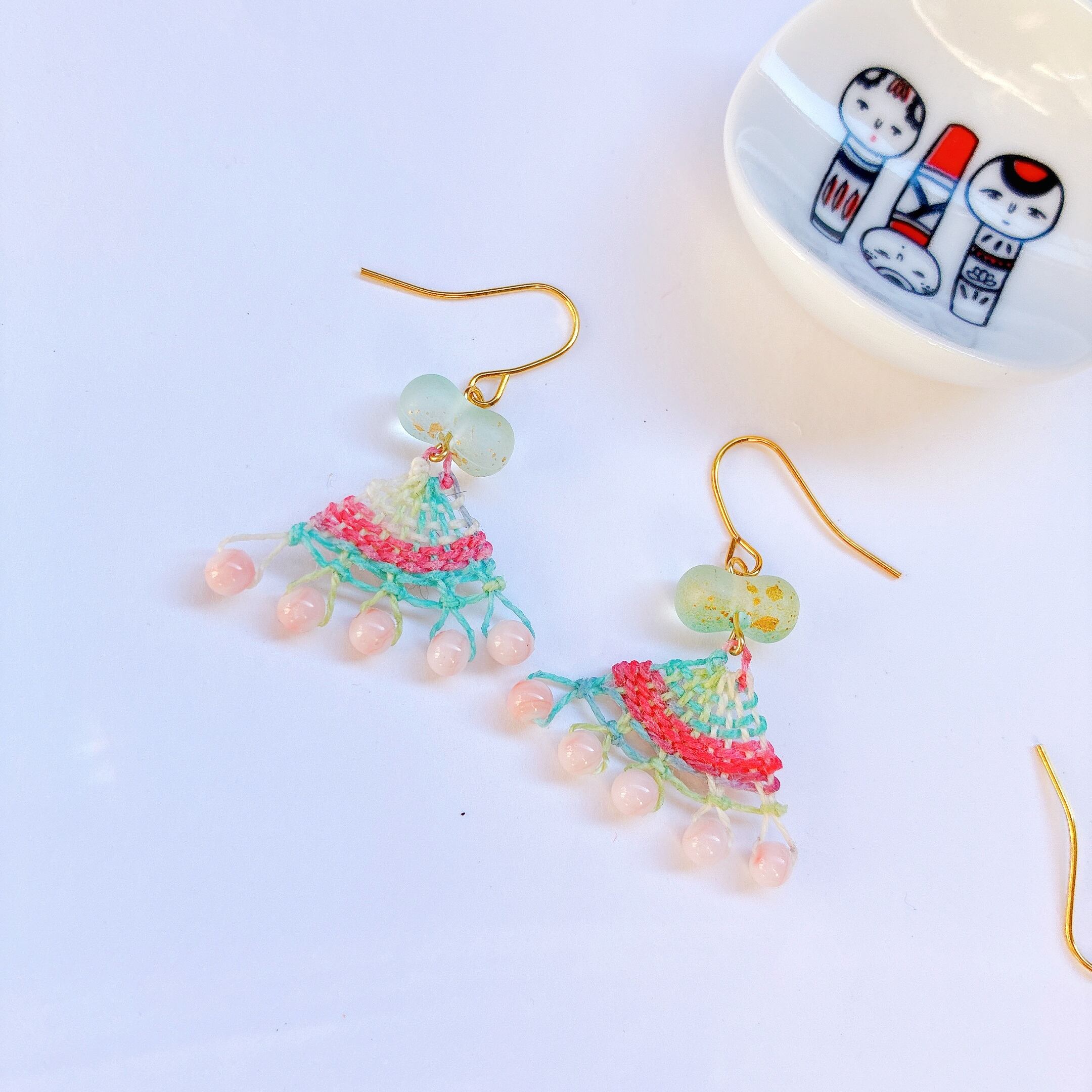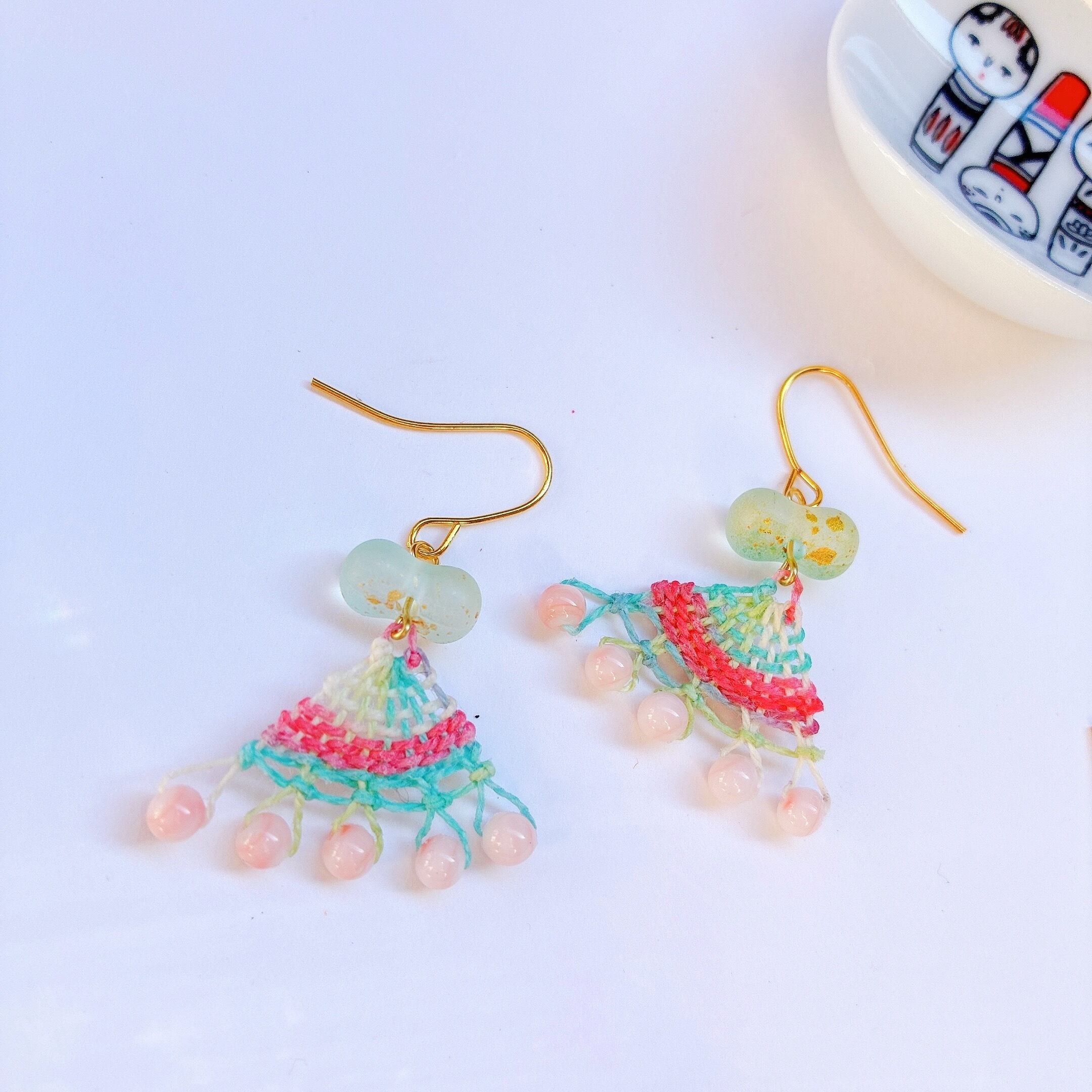 優しい色の糸とビーズを合わせて、少し広がるデザインにしました。