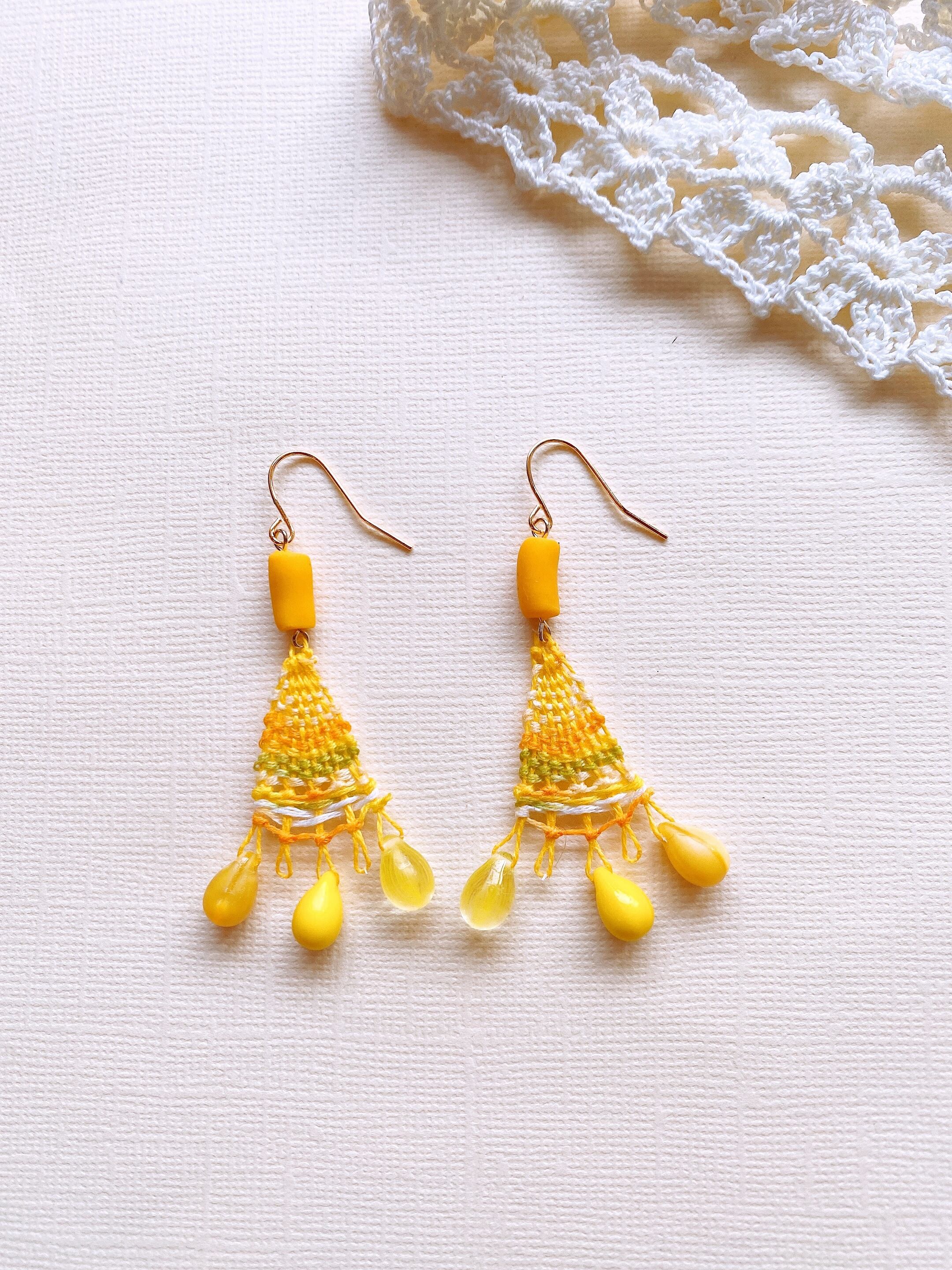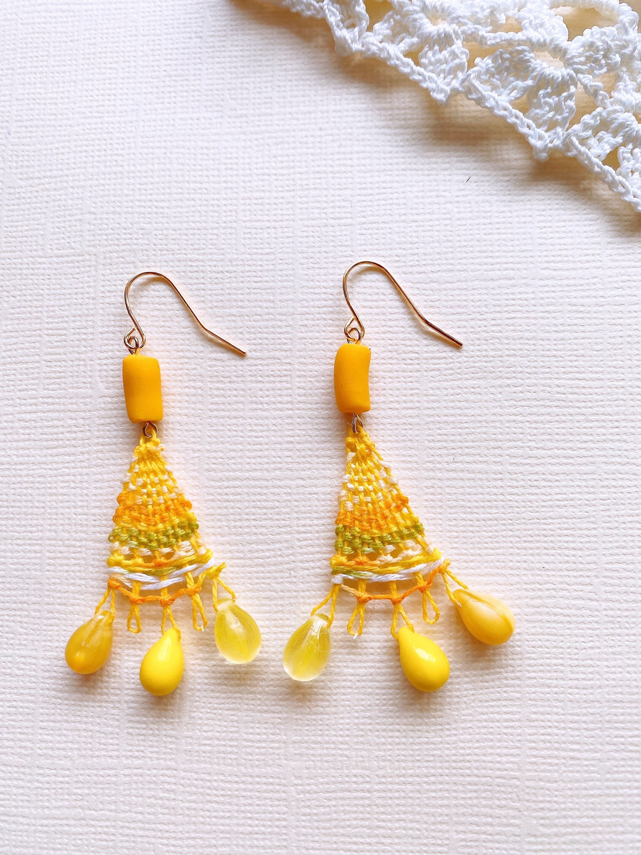 [材料] DMC刺繍糸・黄色ぼかし刺繍糸・しずくガラスビーズ・樹脂オリジナルビーズ・ピアス金具