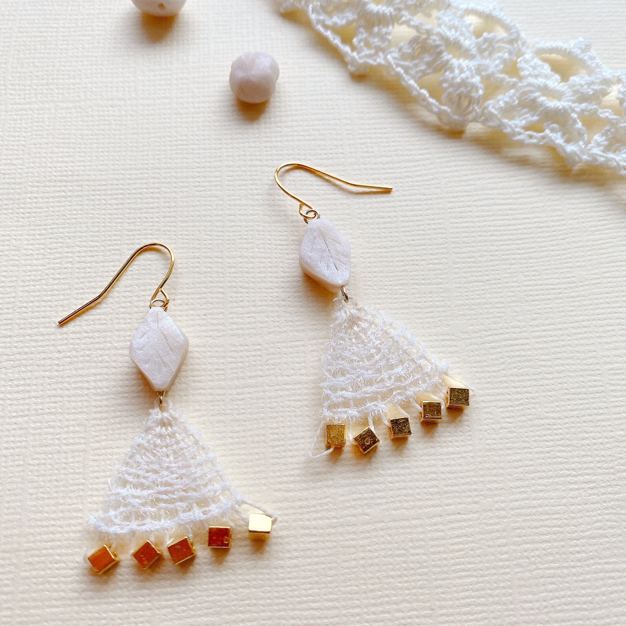 [材料] DMC刺繍糸・光沢のあるモールのような糸・スクエアゴールドビーズ・樹脂オリジナルビーズ・ピアス金具