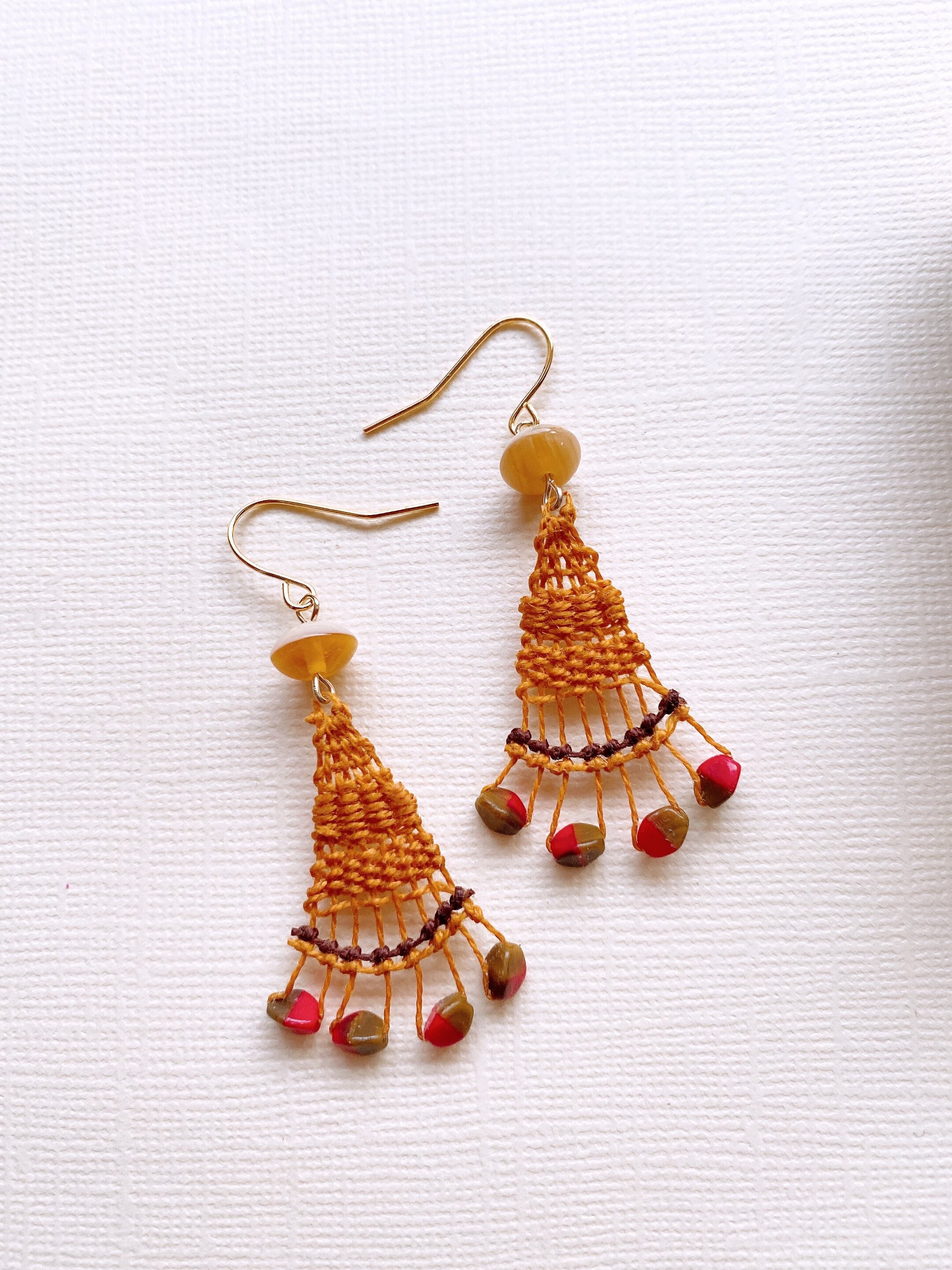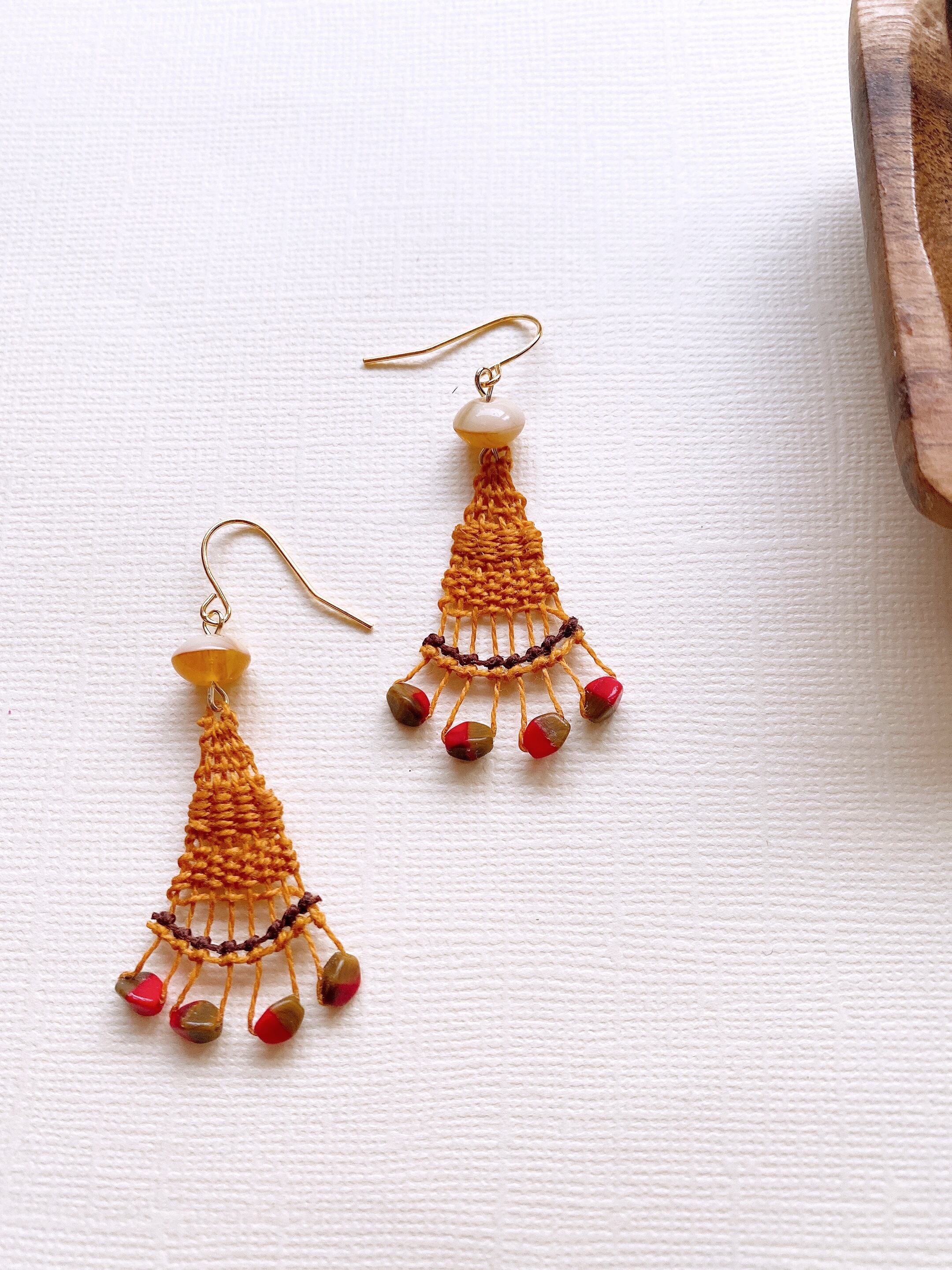 [材料] DMC刺繍糸・三角イチゴ&チョコのようなビーズ・キャラメル色ガラスビーズ・ピアス金具
