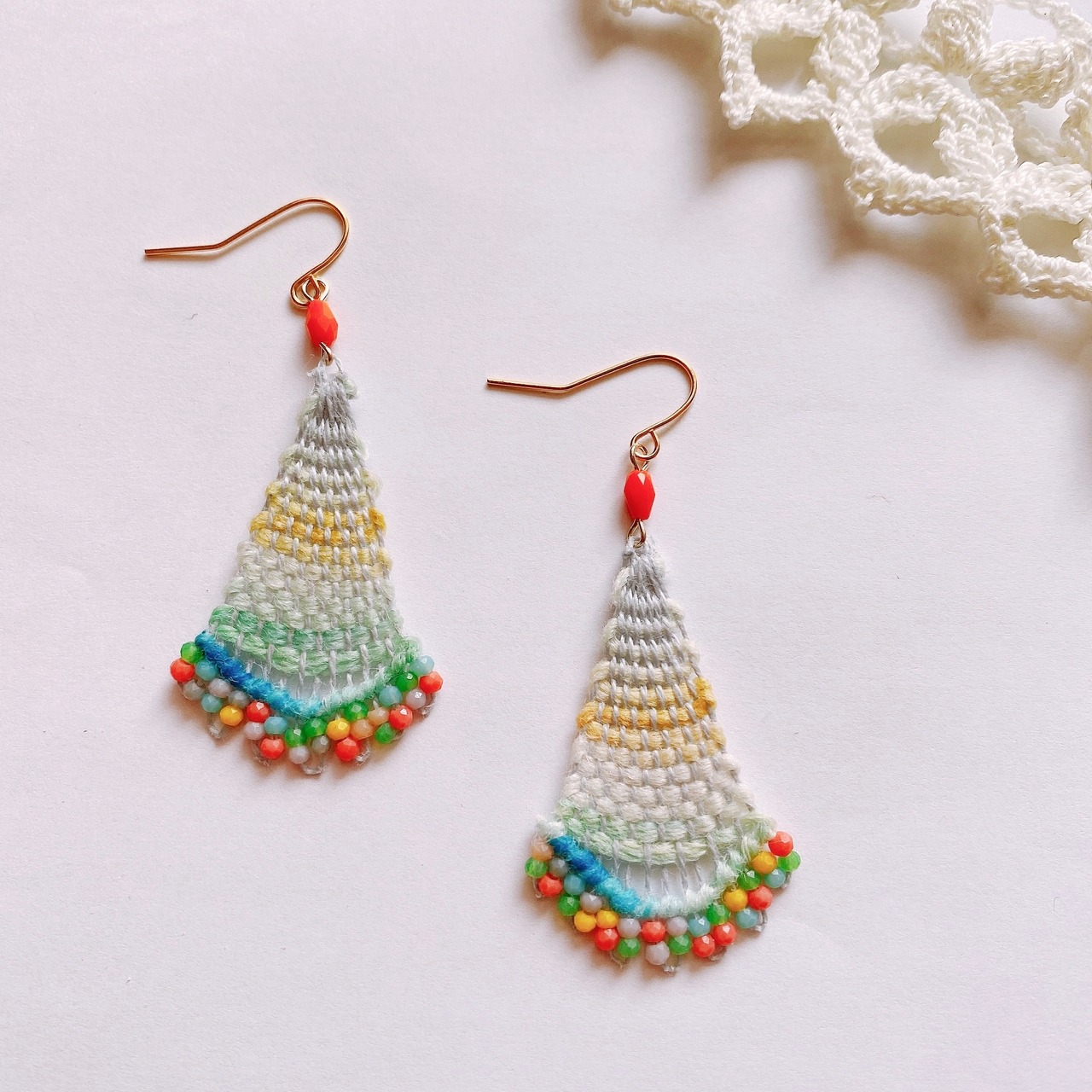 すその部分にオレンジ・エメラルドグリーン・イエローなどの小さなダイヤカットのビーズを付けました。微妙に変わる色合いと、糸も徐々に変化していくのが楽しいです。