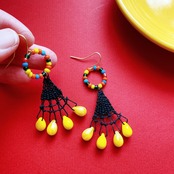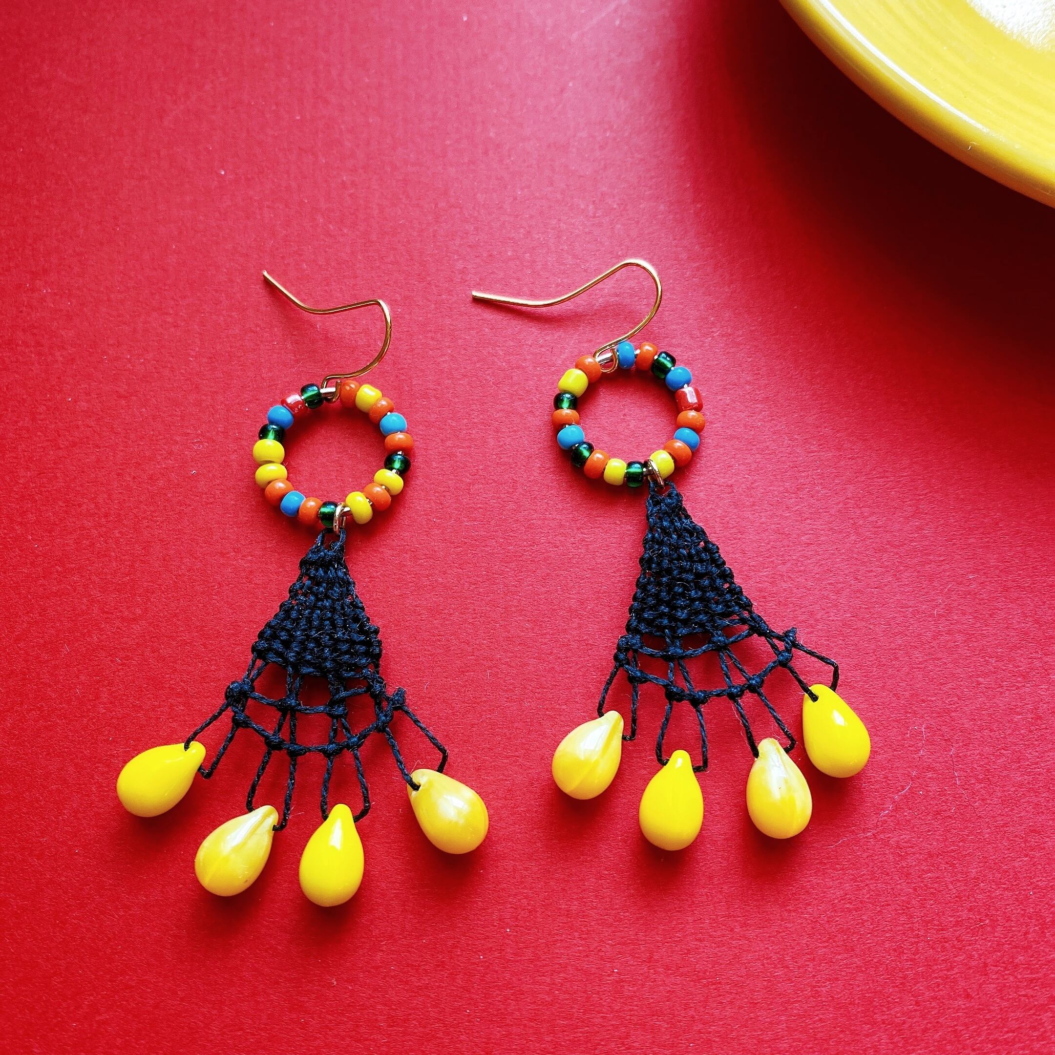[材料] 刺繍糸・しずく型イエロービーズ・ビーズで作ったフープ・ピアス金具