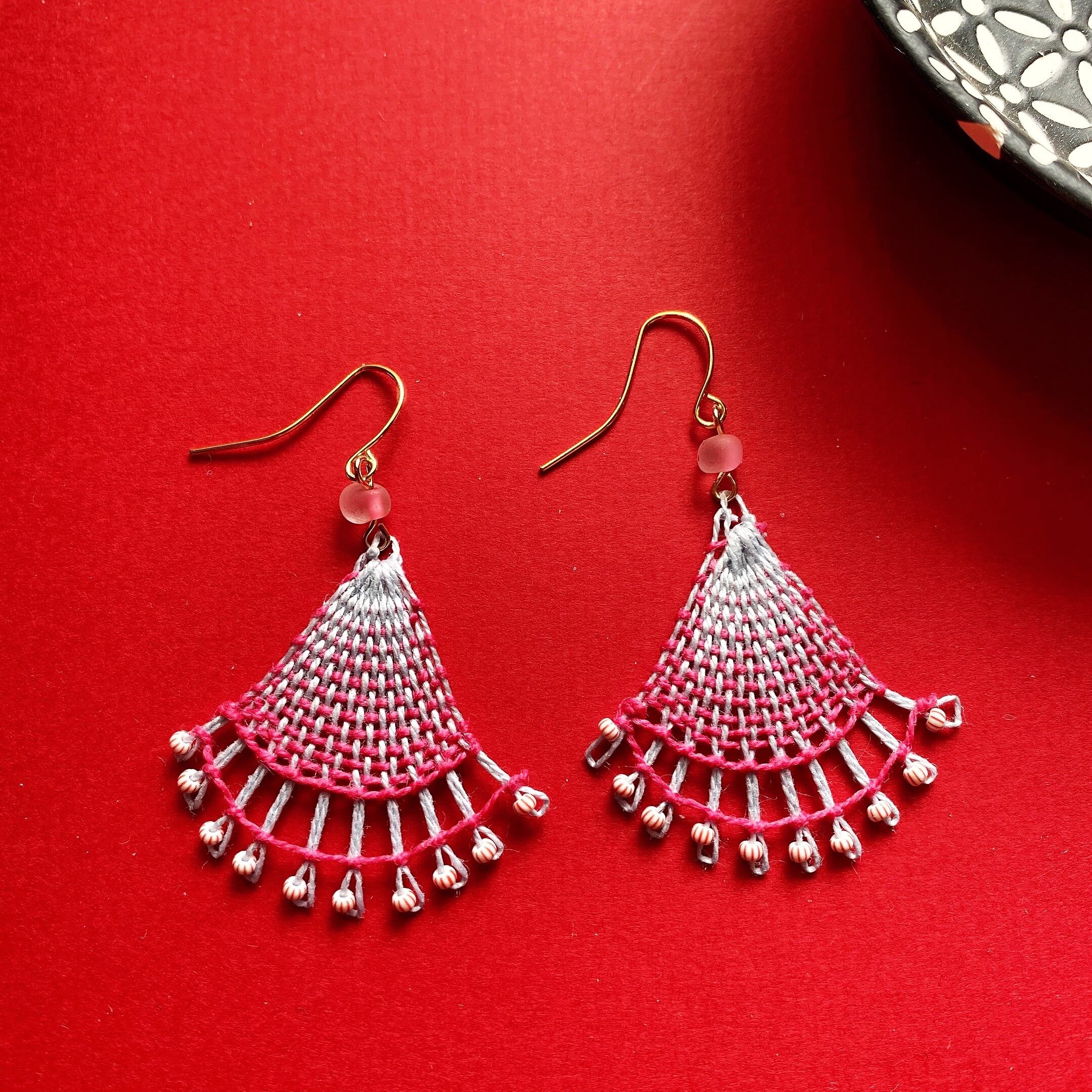 [材料] 刺繍糸・ストライプ小ビーズ・半透明ピンク&ホワイトビーズ・ピアス金具
