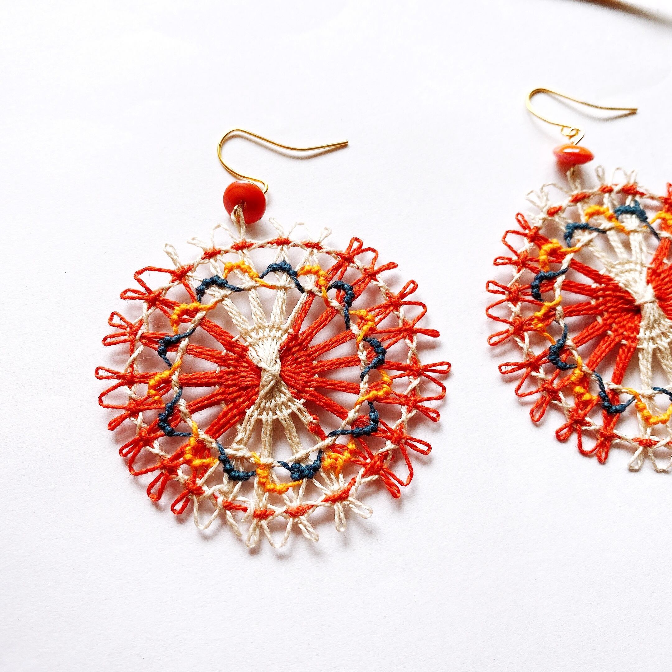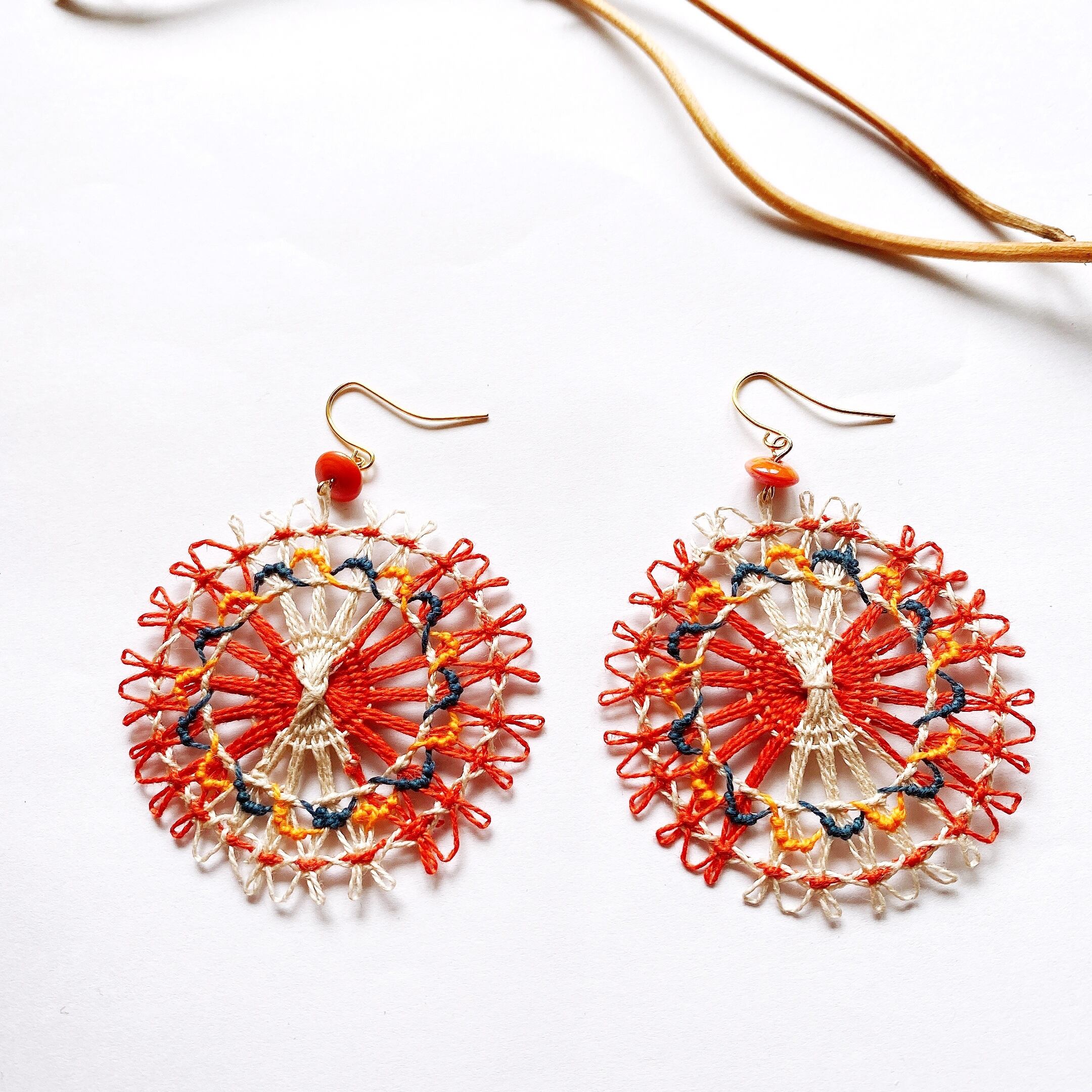 [材料] 刺繍糸(オレンジ・白・グレー・黄色)・オレンジ色ビンテージビーズ・ピアス金具