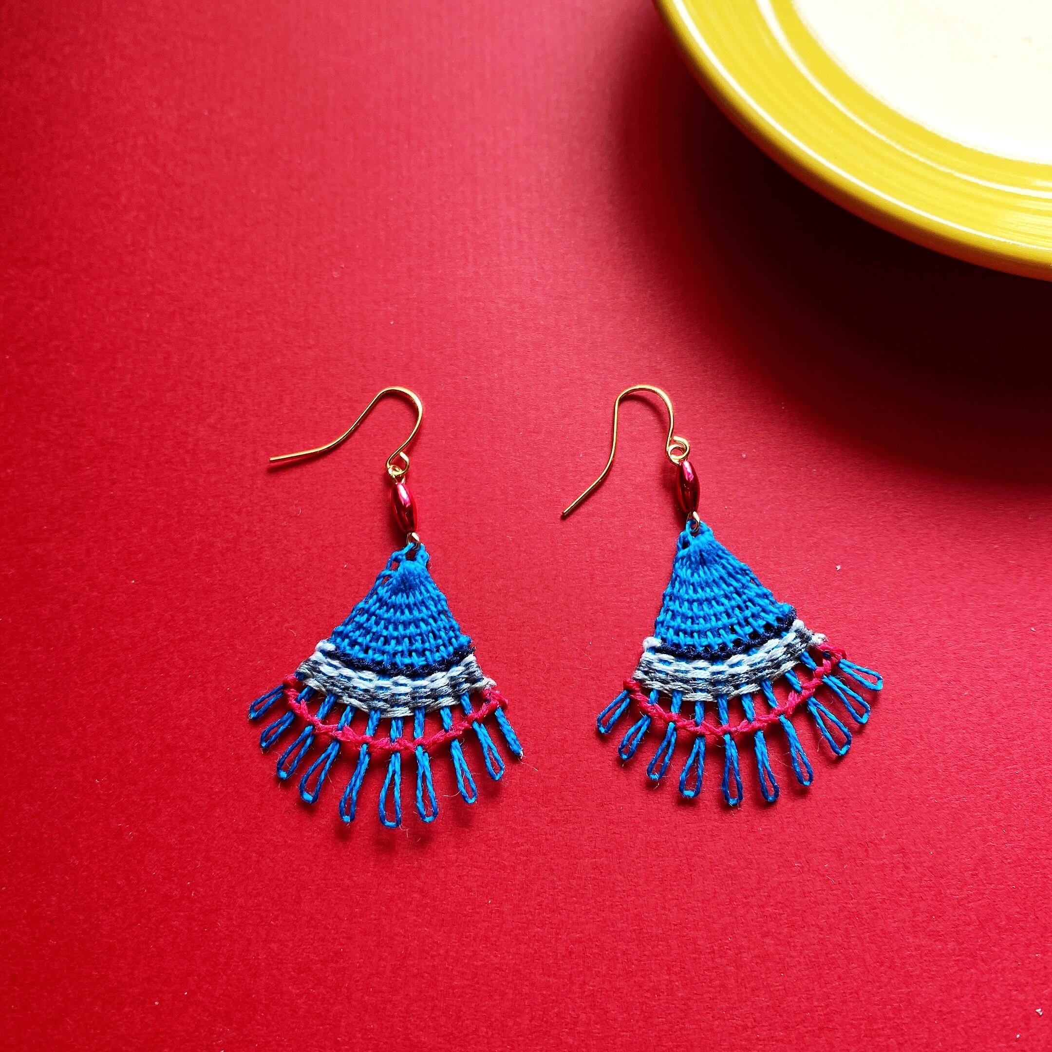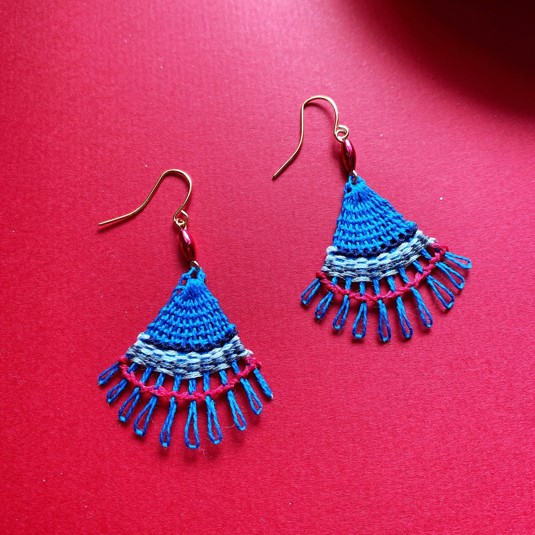 [材料] 刺繍糸(濃ゆめのコバルトブルー、グレー・白)・フランス光るタイプのビンテージビーズ・ピアス金具