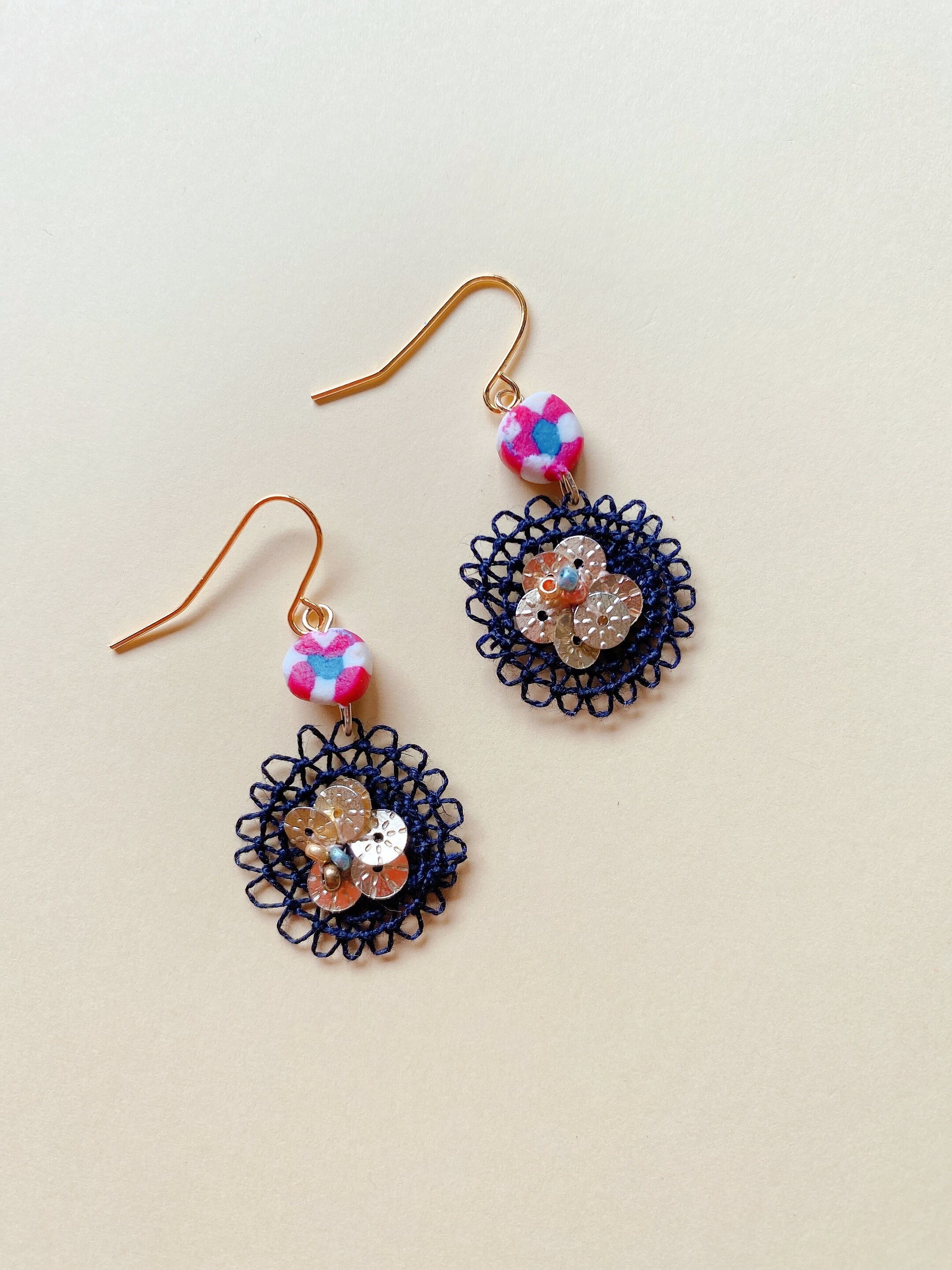 [材料] 刺繍糸(紺色)・ゴールドスパンコールビーズ・オリジナル樹脂ビーズ・ピアス金具