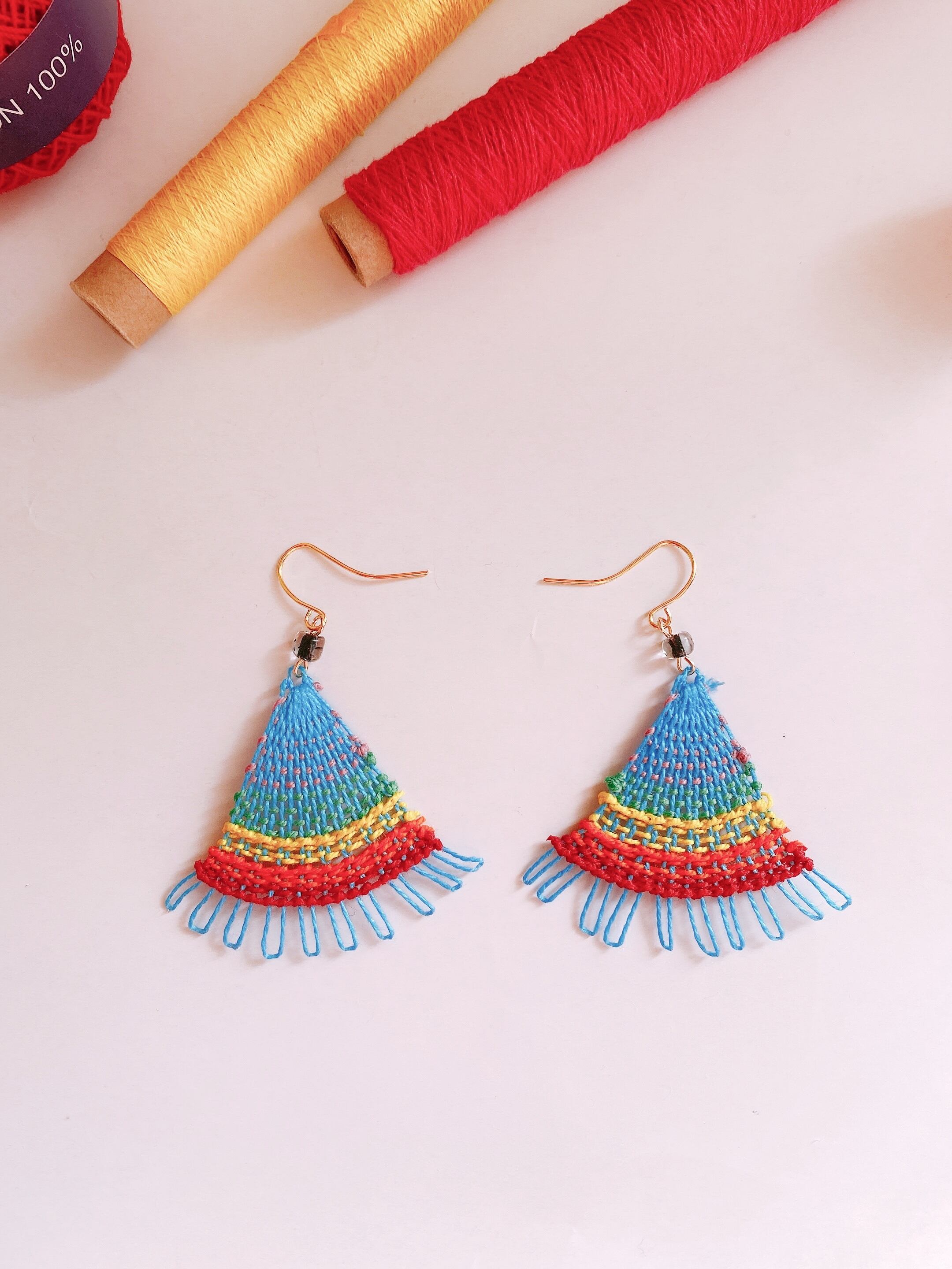 [材料] 刺繍糸(グリーン・水色・黄色・オレンジ・赤)・ 透明黒中塗りビーズ・ピアス金具