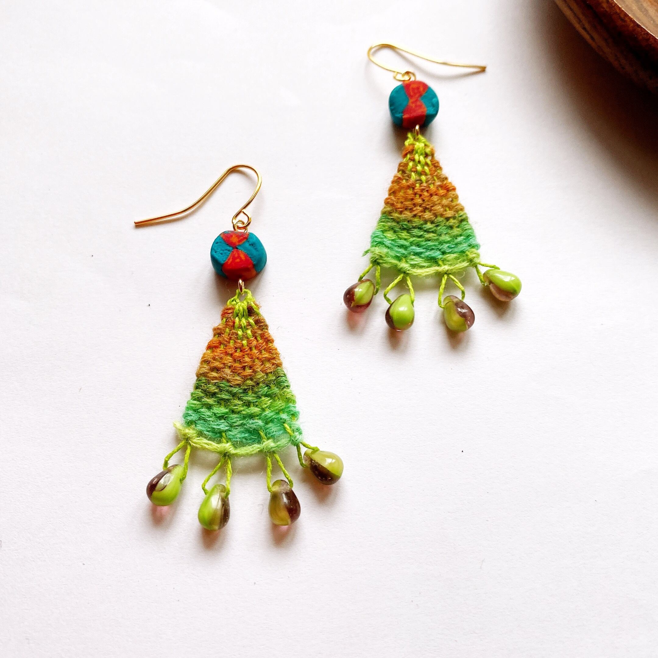 [材料] きみどり色刺繍糸・段染めウール糸・ 2色しずくビーズ・オリジナル樹脂ビーズ・ピアス金具