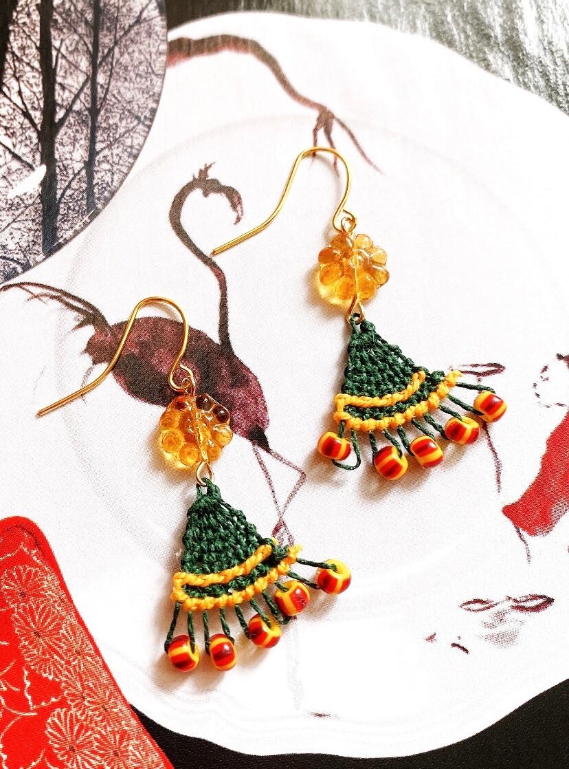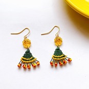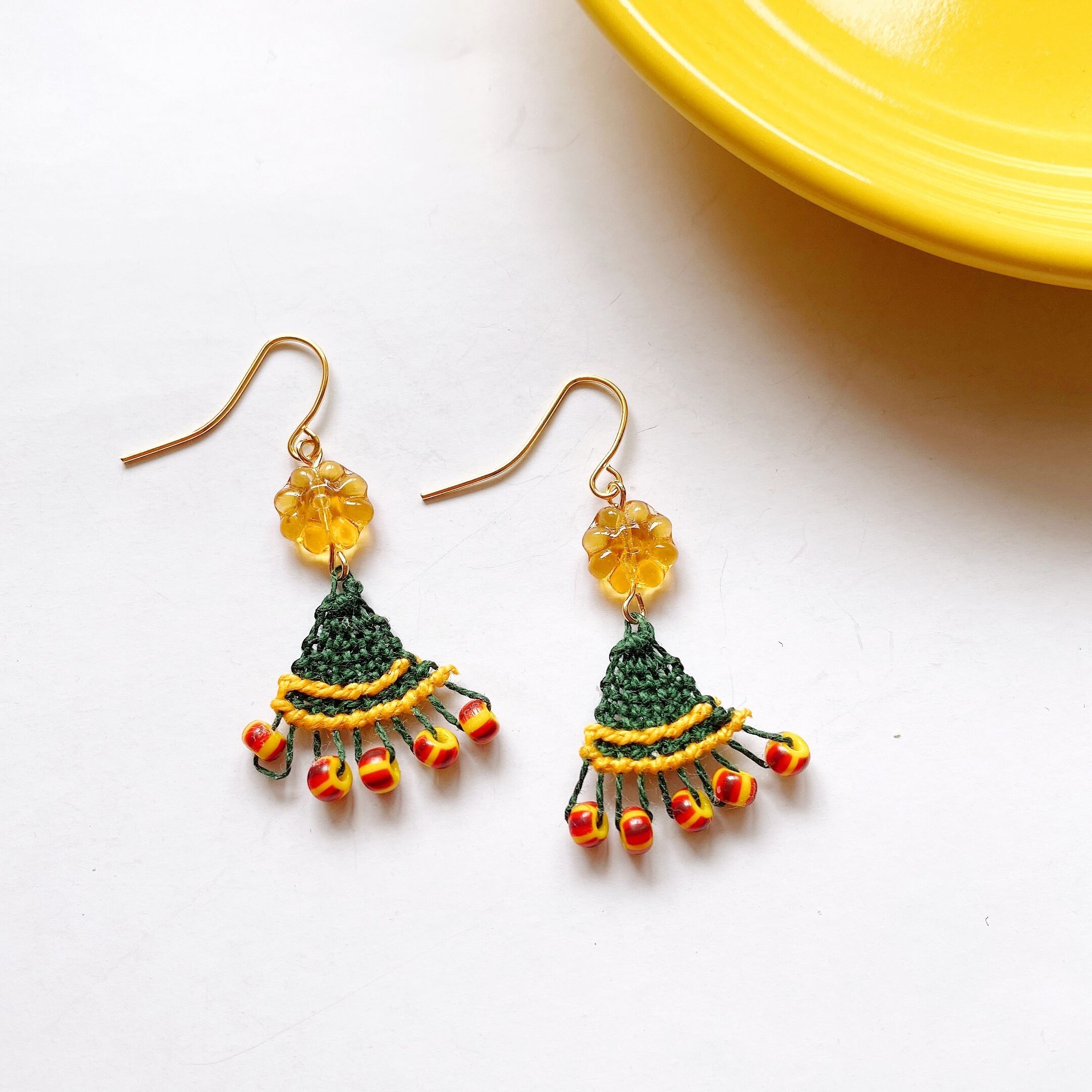 [材料] 緑色・黄色刺繍糸・3色ストライプビーズ・はちみつ色お花のガラスビーズ・ピアス金具