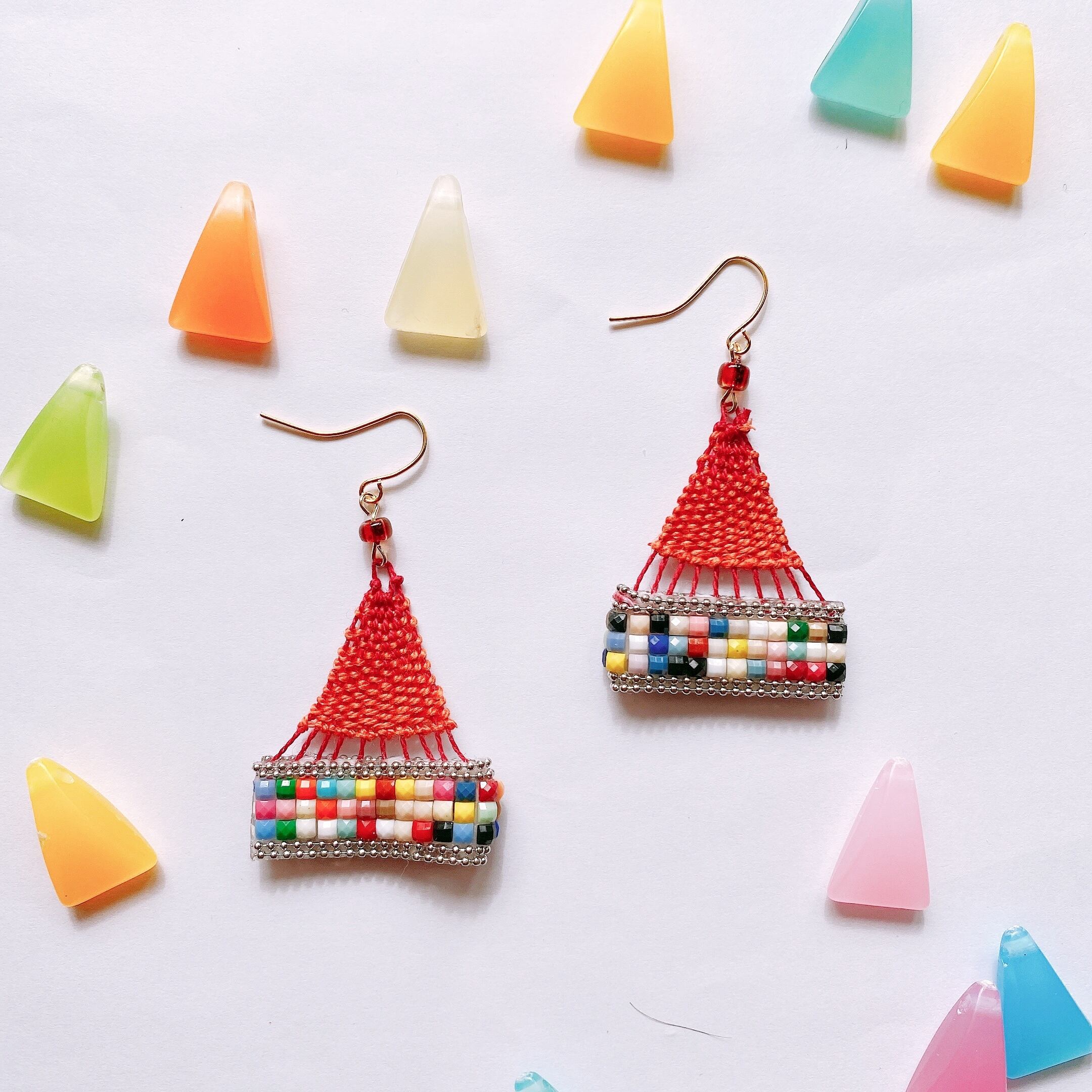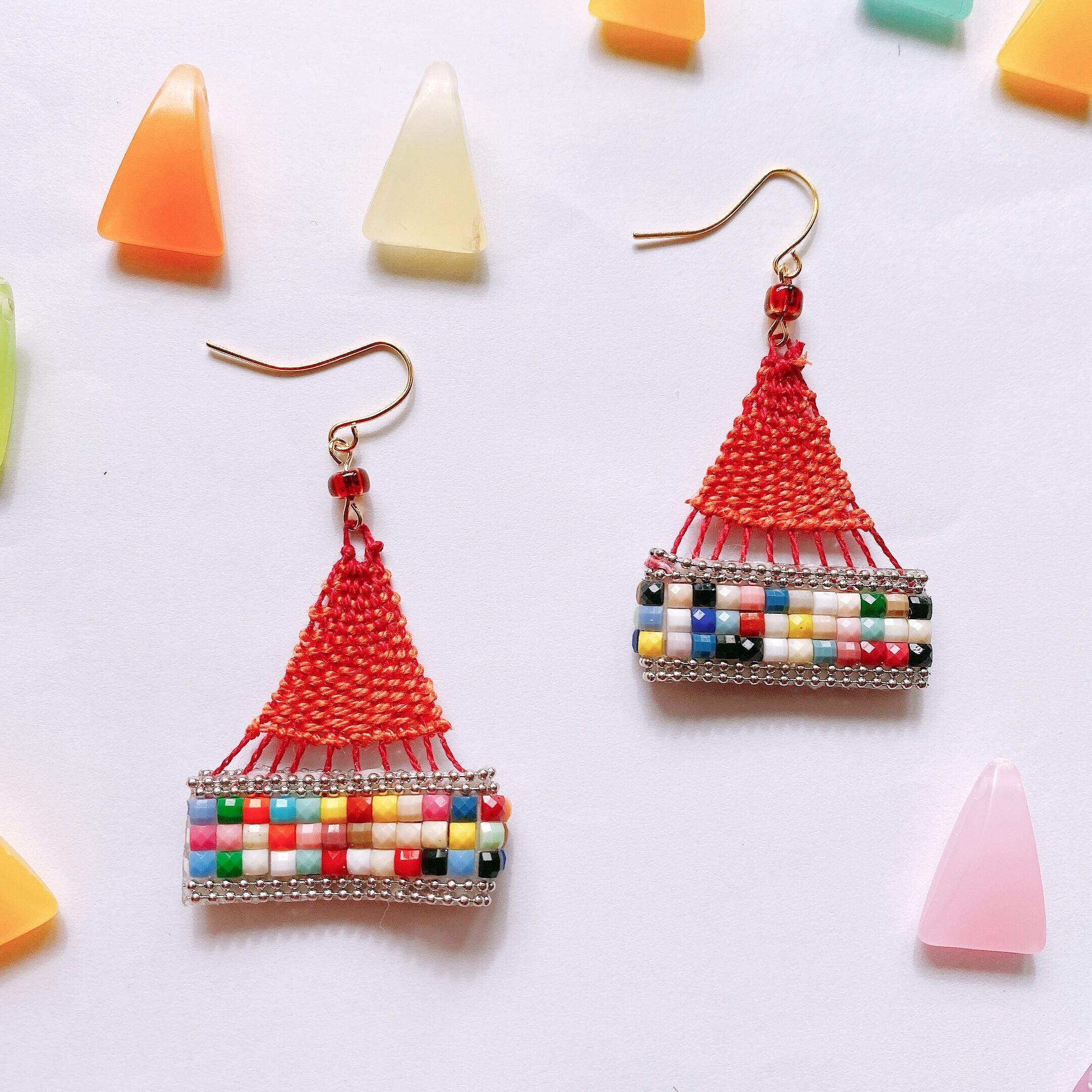 [材料] 赤・オレンジ刺繍糸・カラフルブレード・赤とゴールド2色ビーズ・ピアス金具