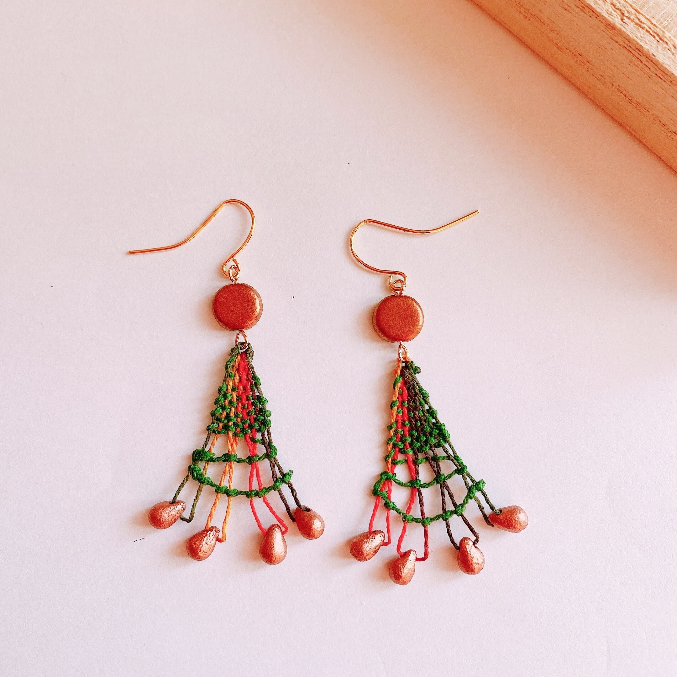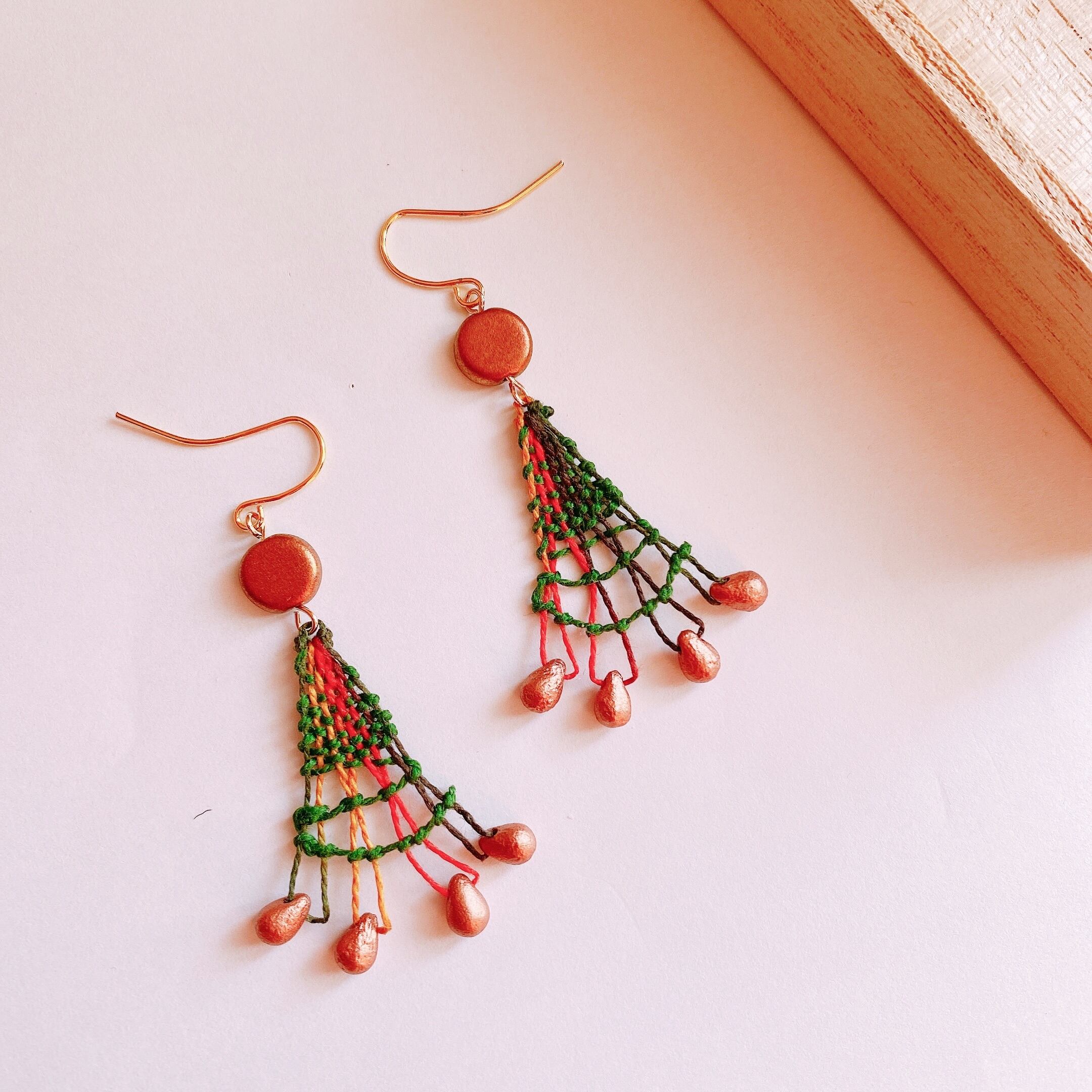 [材料] 赤・ブラウン色・緑刺繍糸・アンティークゴールドしずく形ビーズ・アンティークゴールド丸ビーズ・ピアス金具