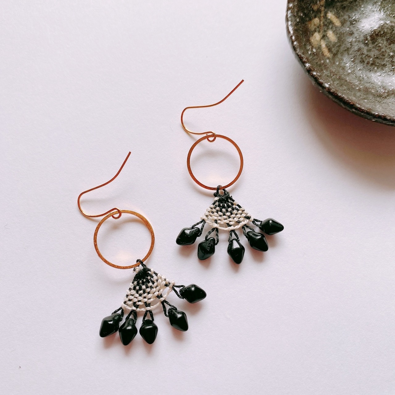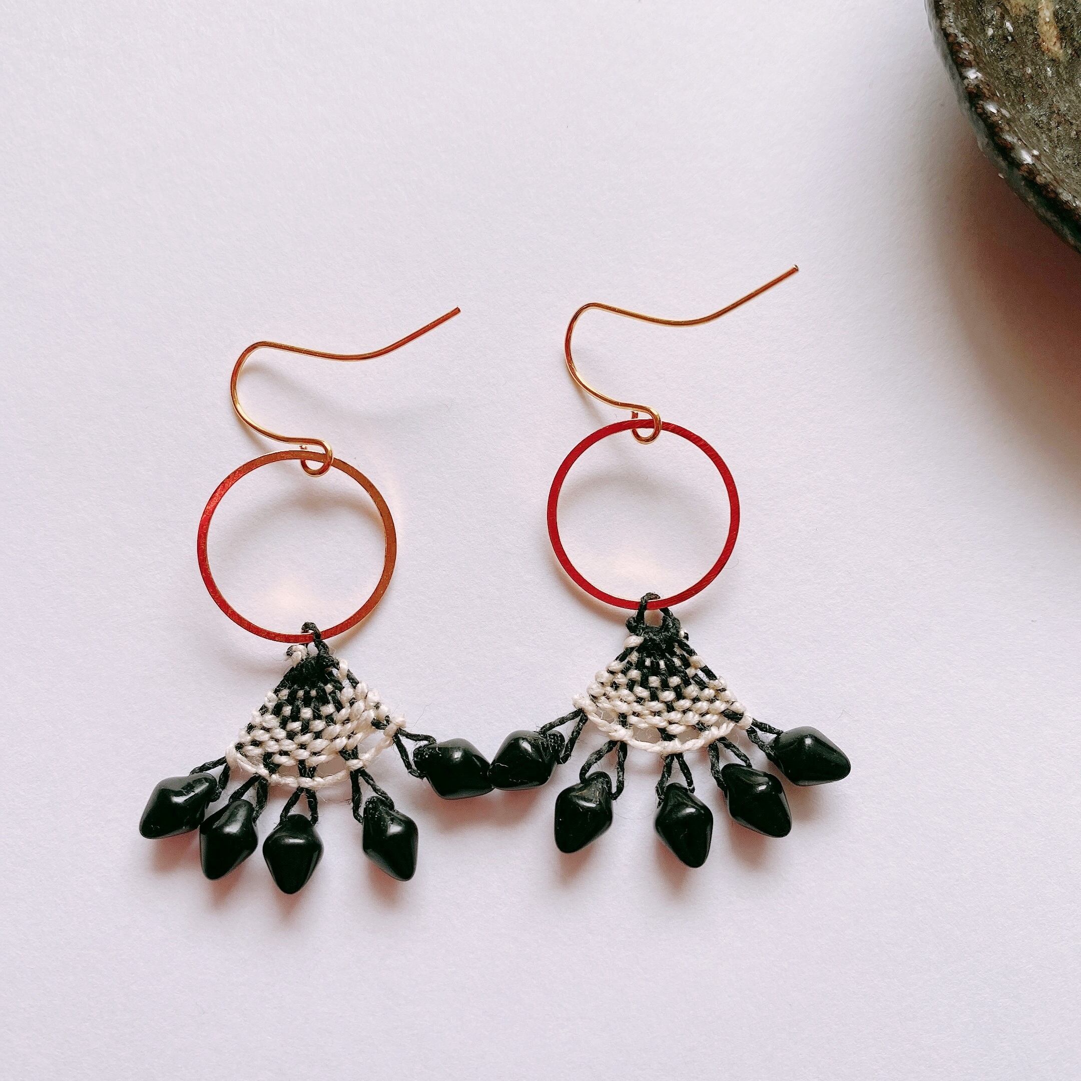 [材料ブラック・ホワイト刺繍糸・ダイヤ型大きめビーズ・ゴールド円形フープ・ピアス金具