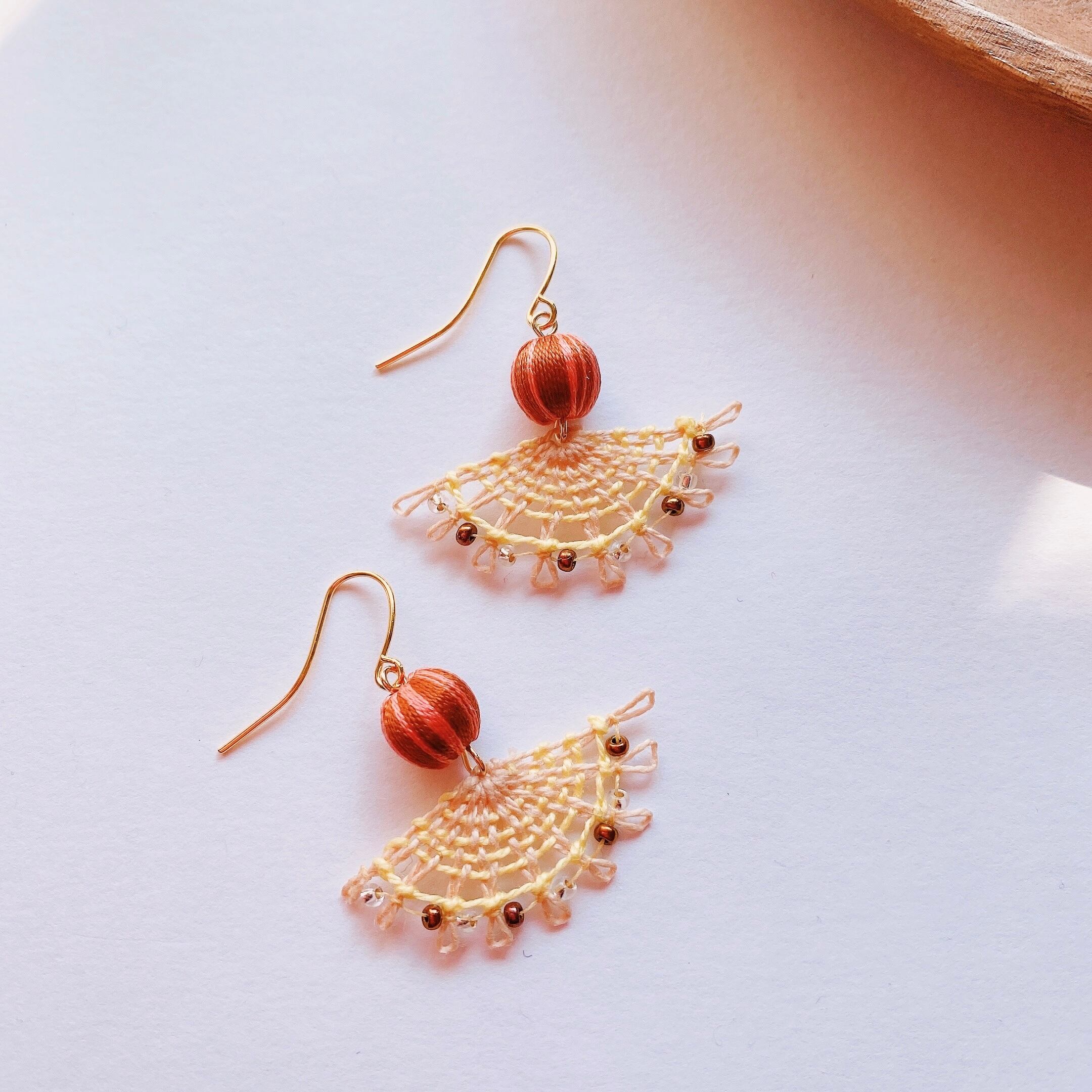 [材料] 薄いイエロー・ホワイト刺繍糸・絹糸を巻いた糸玉ビーズ・小粒ブラウンビーズ・ピアス金具