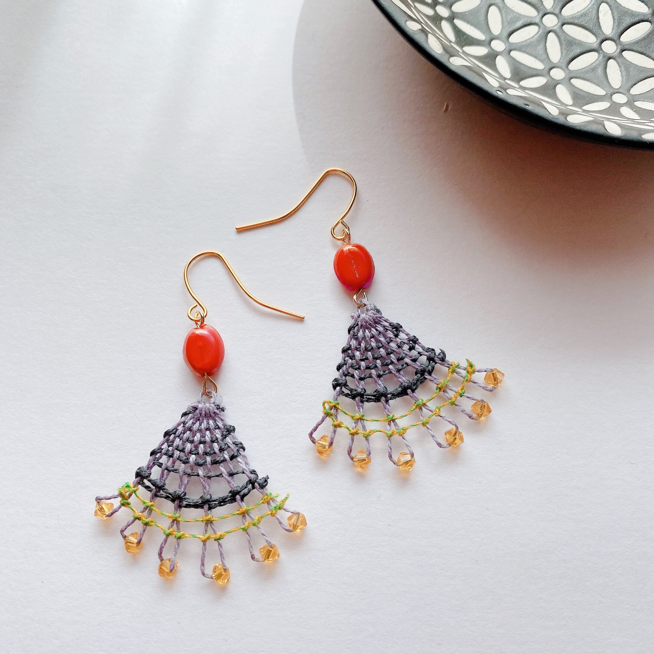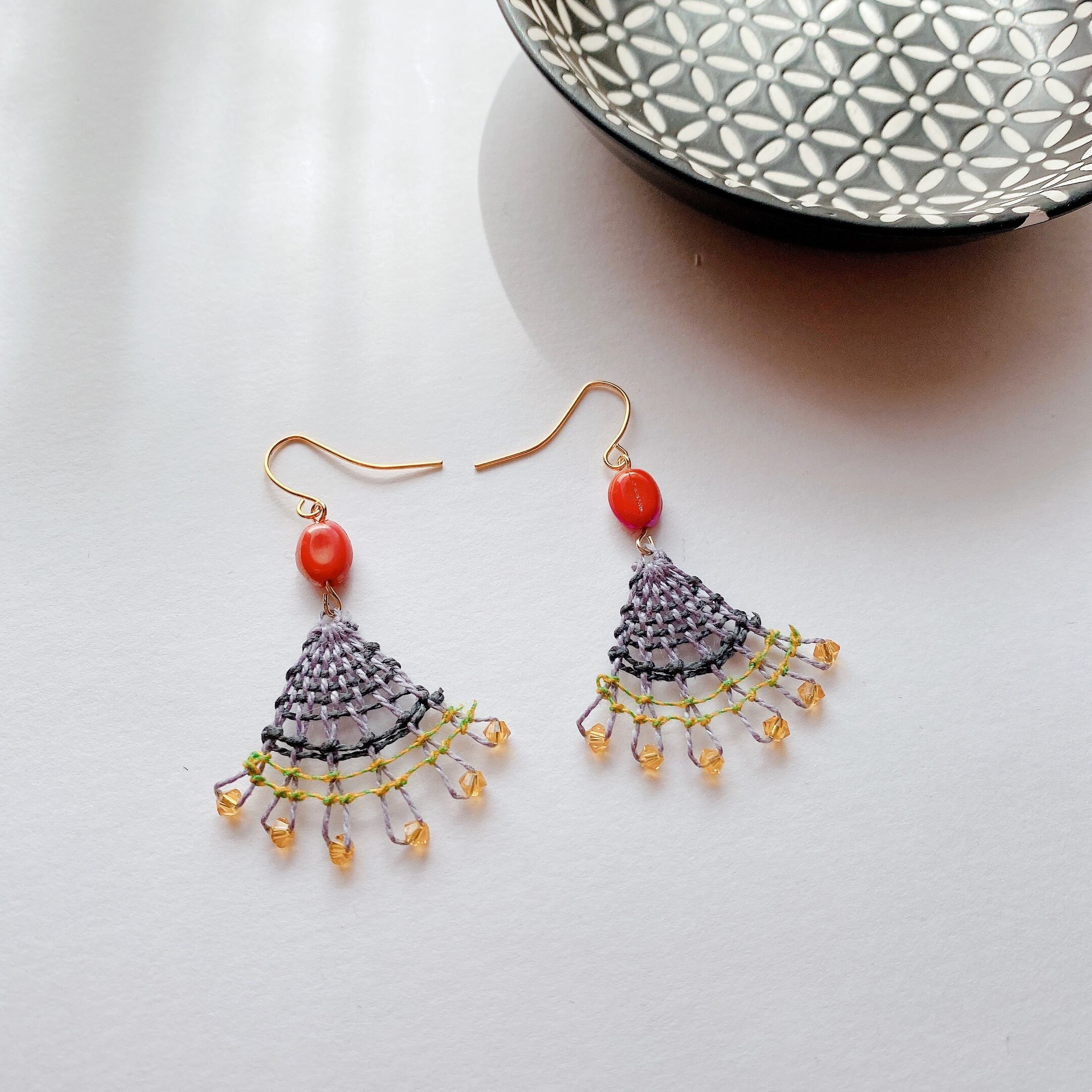 [材料] グレー・刺繍糸・スワロイエロービーズ・ビンテージ赤ビーズ・ピアス金具