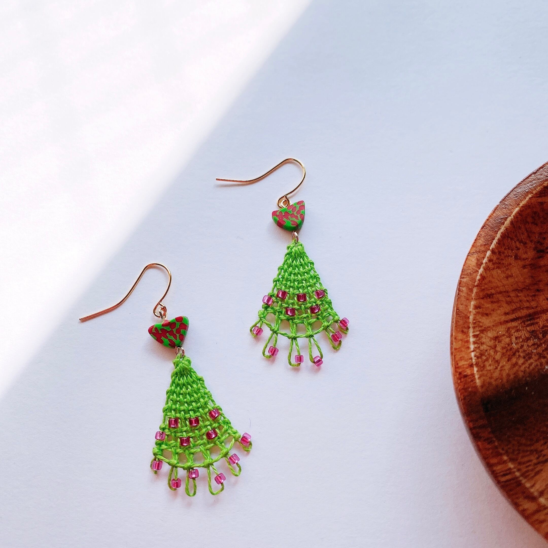 [材料] 明るめ緑色刺繍糸・ピンク色丸小ガラスビーズ・オリジナル樹脂ビーズ・ピアス金具