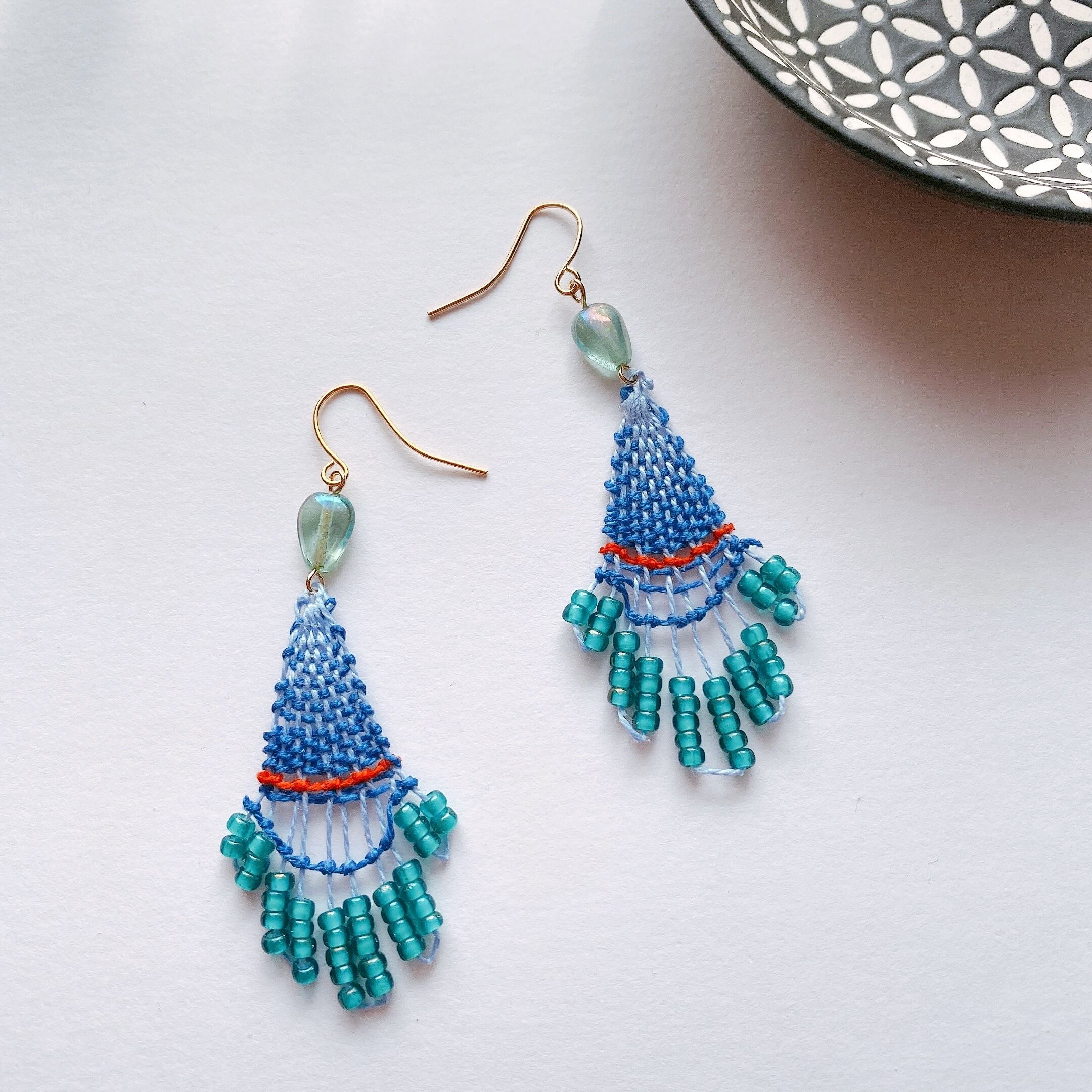 [材料] オレンジ・カーキ刺繍糸・吹きガラスのようなガラスビーズ・ピアス金具