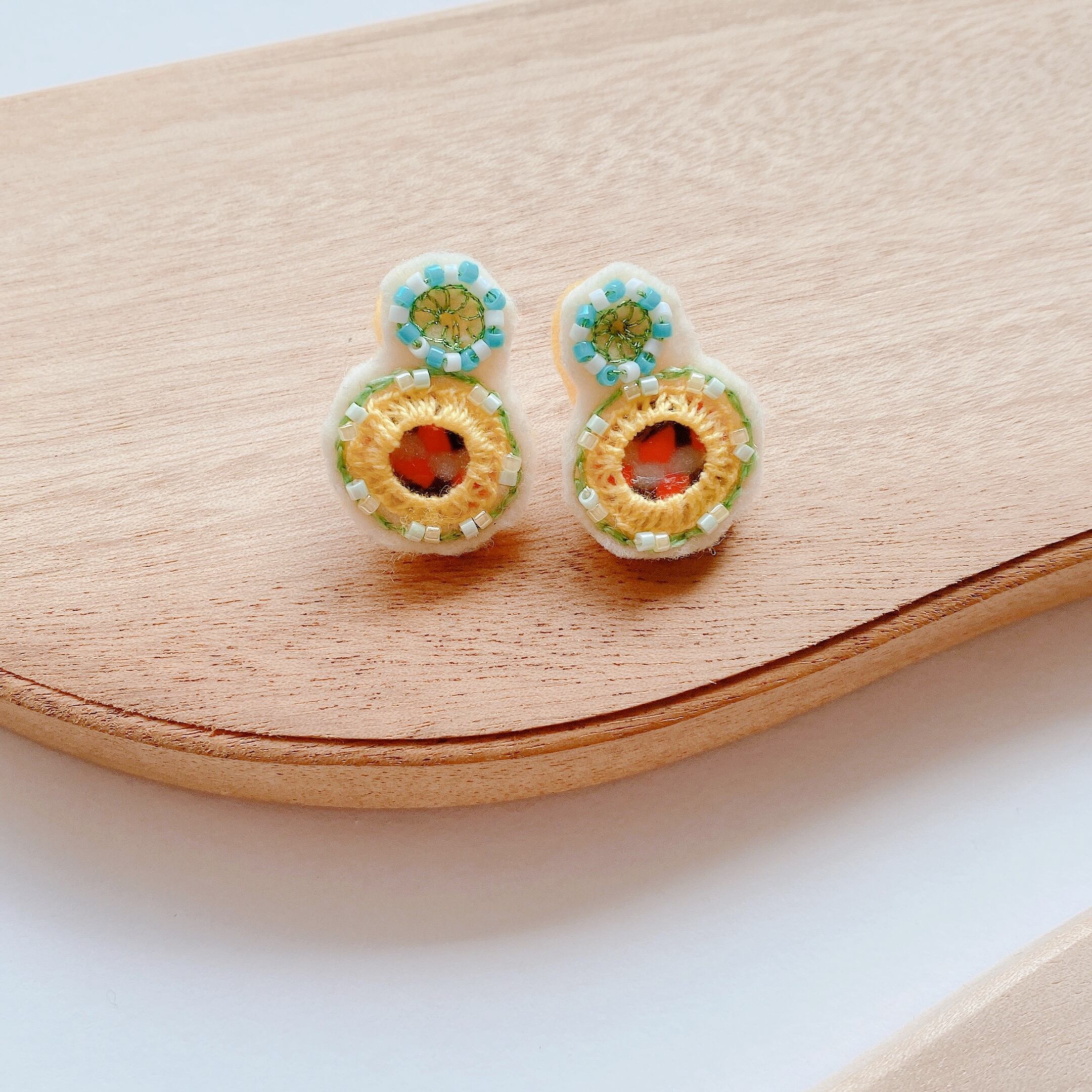 [材料] 黄色刺繍糸・丸小ビーズ・樹脂チップ・2mm厚手フェルト・ピアス金具