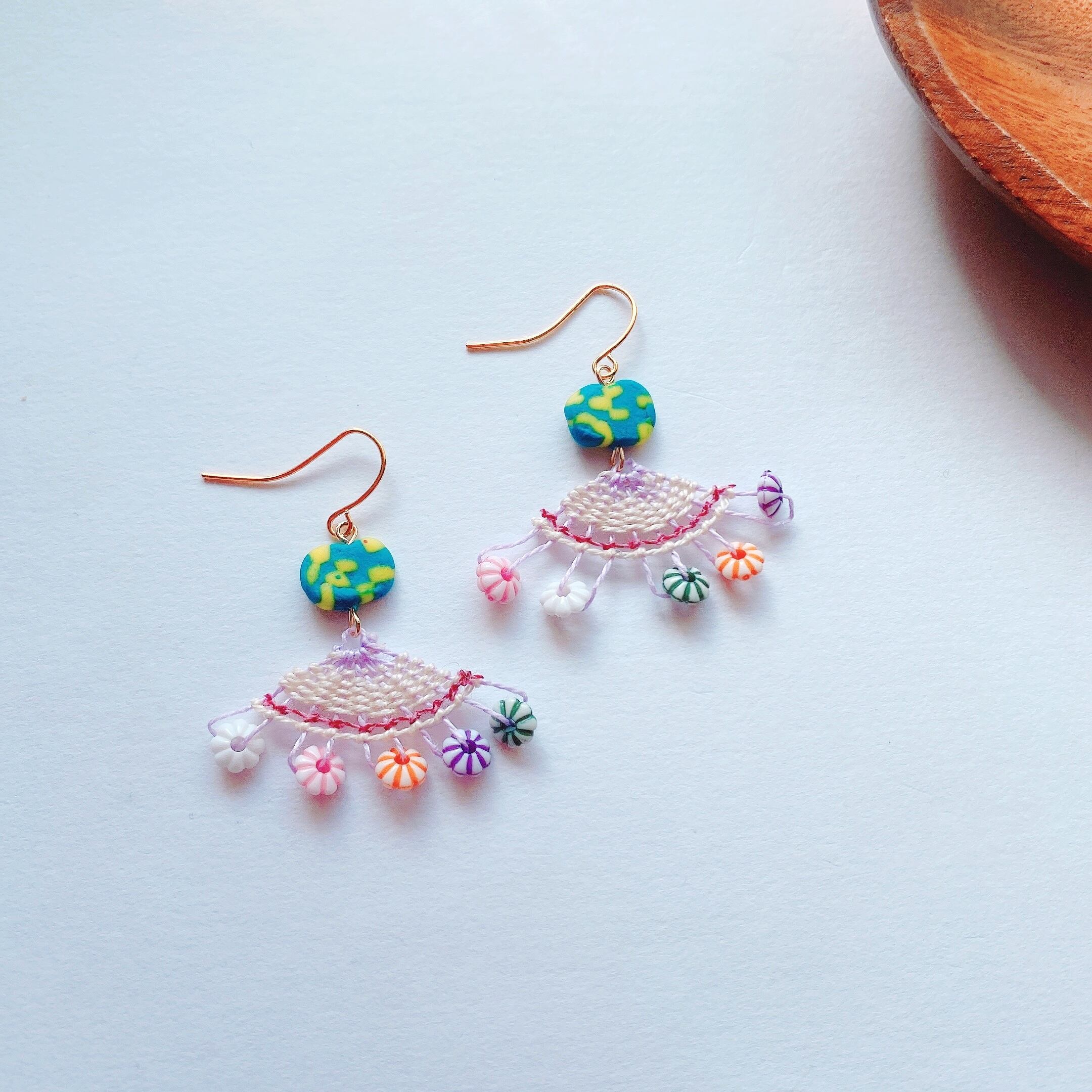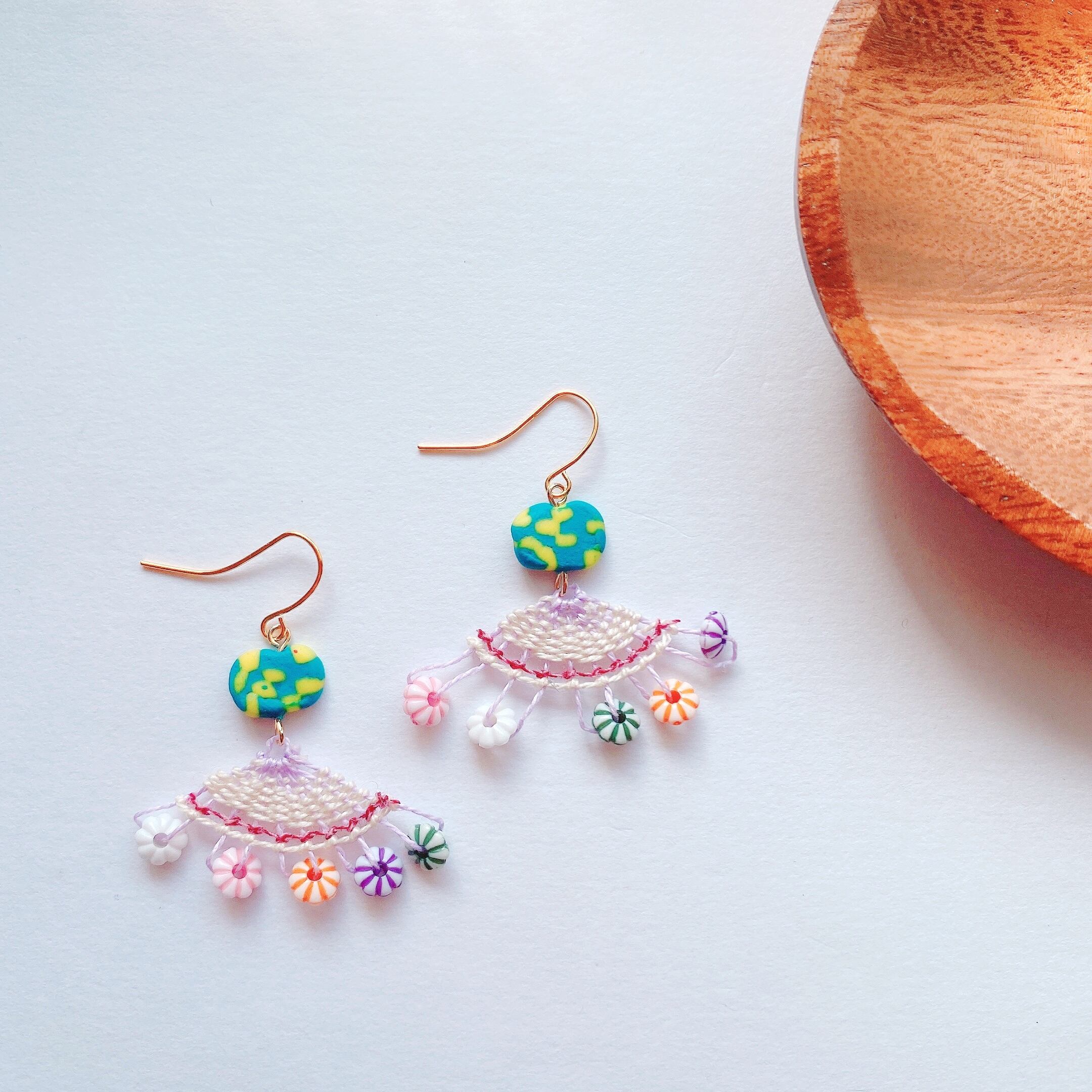 [材料] うすい紫・白刺繍糸・にしきいと(シルバー)・樹脂ビーズ・ピアス金具
