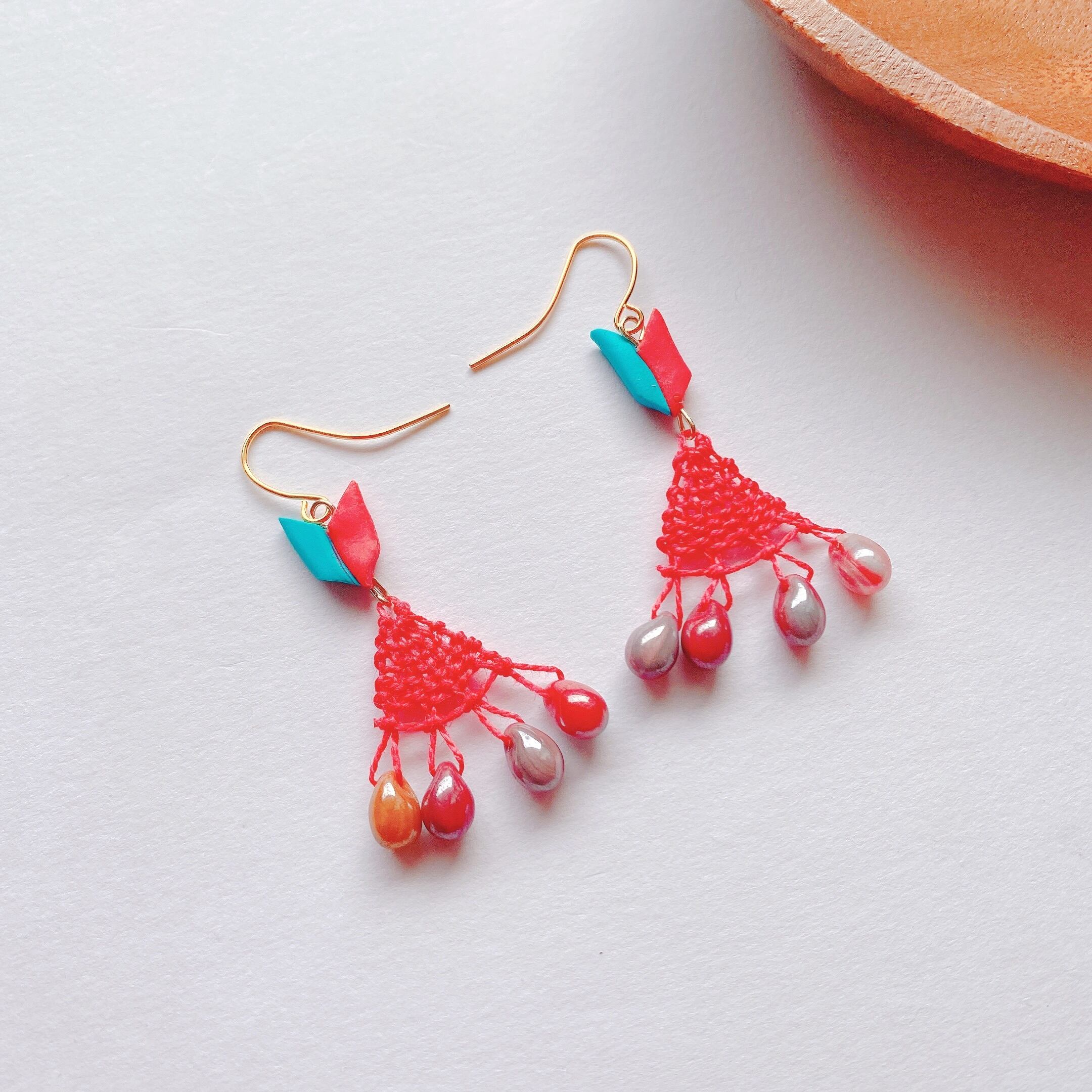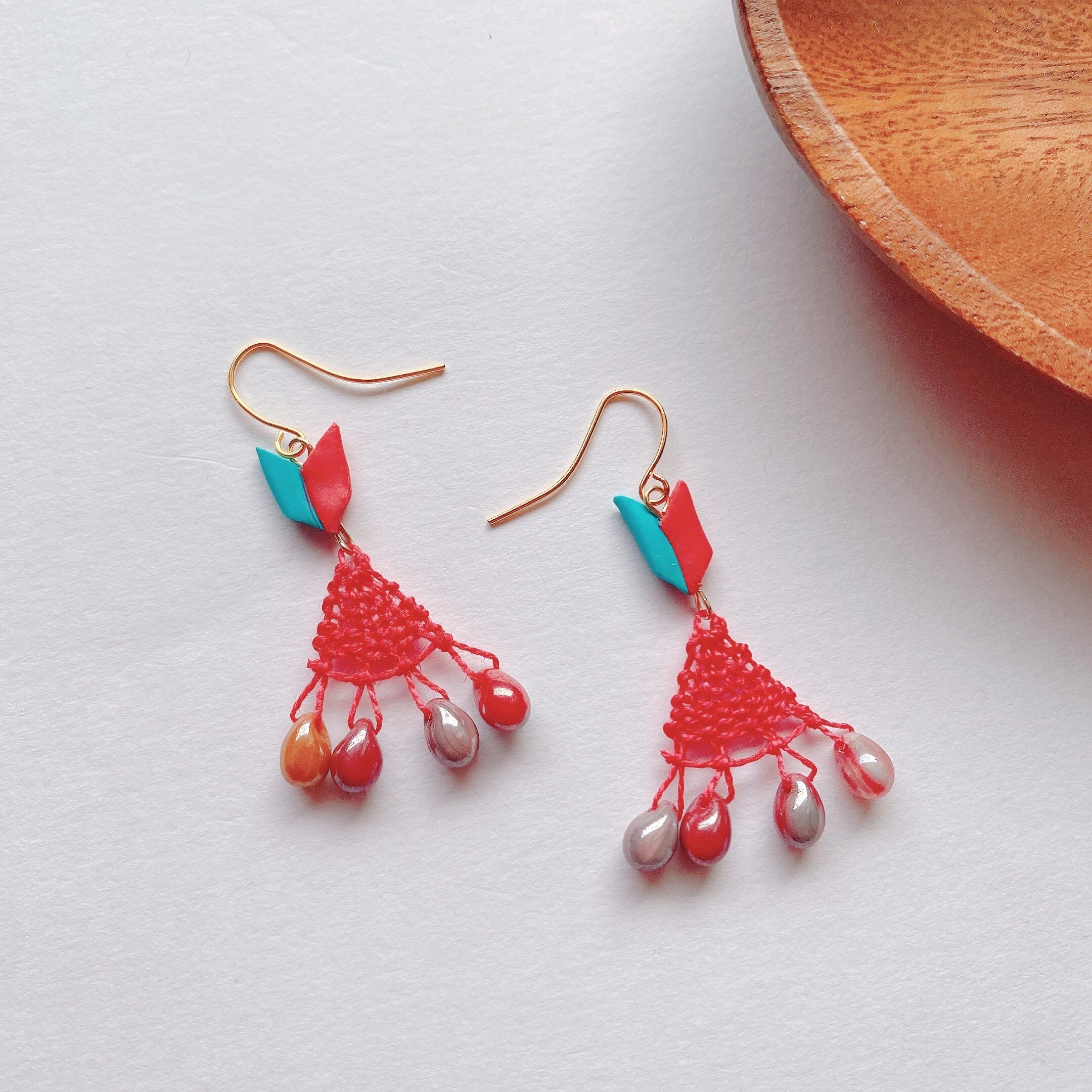 [材料] 赤刺繍糸・しずく型ビーズ・オリジナル樹脂ビーズ・ピアス金具