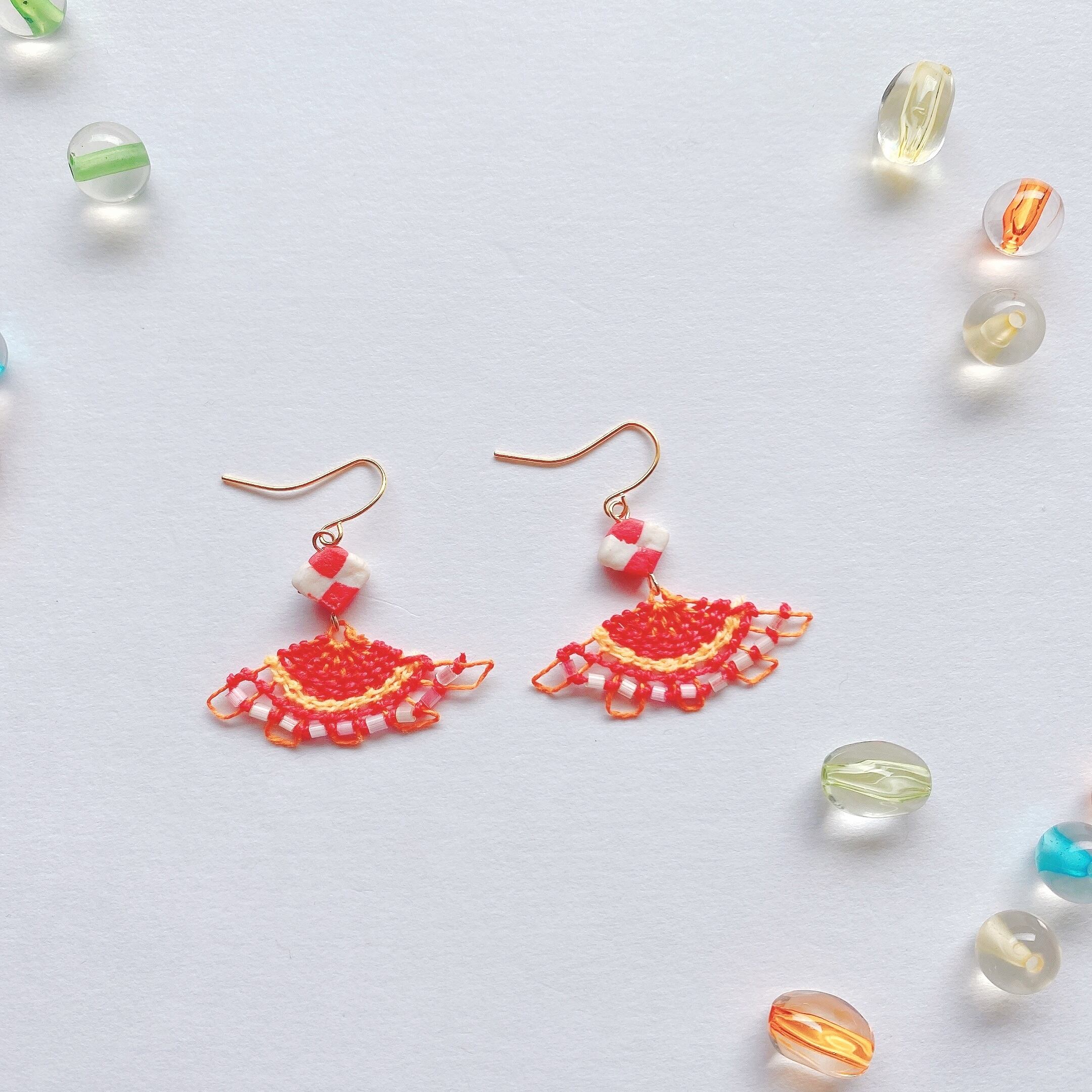 [材料] 赤/・黄色刺繍糸・四角くカットしたガラスビーズ・オリジナル樹脂ビーズ・ピアス金具