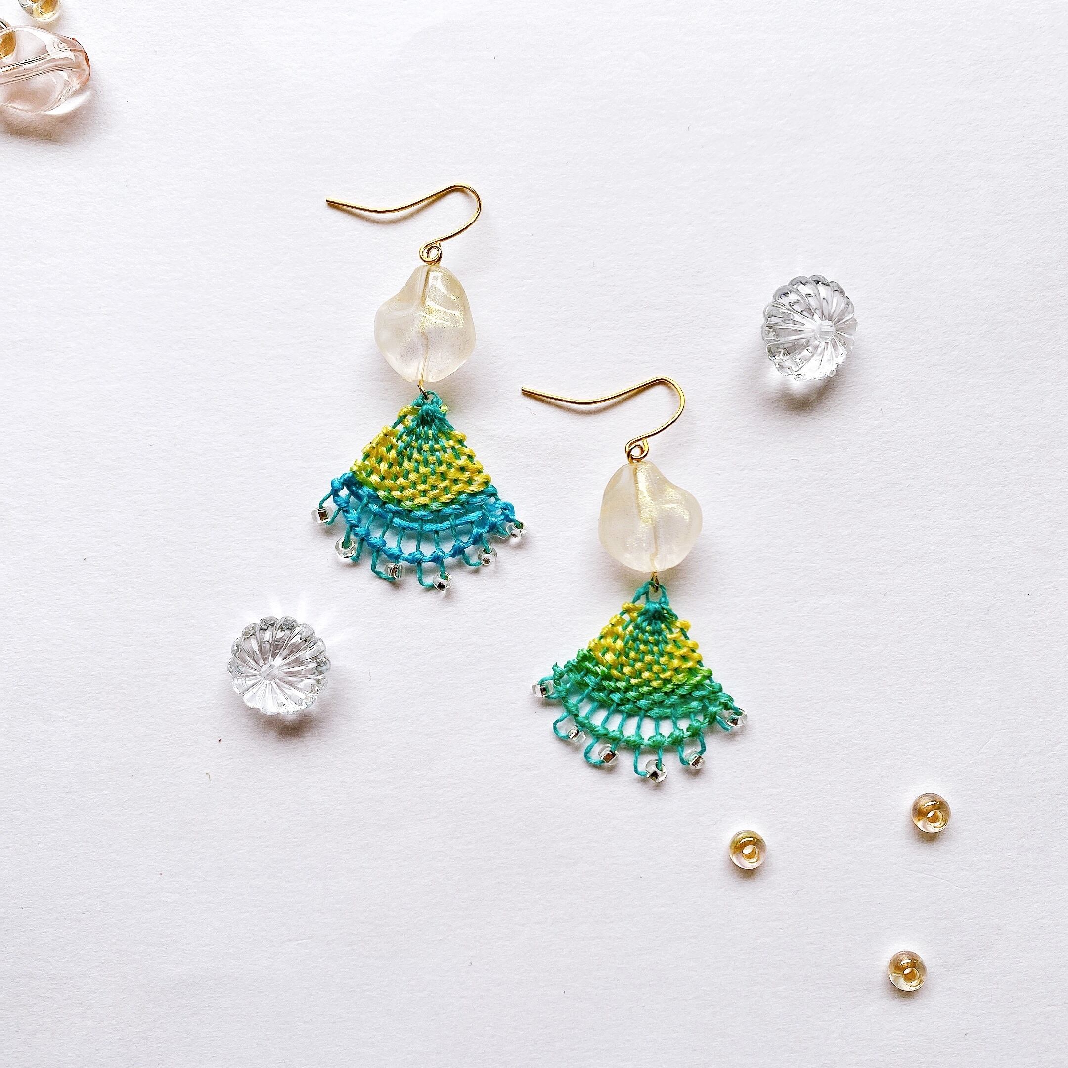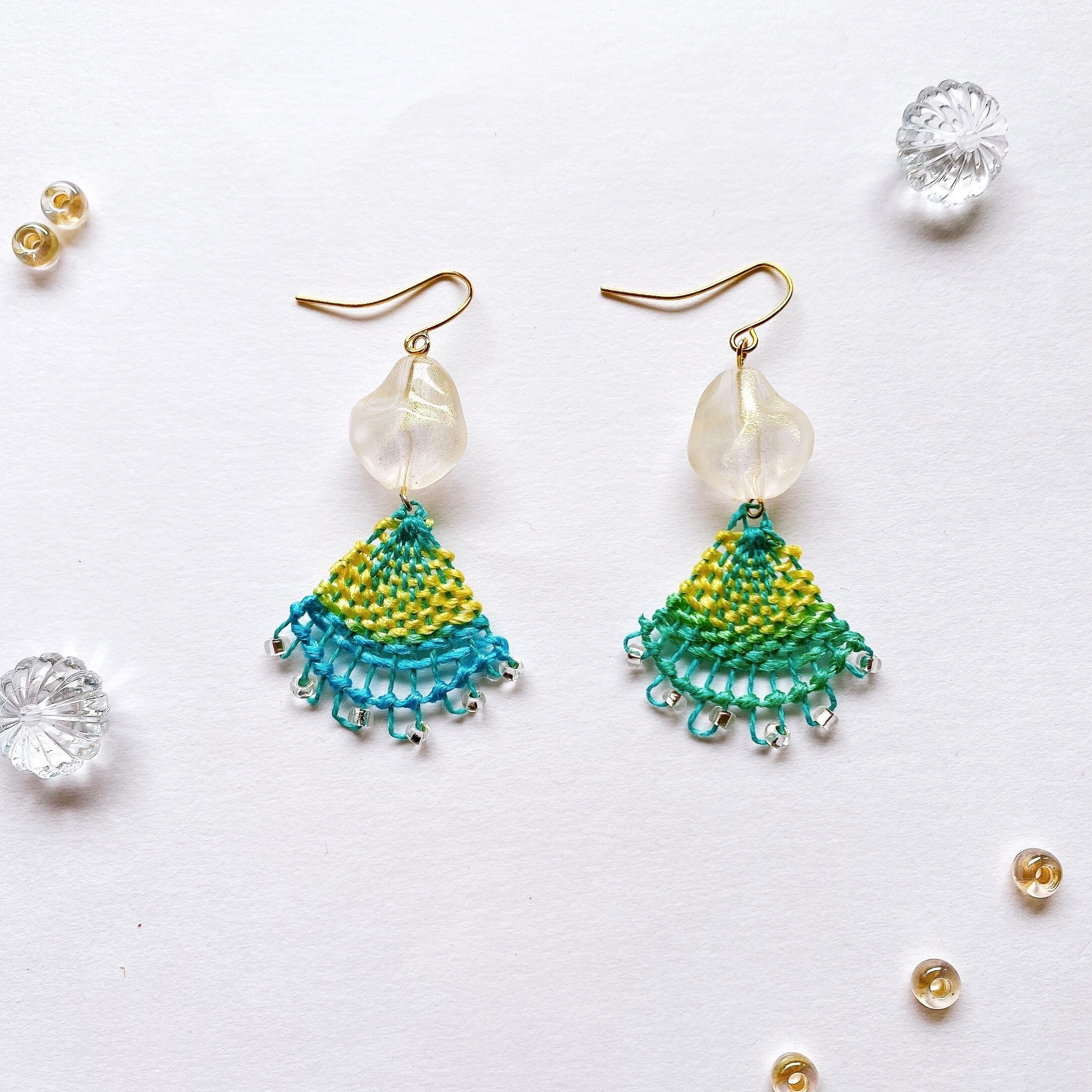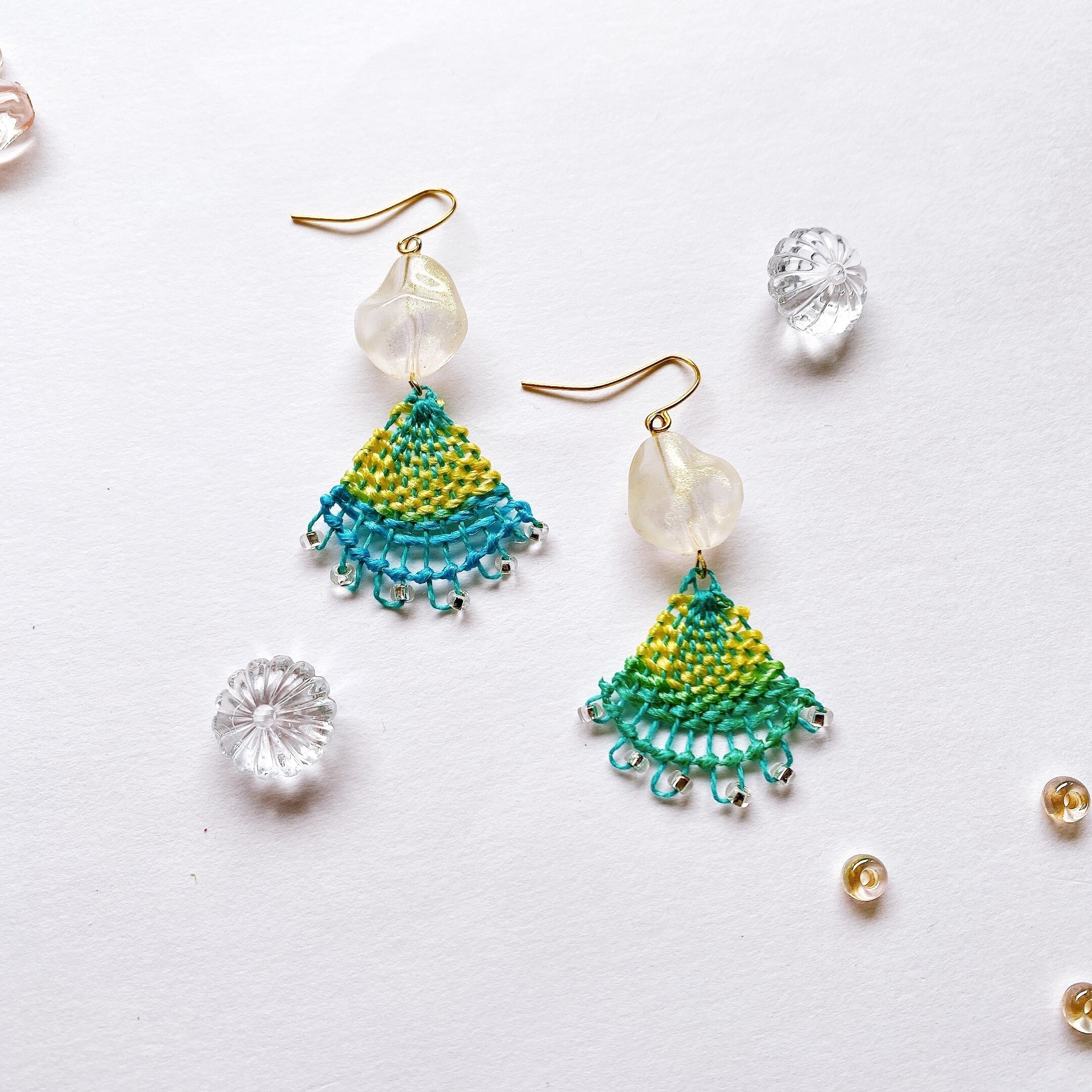 [材料]  翡翠色刺繍糸・手染めシルク糸・氷のようなアクリルビーズ・ピアス金具