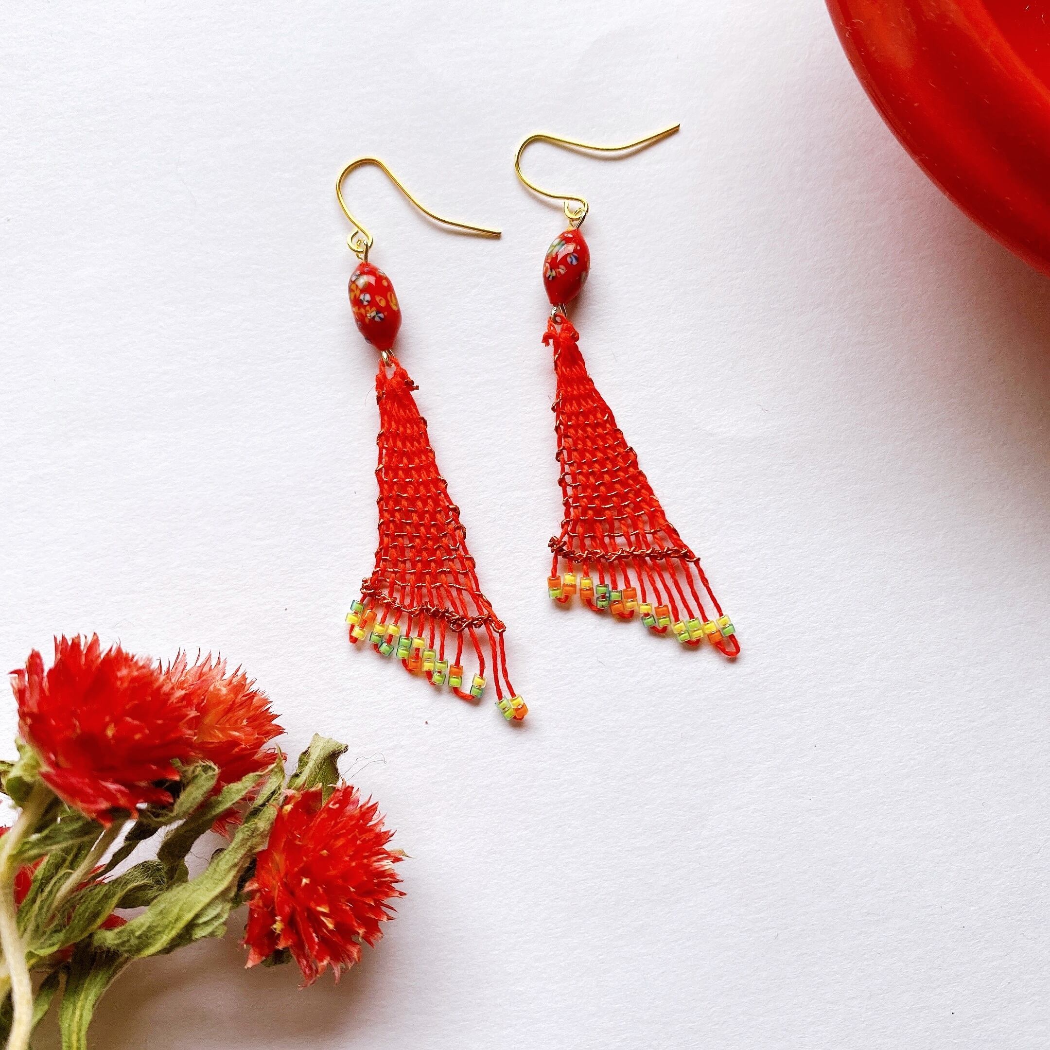 [材料]  翡翠色刺繍糸・手染めシルク糸・氷のようなアクリルビーズ・ピアス金具