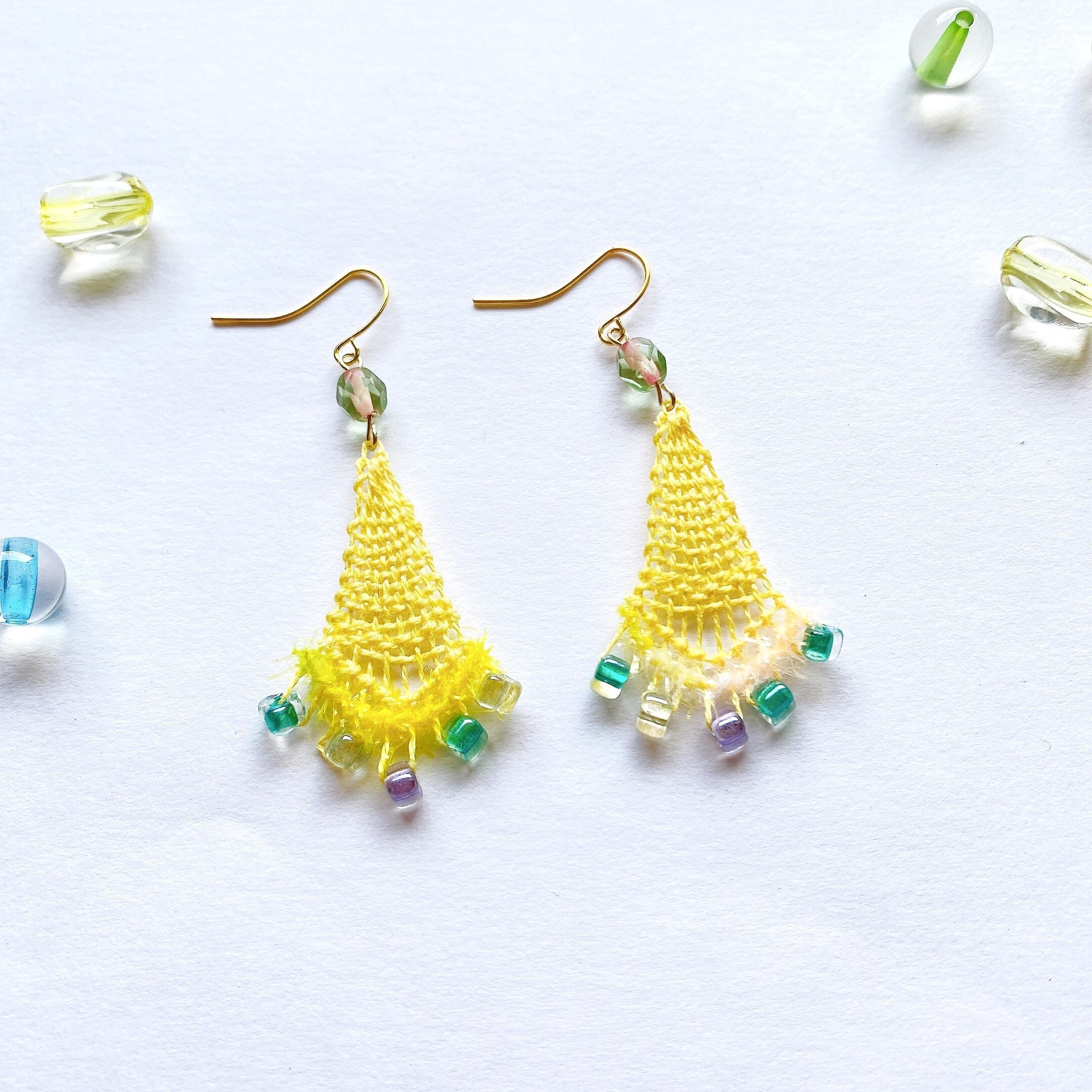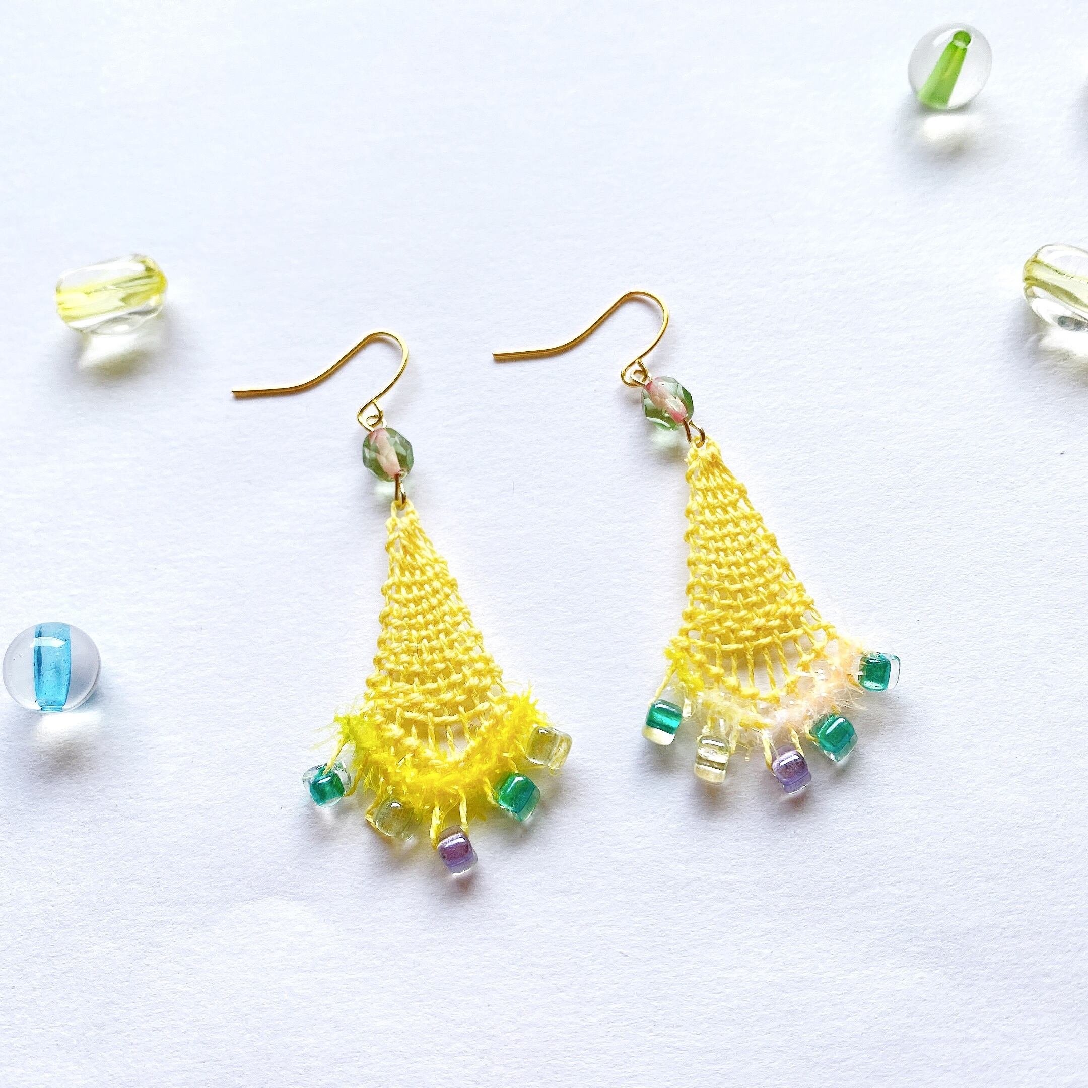 [材料]  黄色DMC糸・キラキラとした糸・ガラスビーズ・ピアス金具