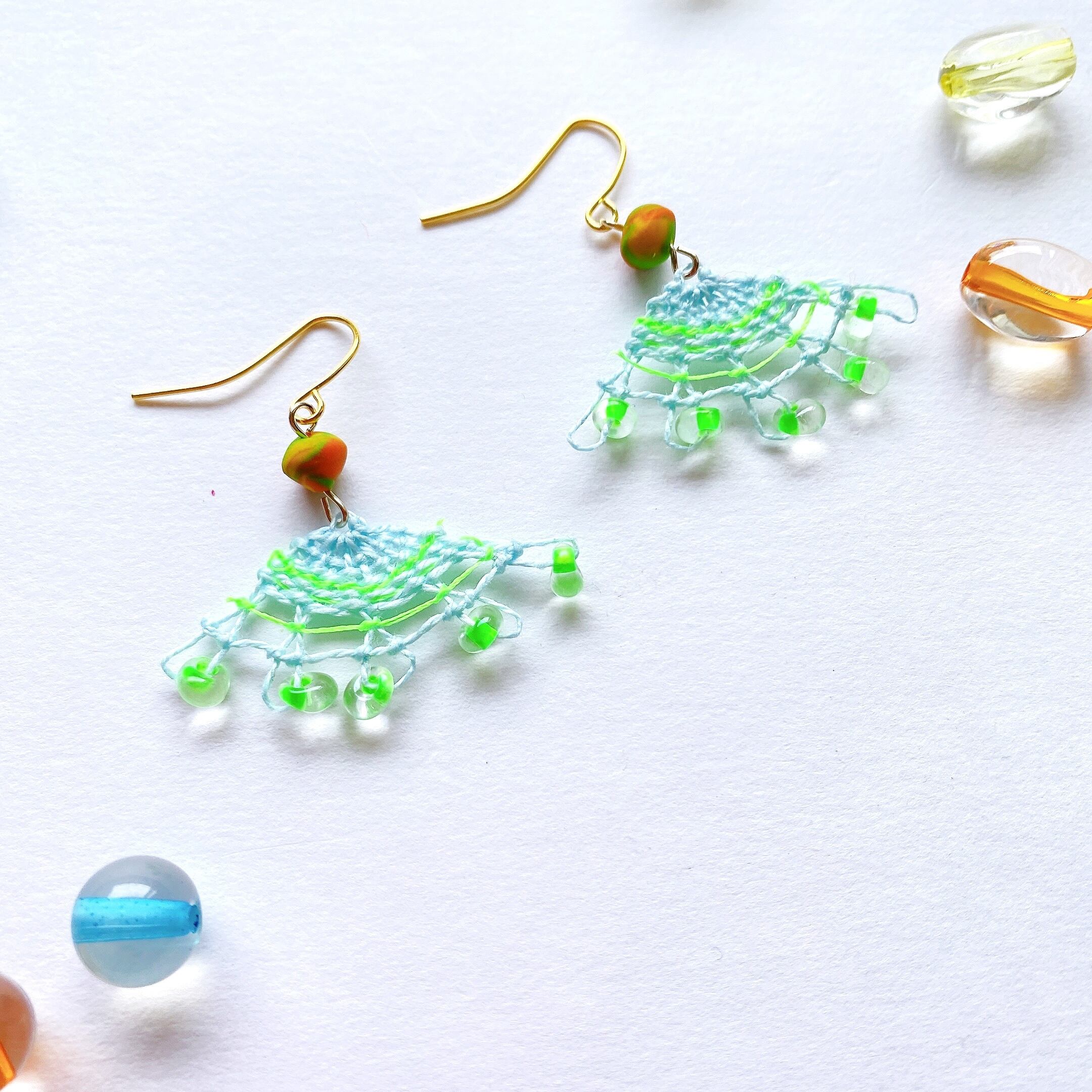[材料]  薄い青色DMC糸・蛍光色糸・アクセントカラー付きガラスビーズ・オリジナル樹脂ビーズ・ピアス金具