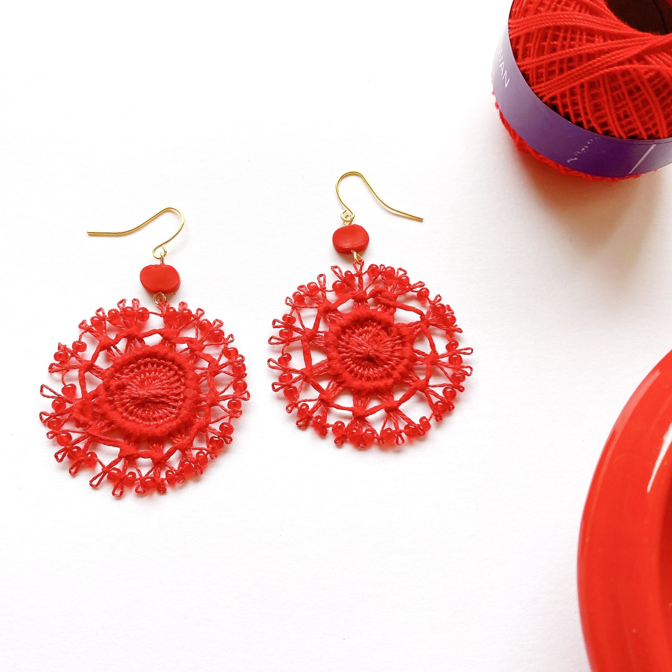 [材料]  DMC糸・  太めの赤綿糸・ オリジナル樹脂ビーズ・ピアス金具