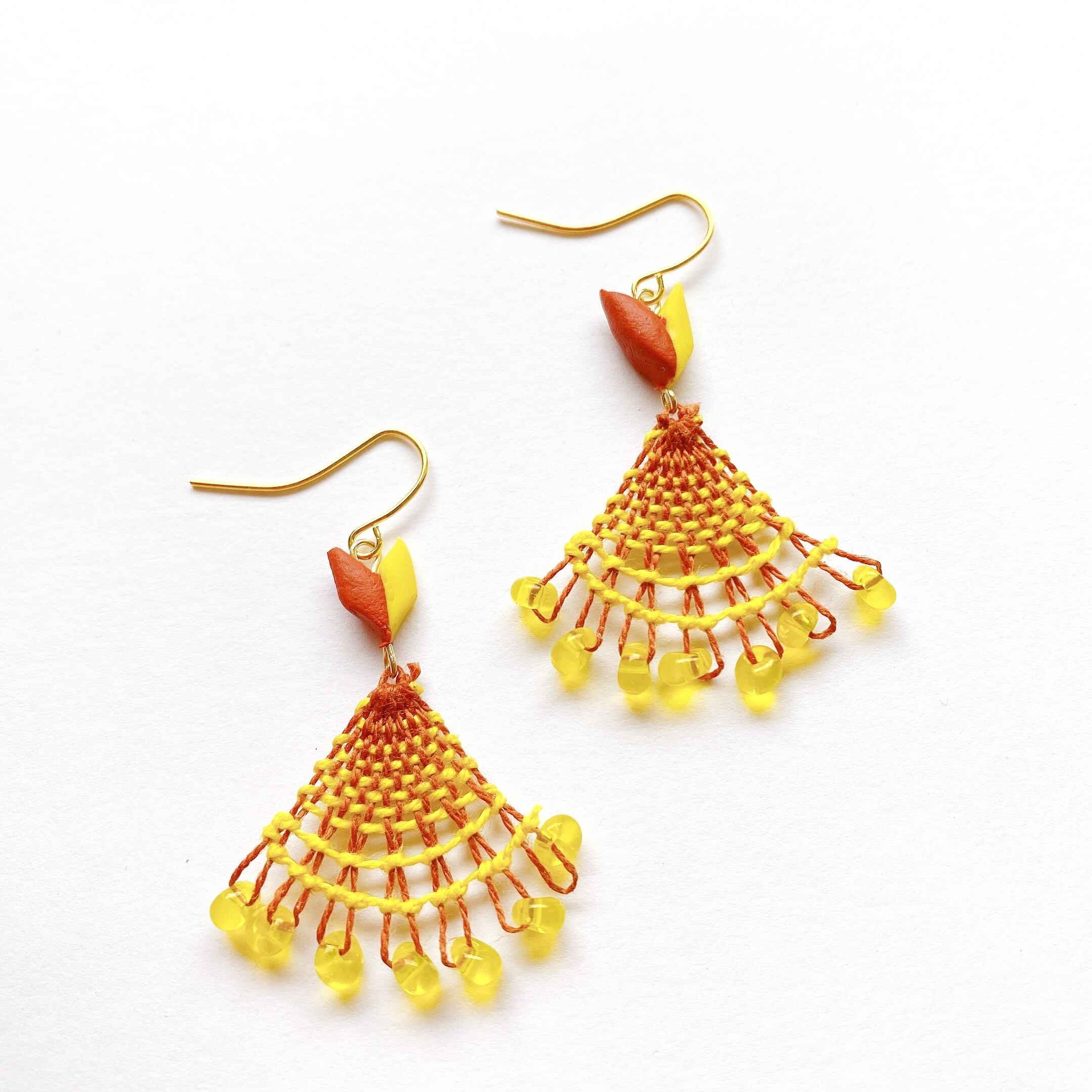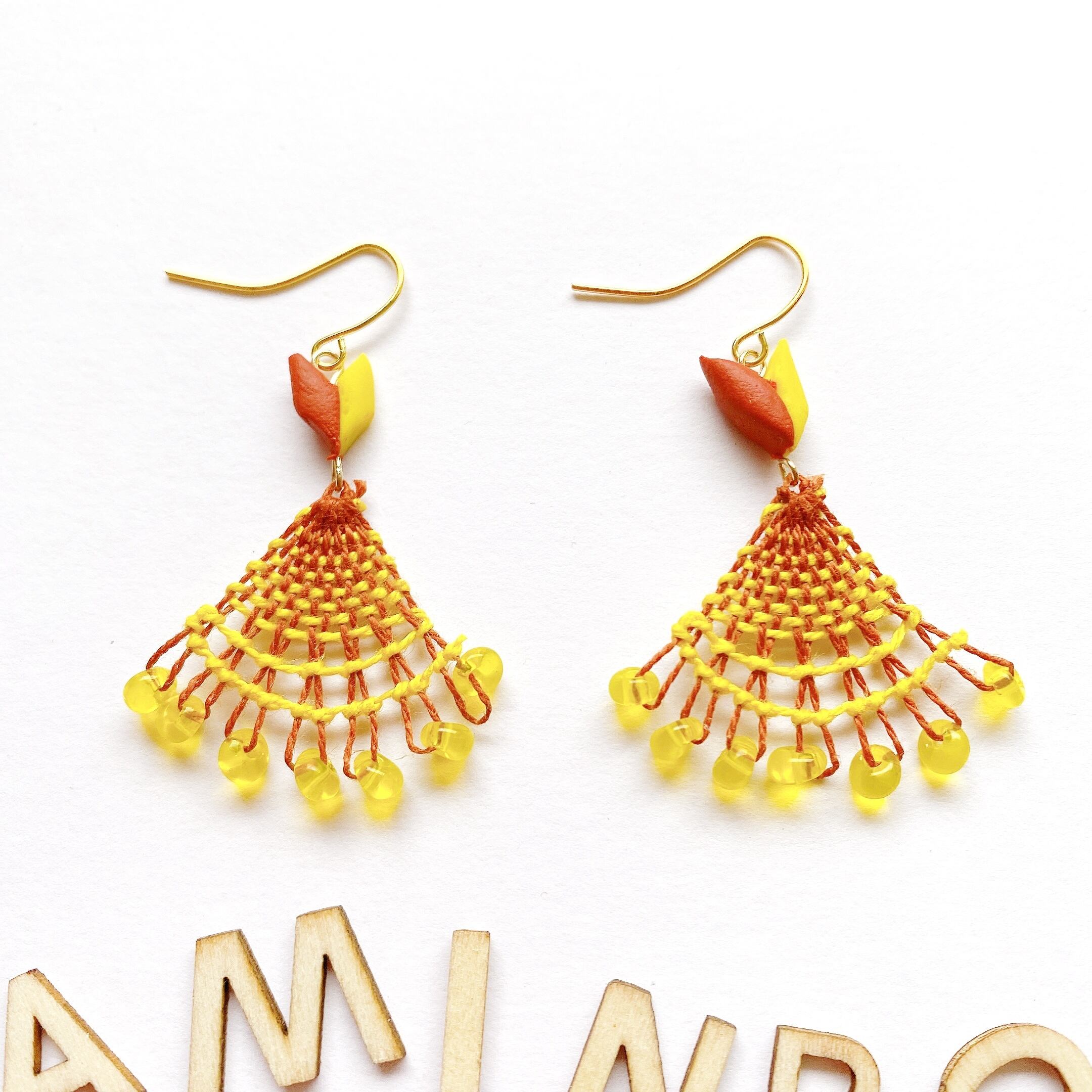 [材料]  DMC黄色・茶色糸・ オリジナル樹脂ビーズ・ピアス金具