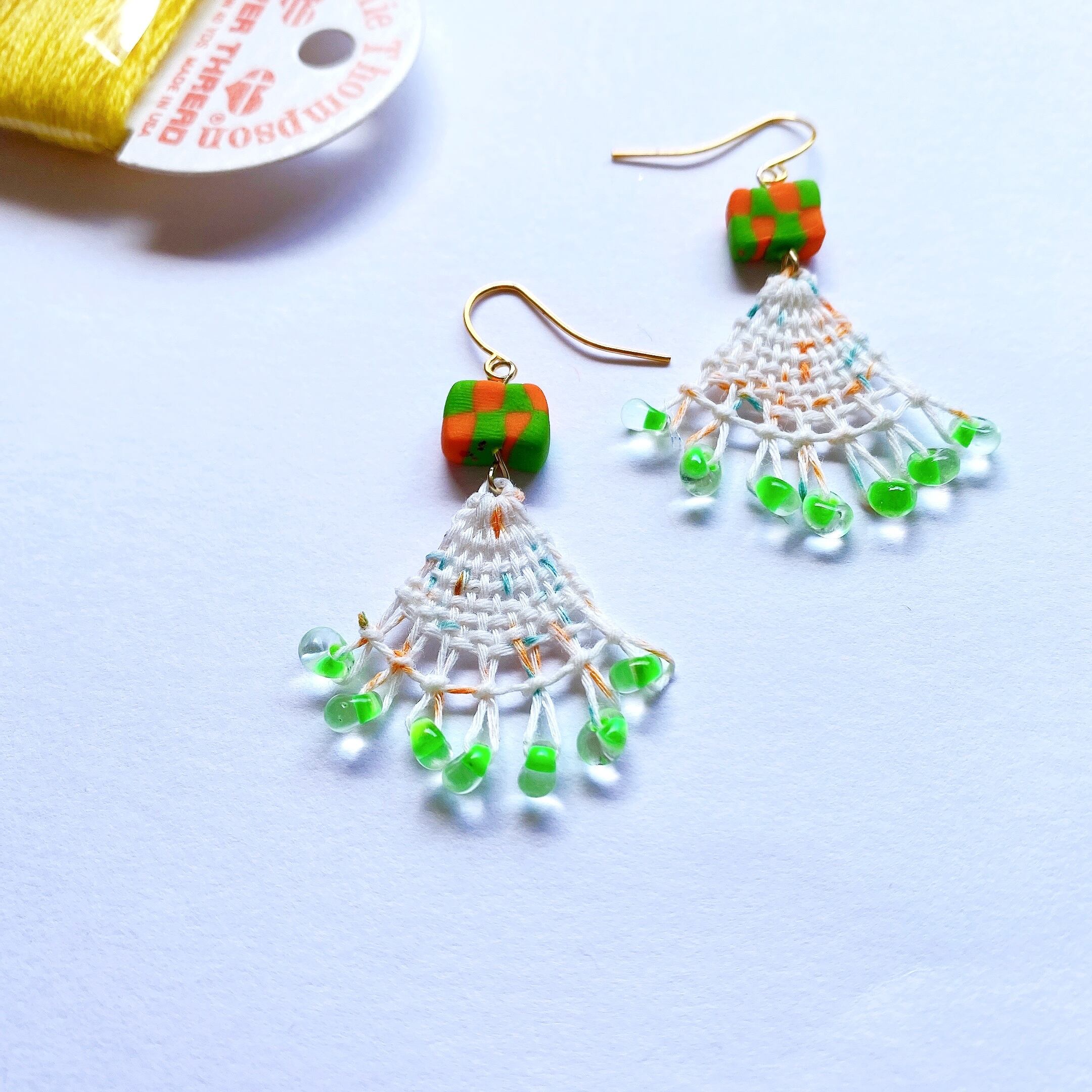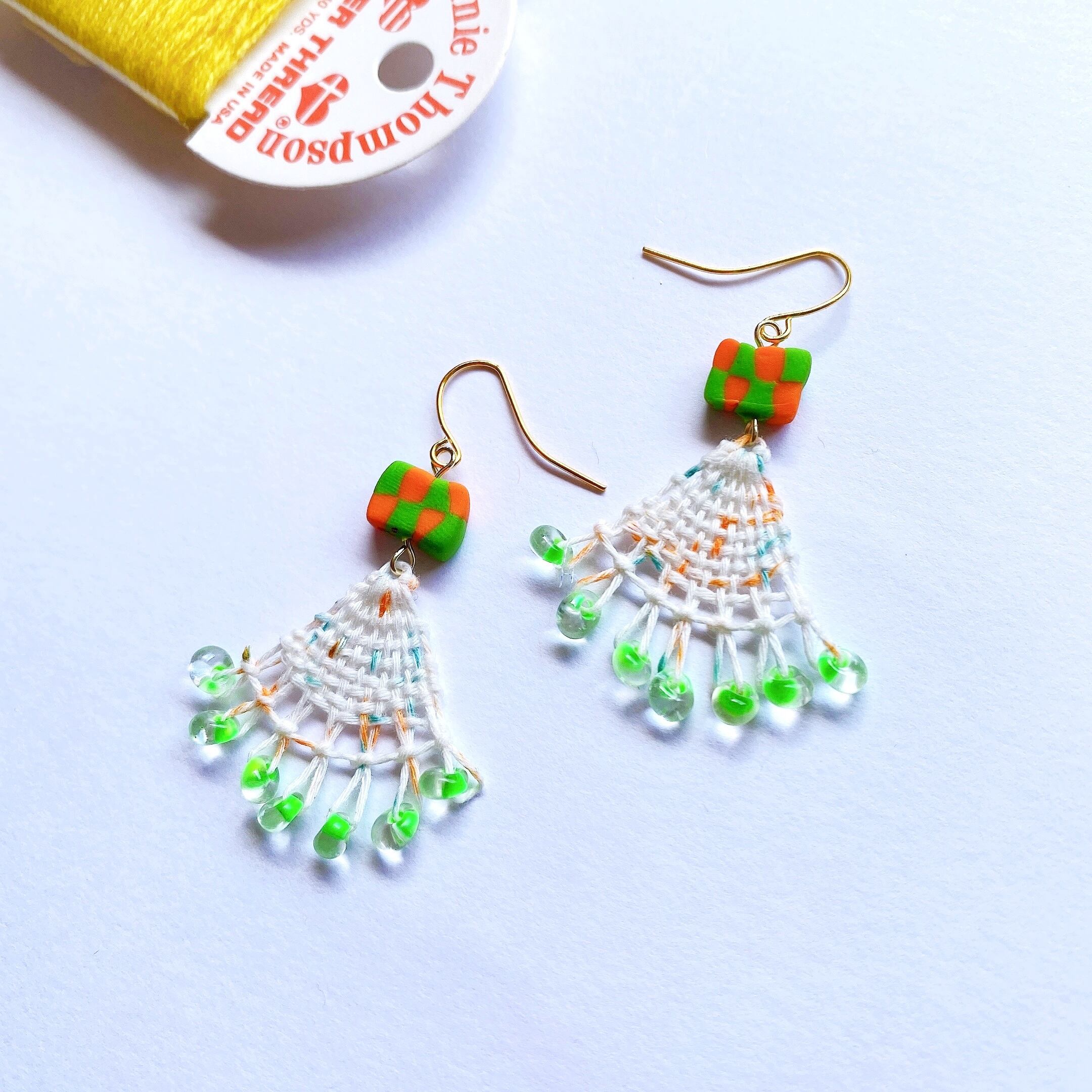 [材料]   白&オレンジ糸・ ネオンガラスビーズ・ オリジナル樹脂ビーズ・ピアス金具