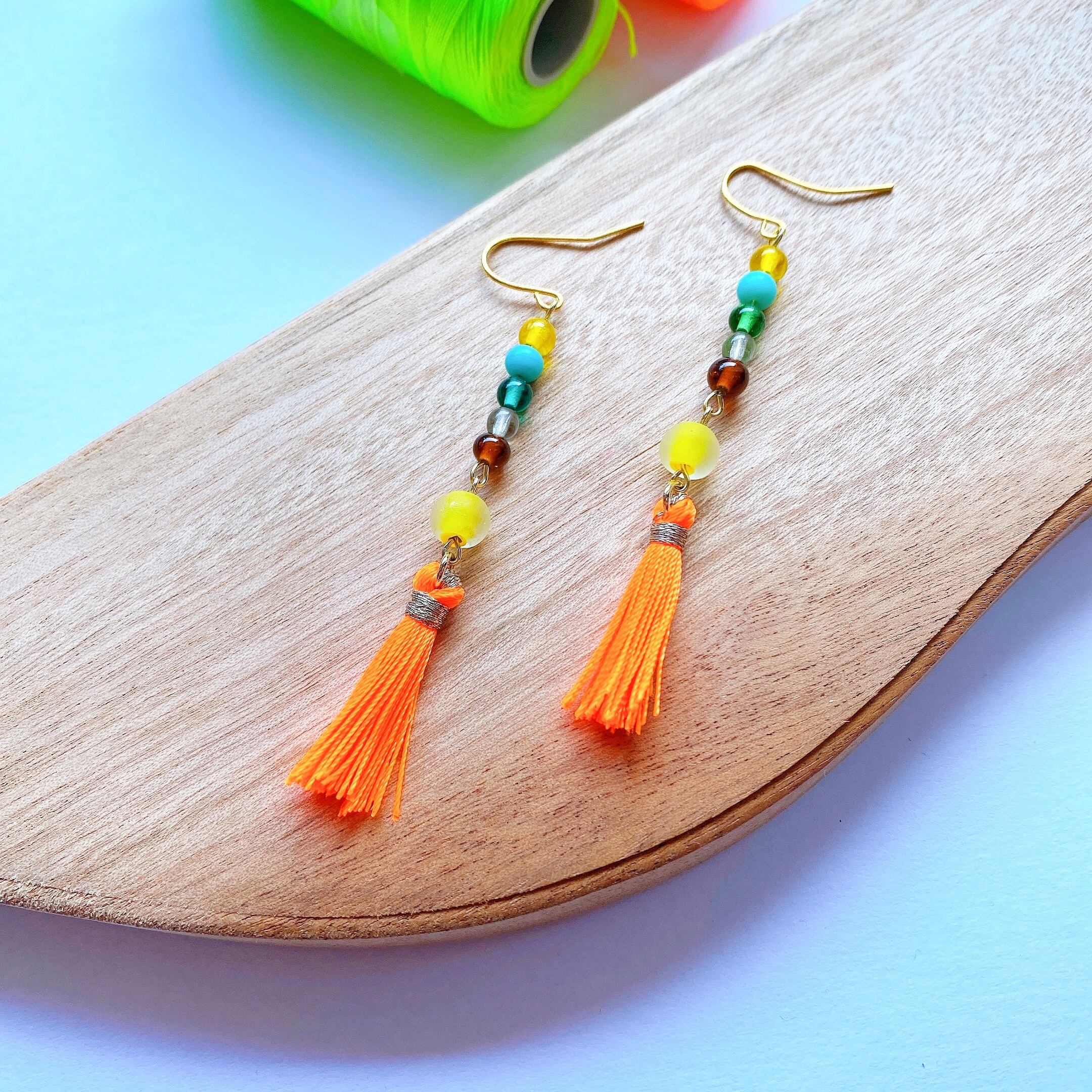 パキッとオレンジの香りがしてきそうな、ネオンカラーのタッセルとインドビーズを合わせました。