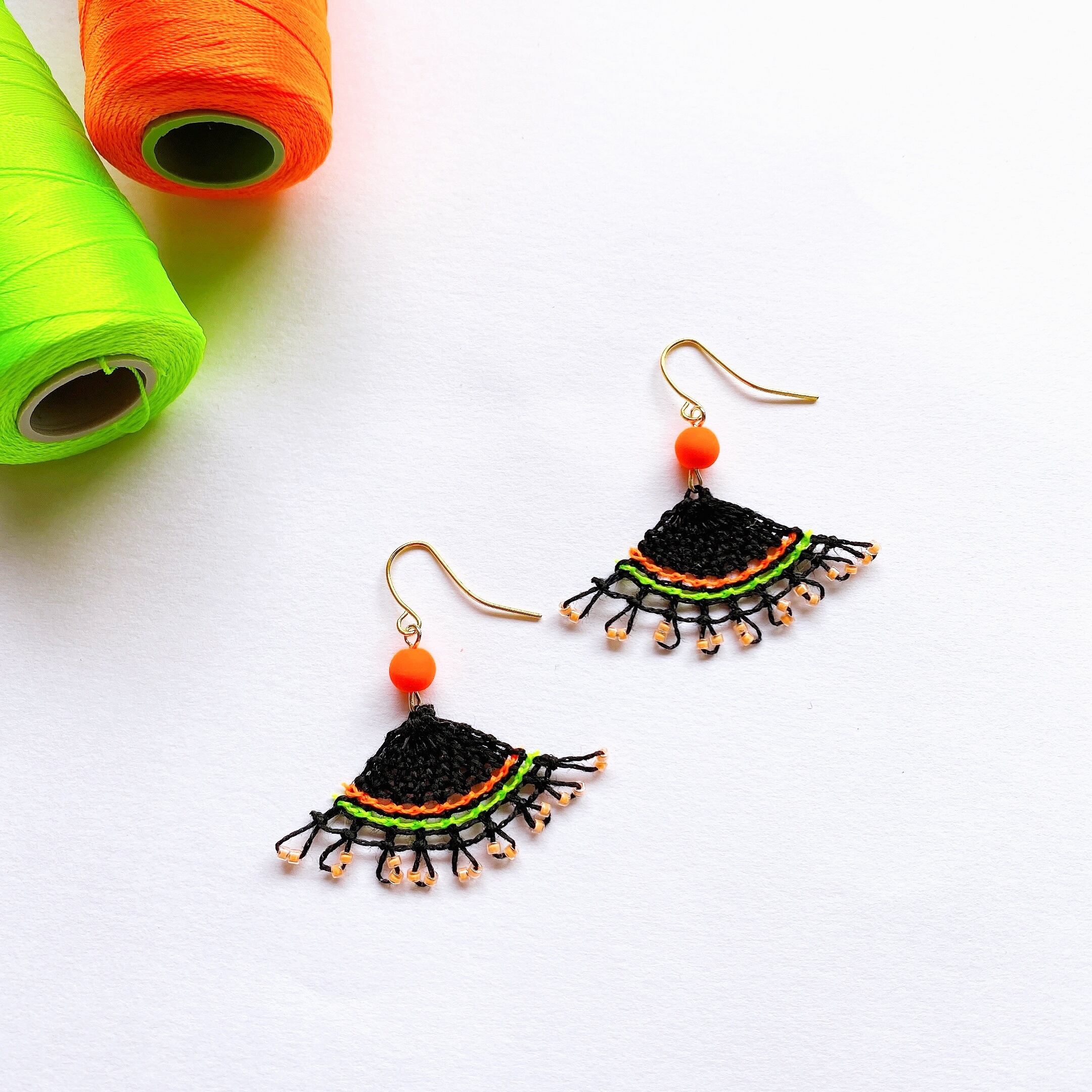 [材料]   黒・ネオンカラー細糸・ ネオンガラスビーズ・ オレンジビーズ・ピアス金具