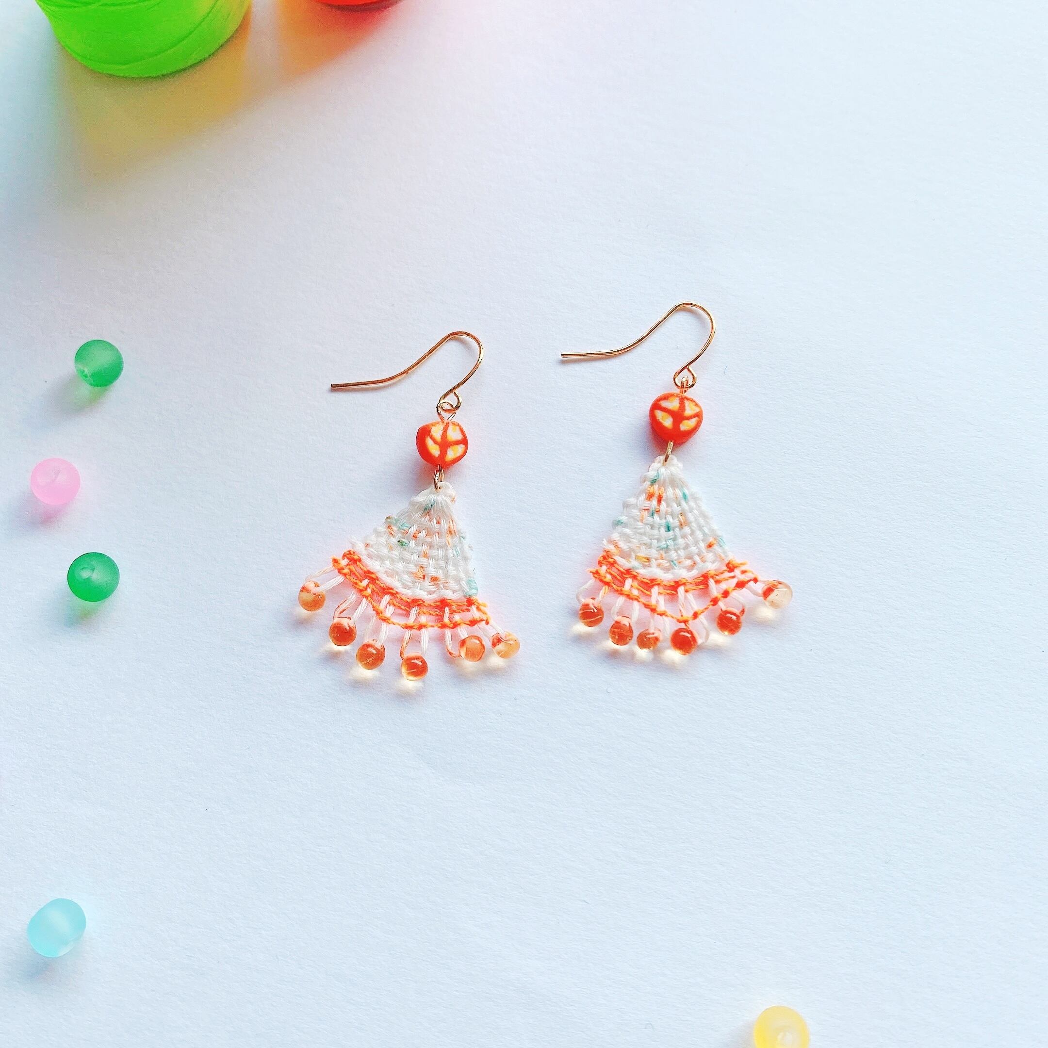 [材料]  ホワイトベースオレンジ色糸・ ネオンオレンジ・ ネオンビーズ・ オリジナル樹脂ビーズ・ピアス金具