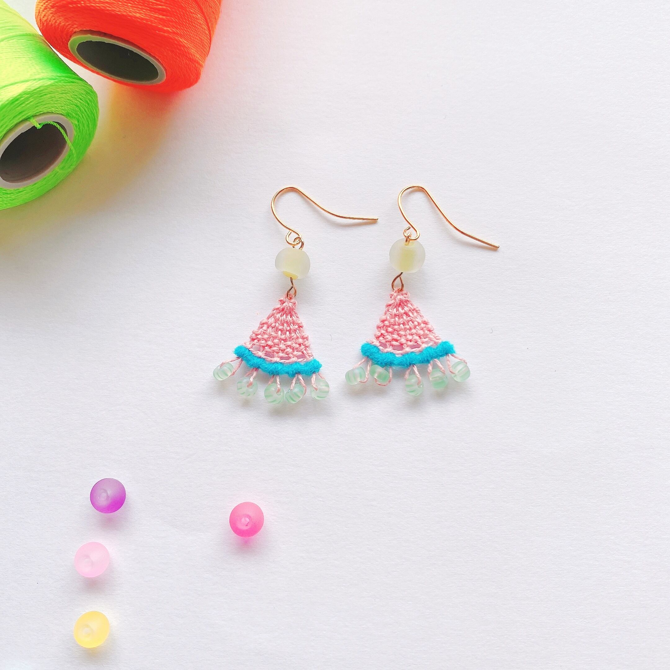 [材料]   薄いイエロー色糸・ ネオンガラスビーズ・  ネオンイエロー糸・ピアス金具