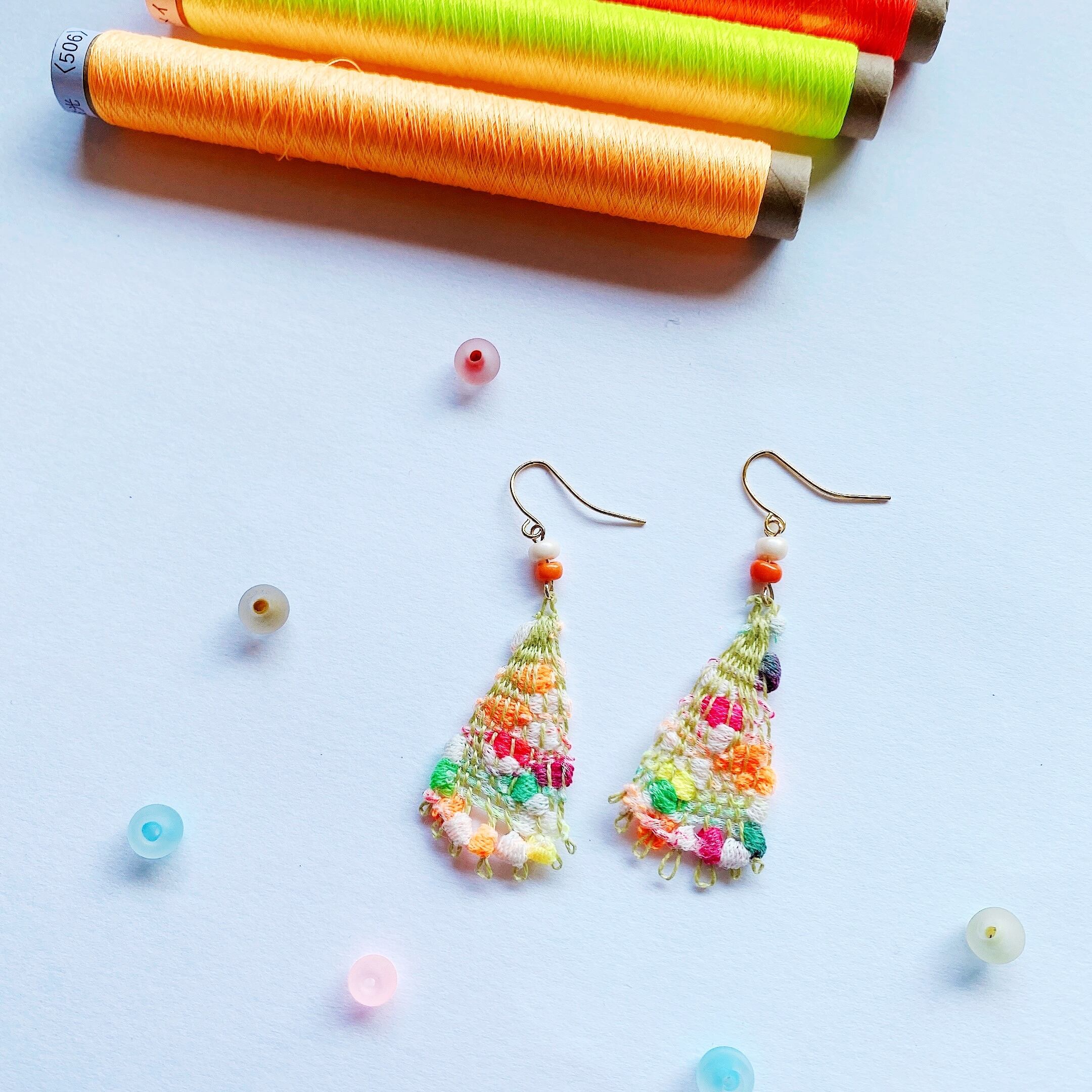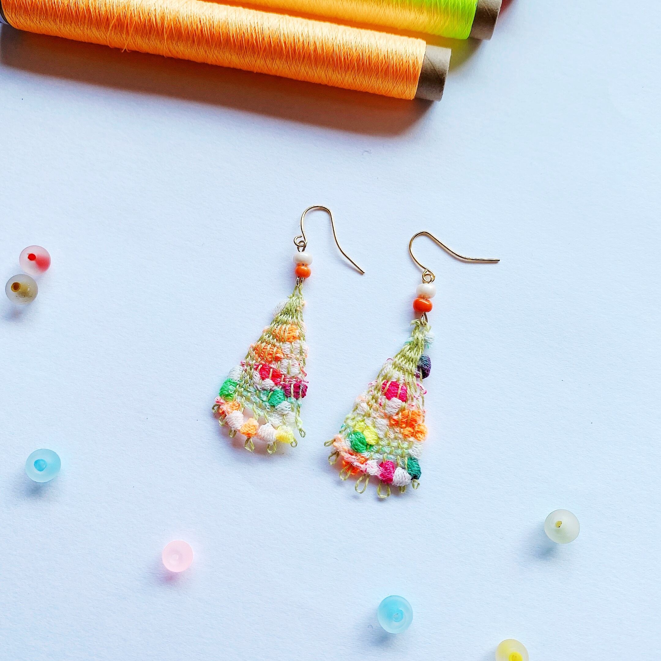 [材料]     モスグリーン色糸・ぽこぽこカラフル糸・小さなビーズ・ピアス金具