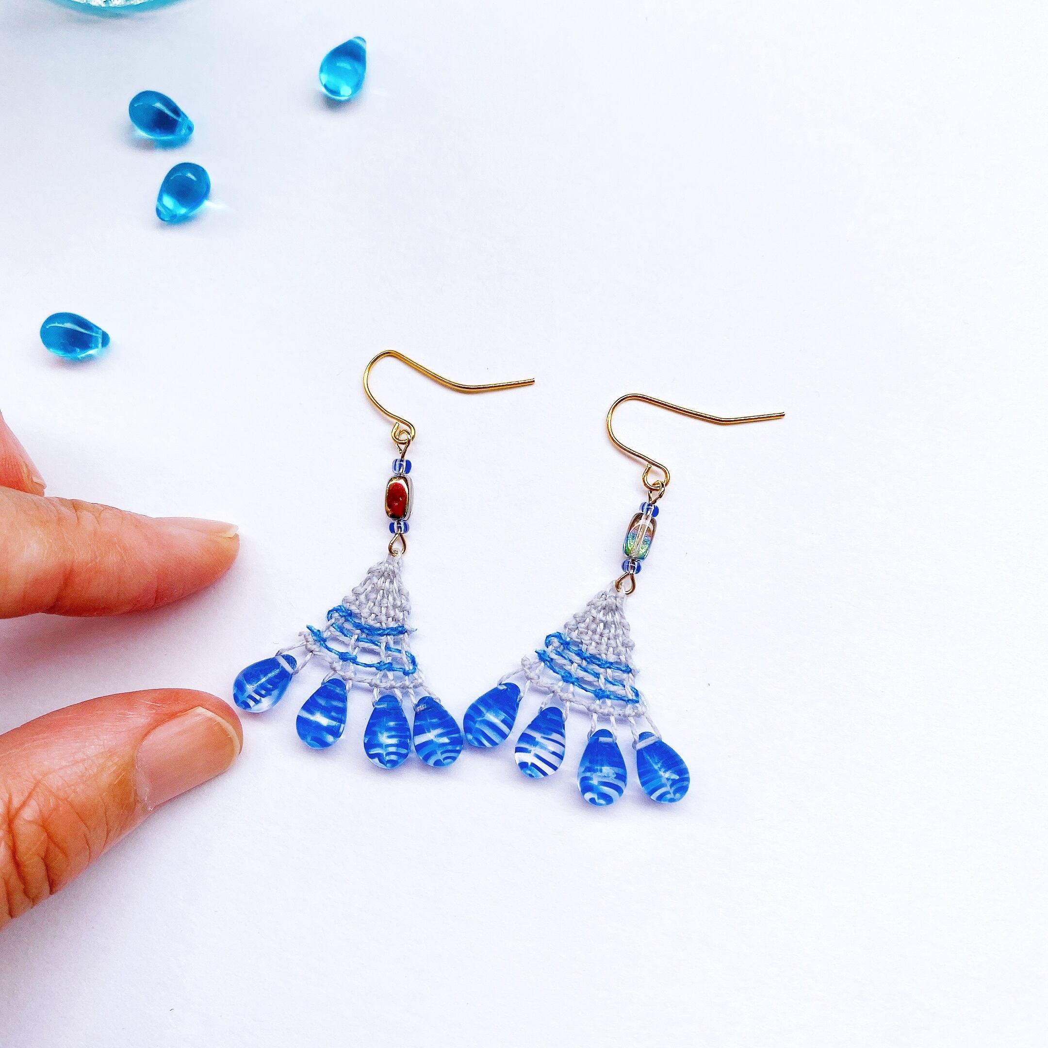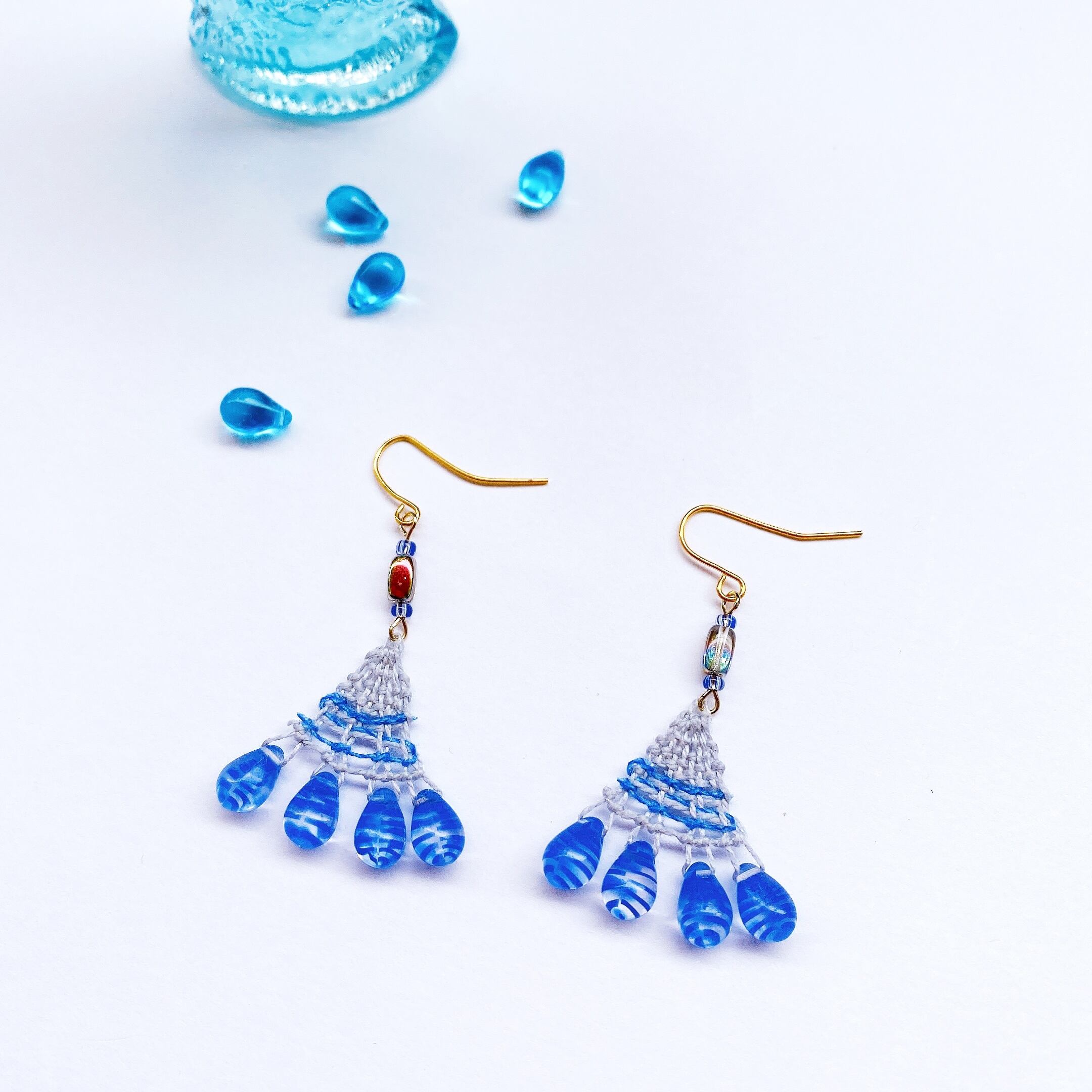 [材料]      ブルー・ストライプブルー色糸・ブルー系しずくビーズ・ビンテージフランスガラスビーズ・ピアス金具