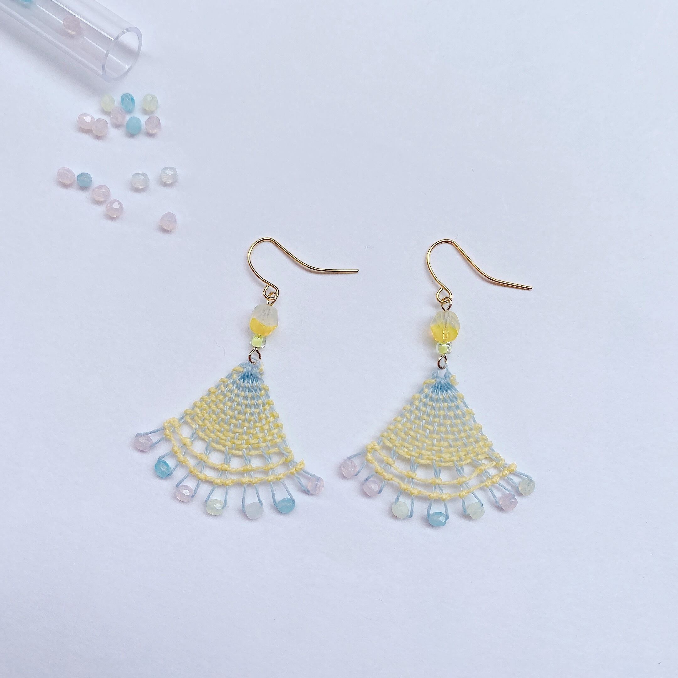 [材料]      薄い黄色・薄い青色糸・白に近いガラスビーズ・黄色&透明ガラスビーズ・ピアス金具
