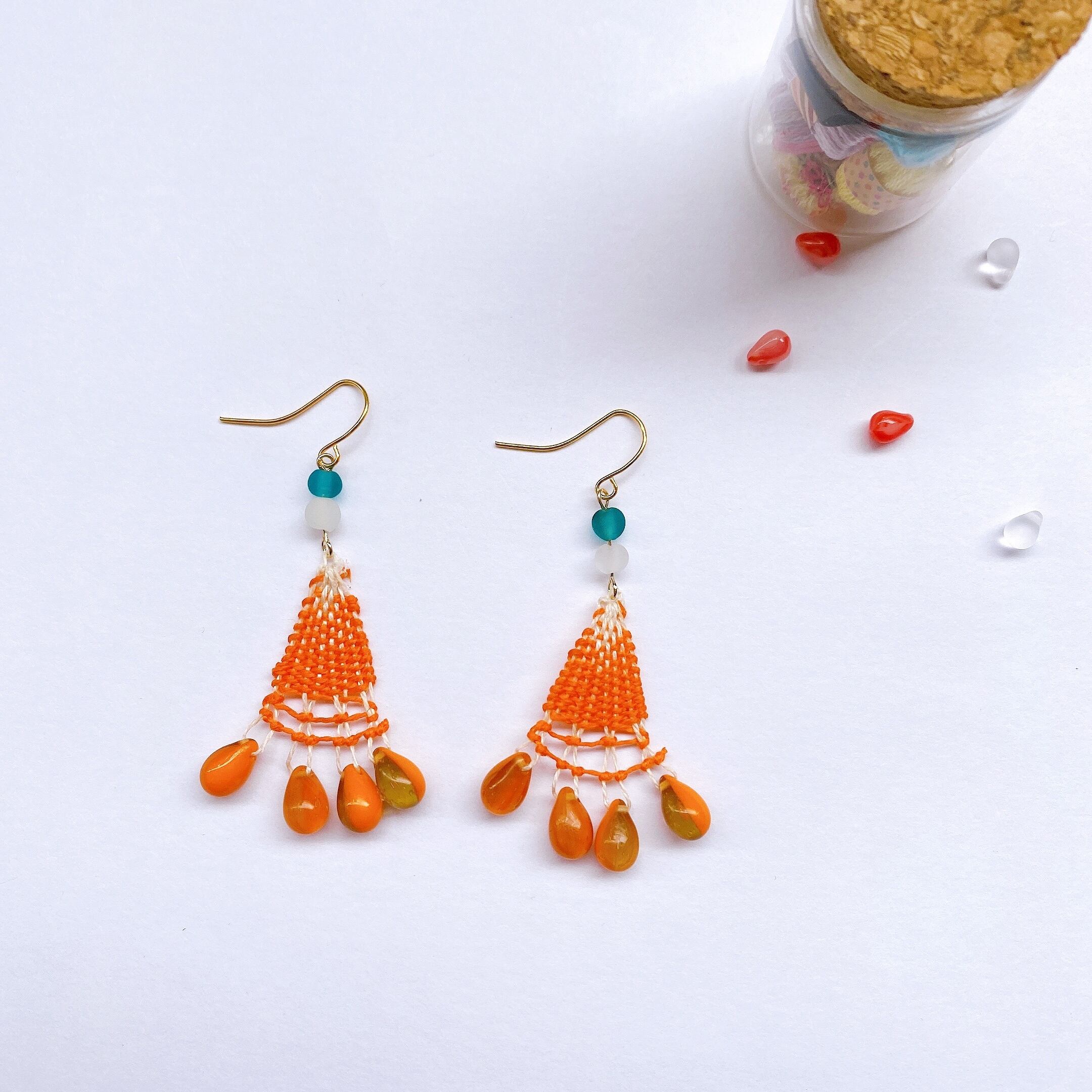 [材料] ホワイト・オレンジ糸・しずく型オレンジガラスビーズ・半透明ガラスビーズ・ピアス金具