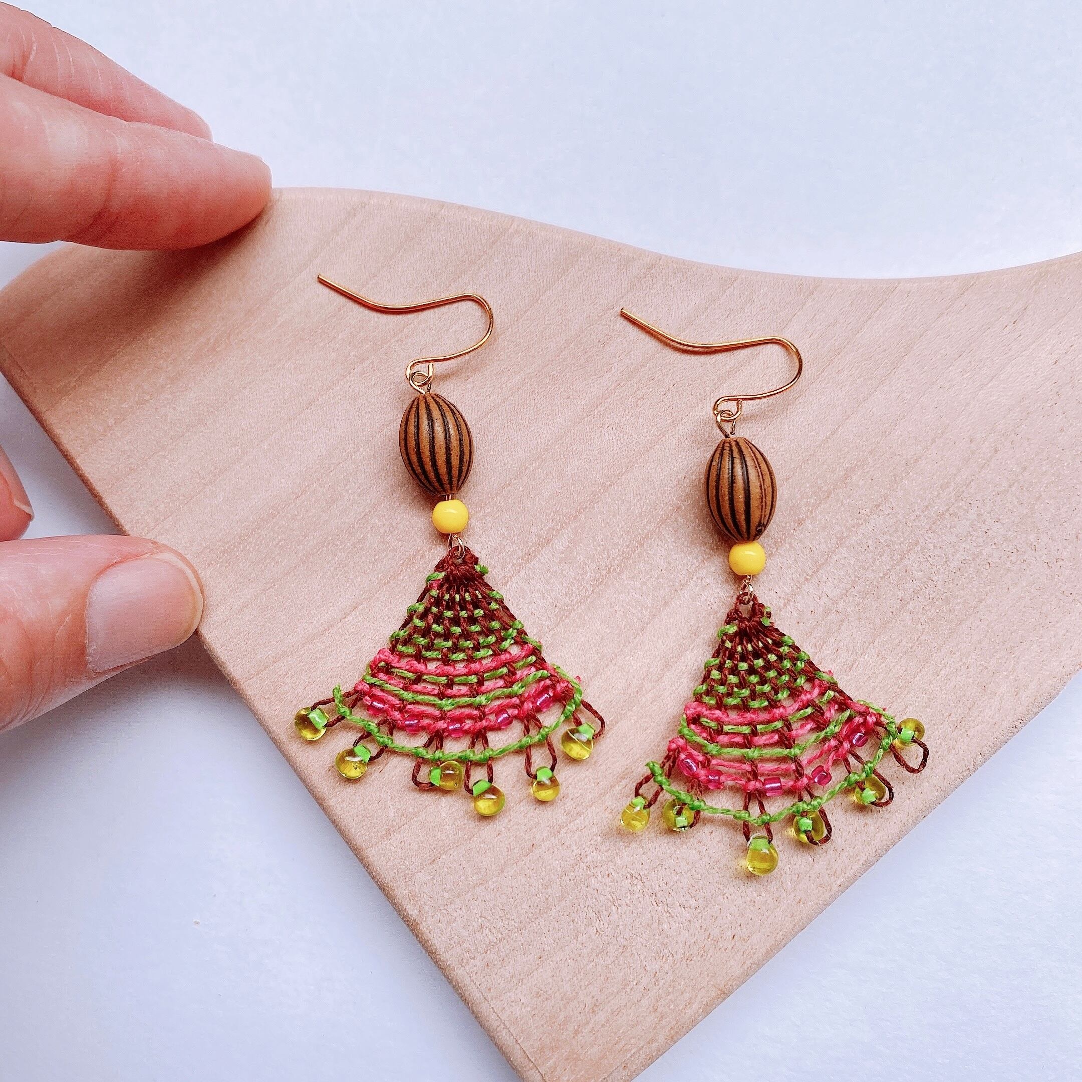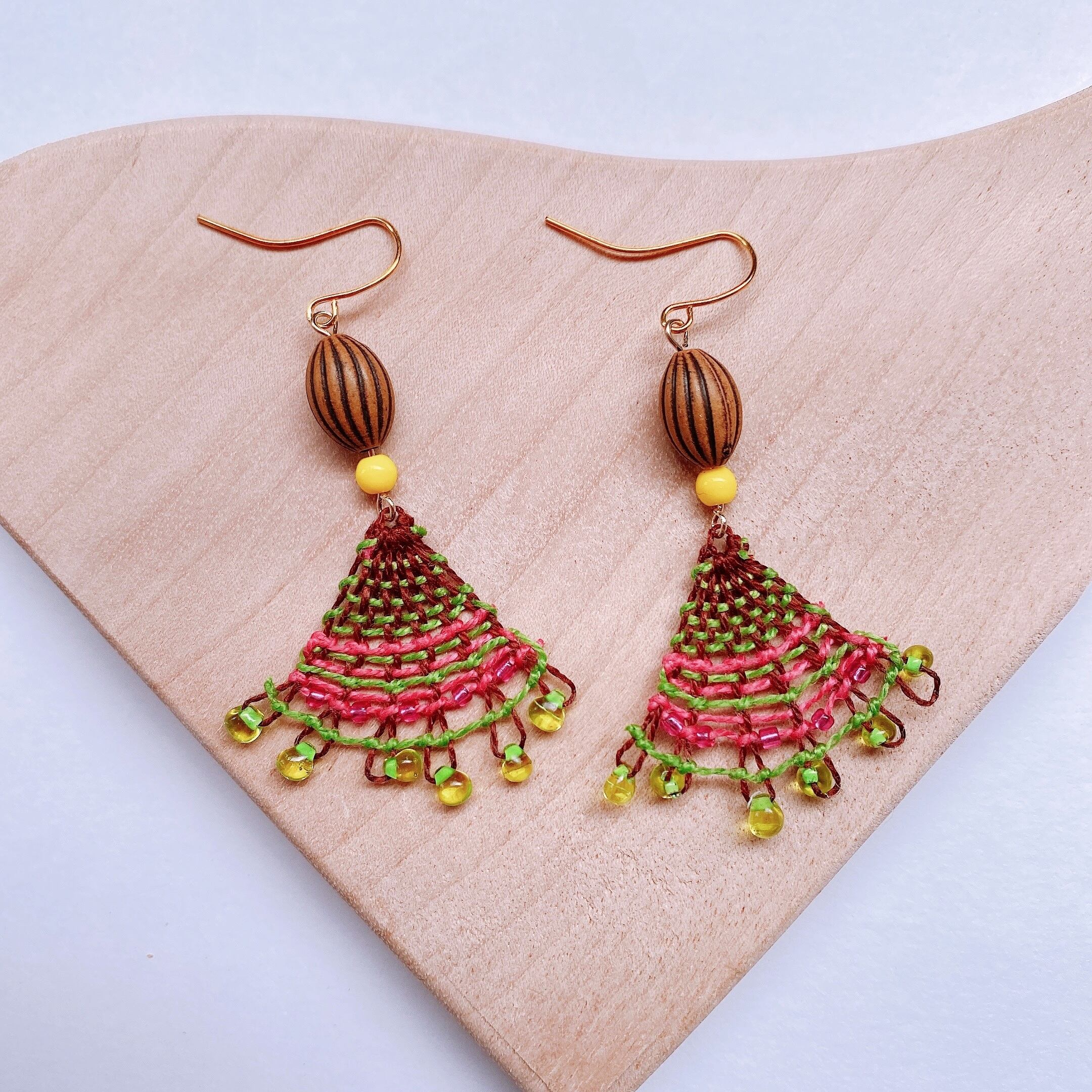 [材料]      茶色・ピンク色糸・しずく型ビーズ・ウッドビーズ・ピアス金具