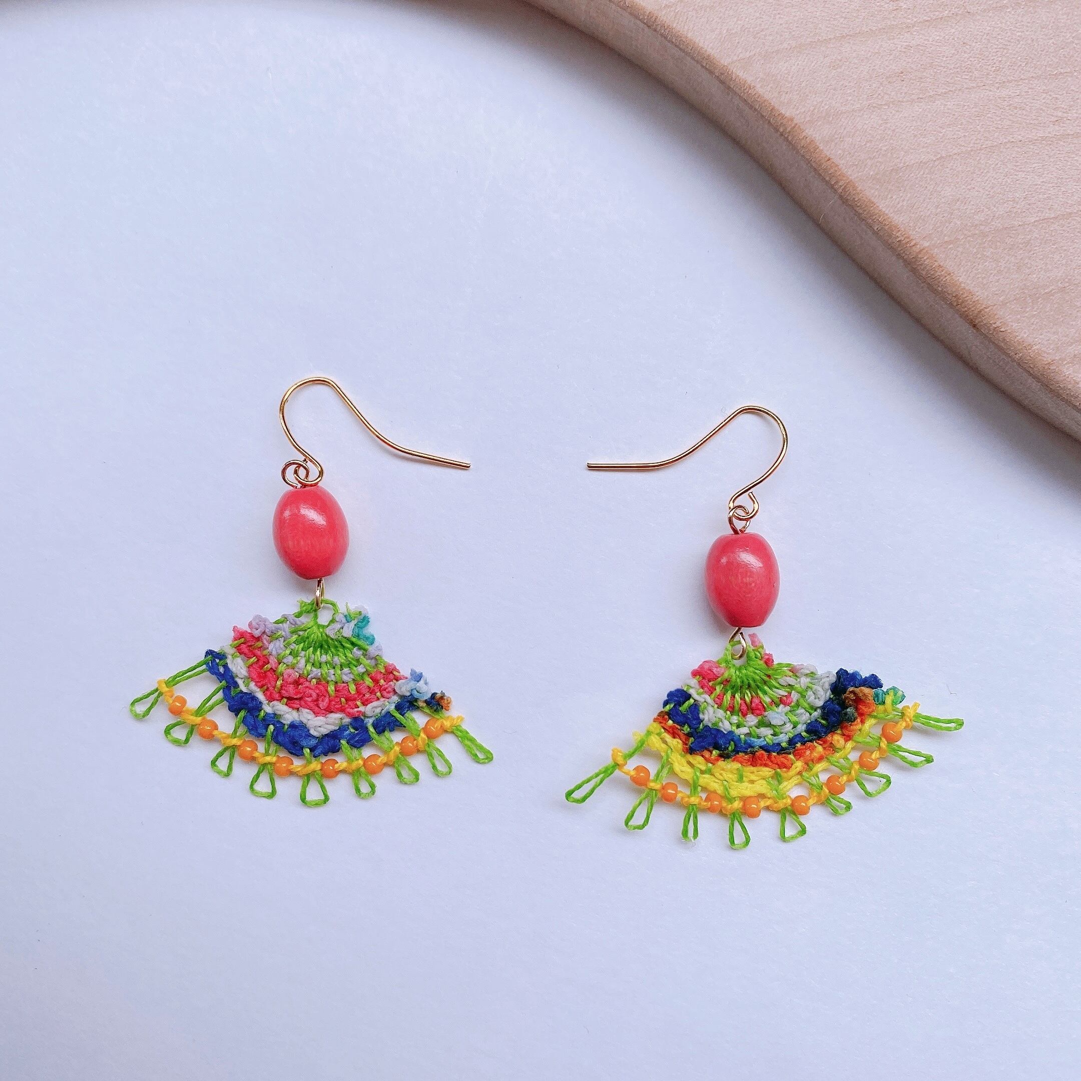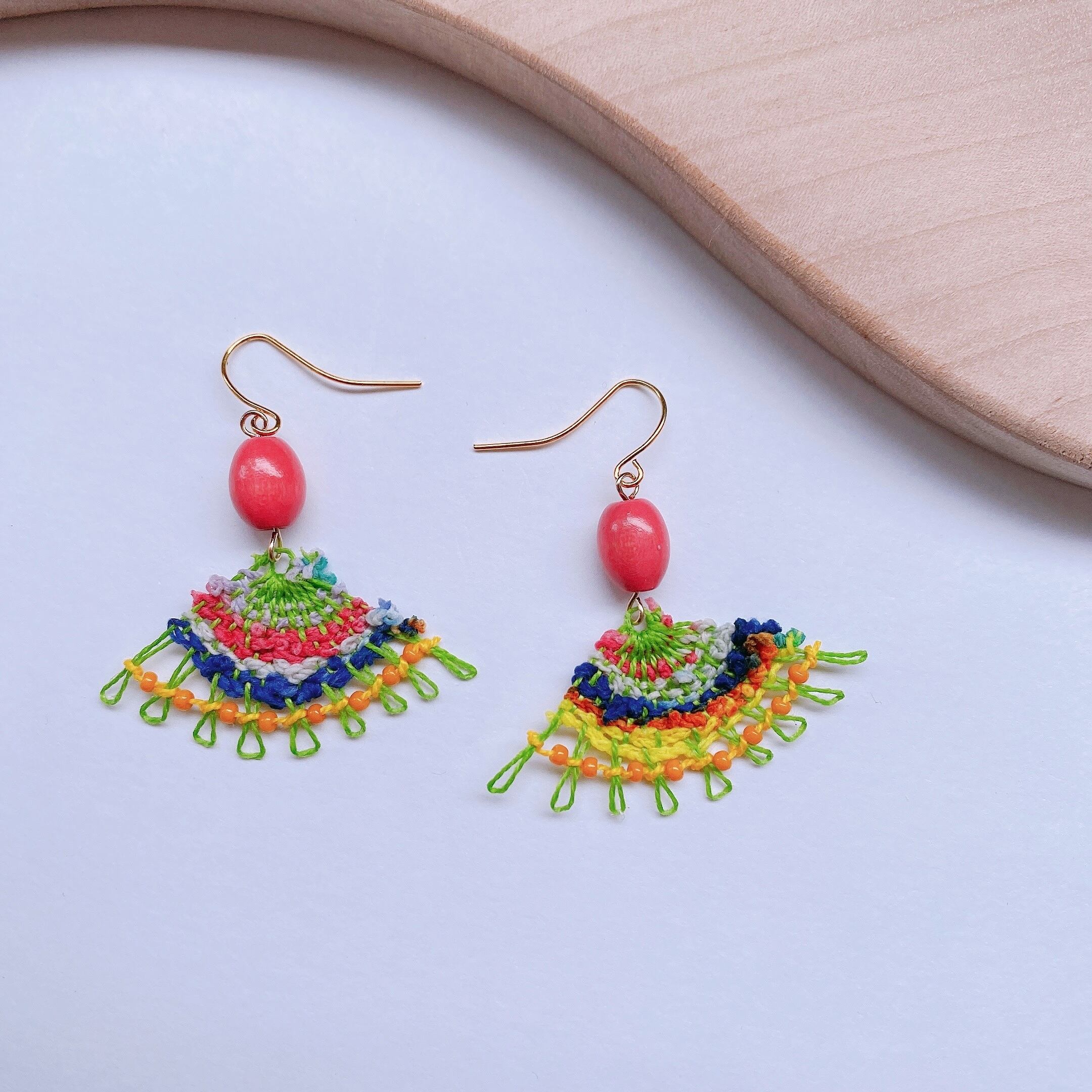 [材料]    黄緑色ベース・ぽこぽこカラフル色糸・ピンクウッドビーズ・小さなガラスビーズ・ピアス金具