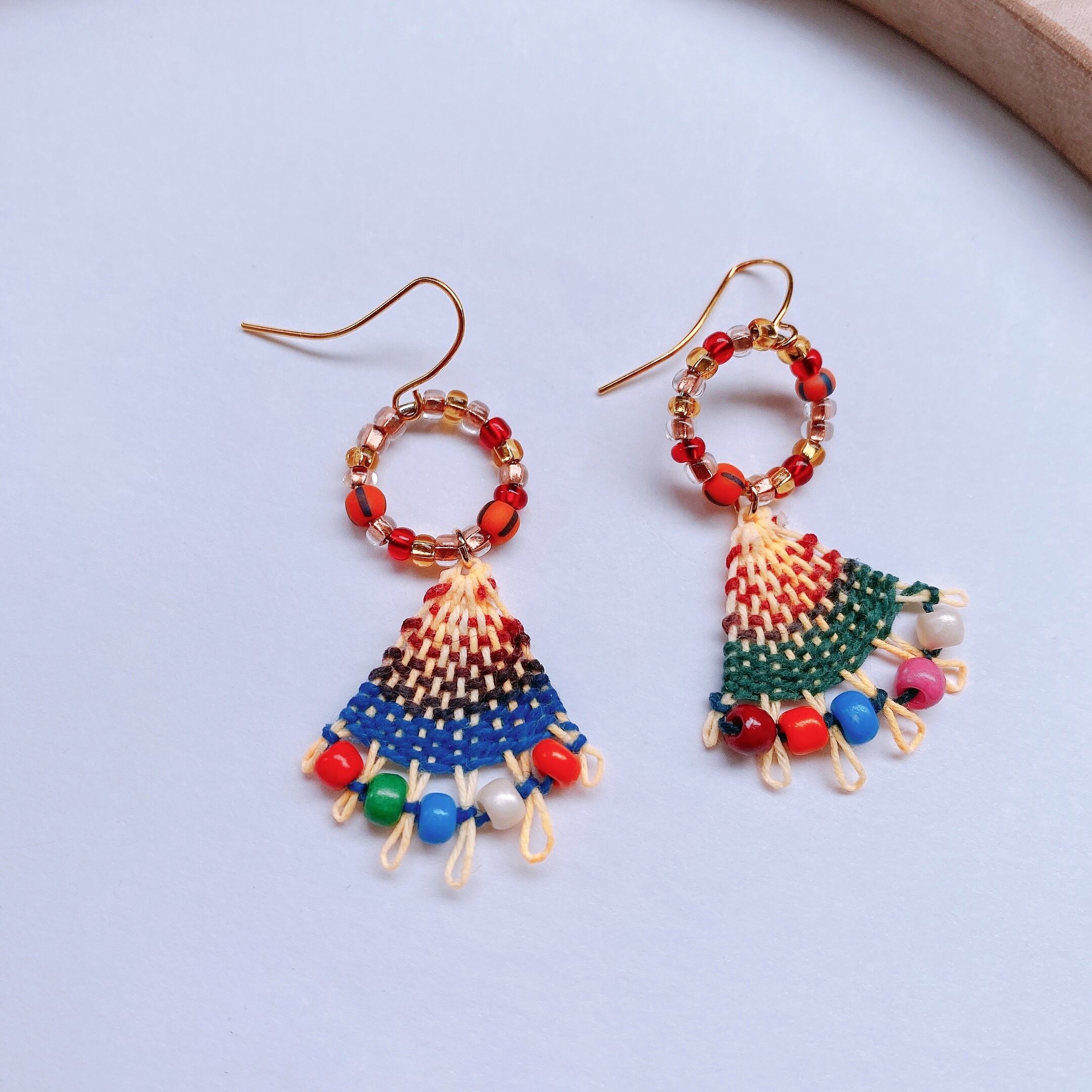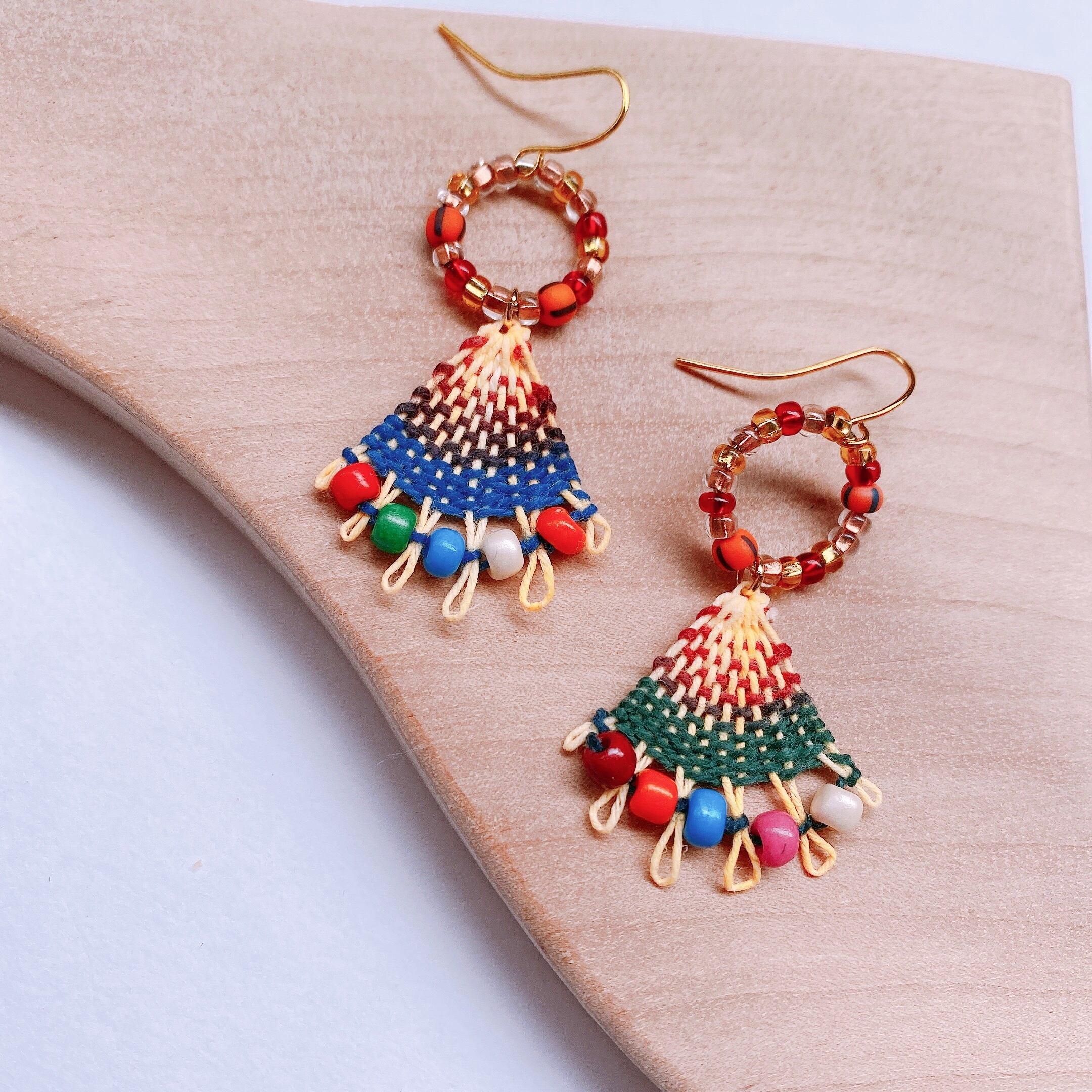 [材料]    ネオンオレンジ・グリーン色糸・カラフルビーズ・小さなガラスビーズ・ピアス金具