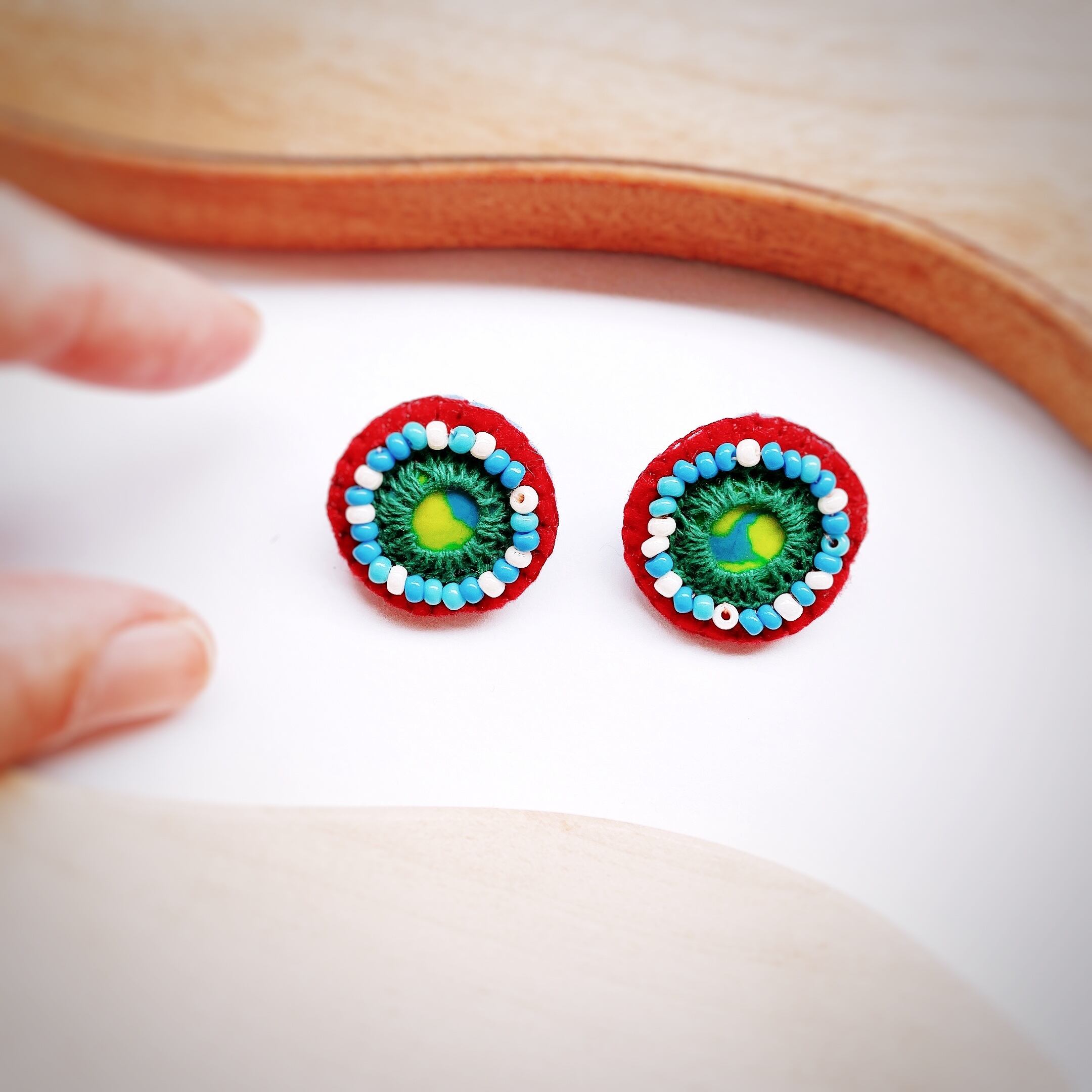 まあるくコロンと伸ばした粘土のチップを刺繍で編み包みました。