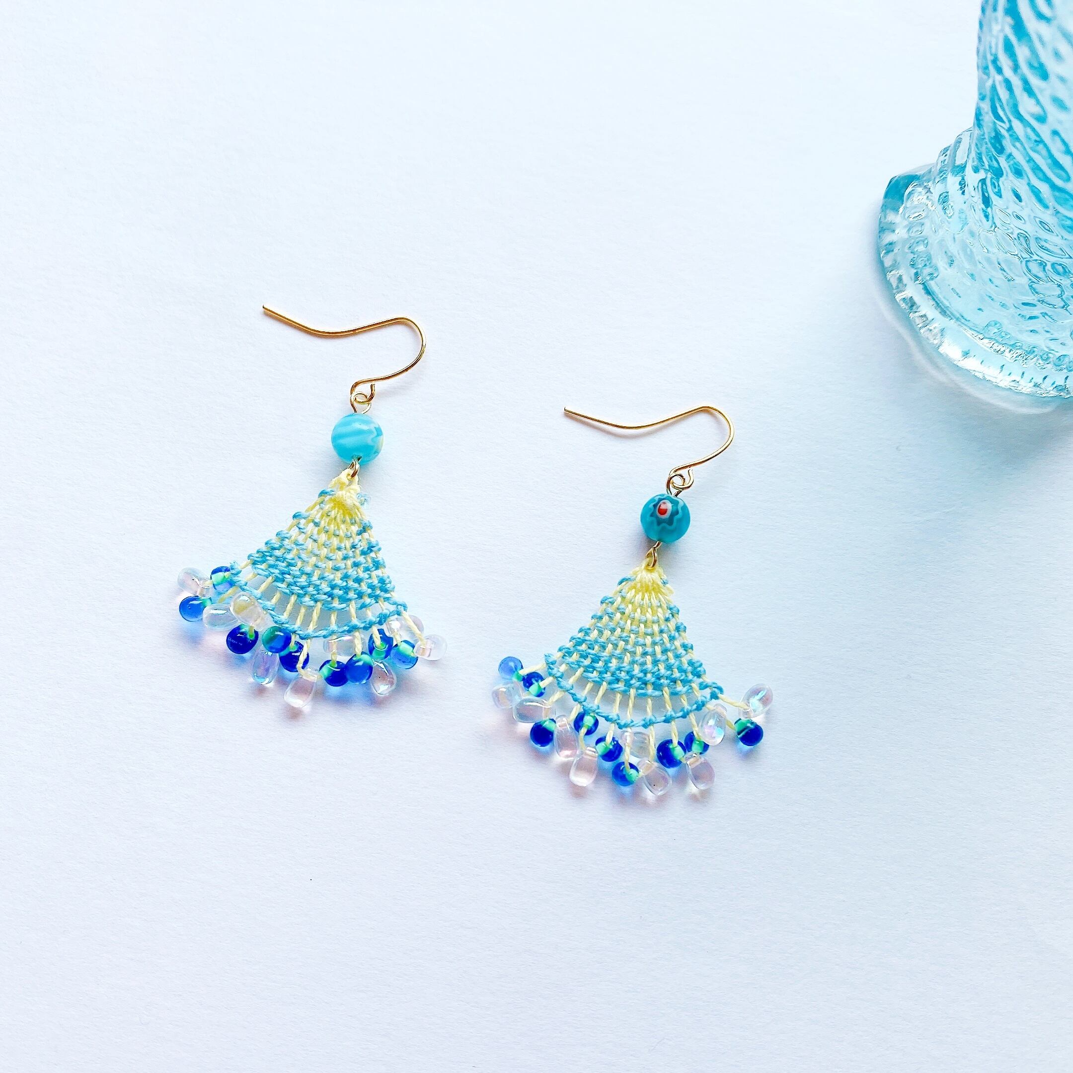 [材料]    薄い黄色糸・水色糸・しずく型ビーズ・とんぼ玉ビーズ・ピアス金具