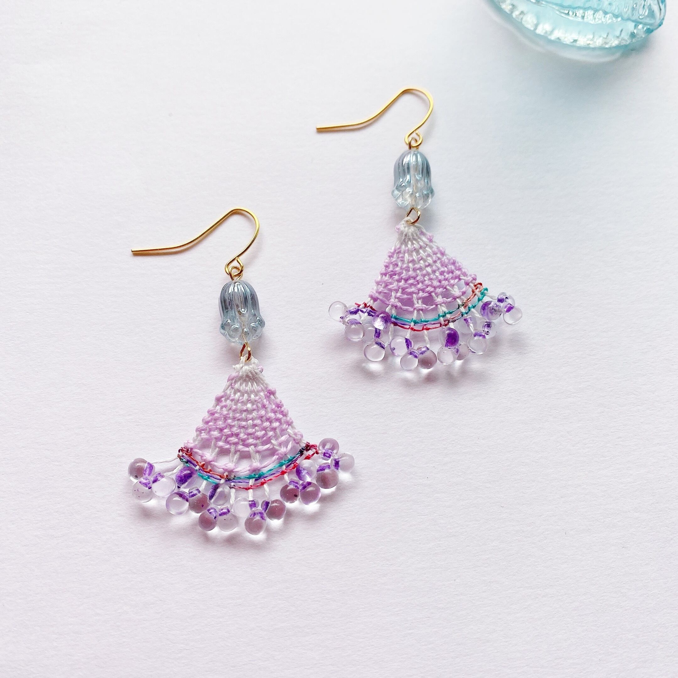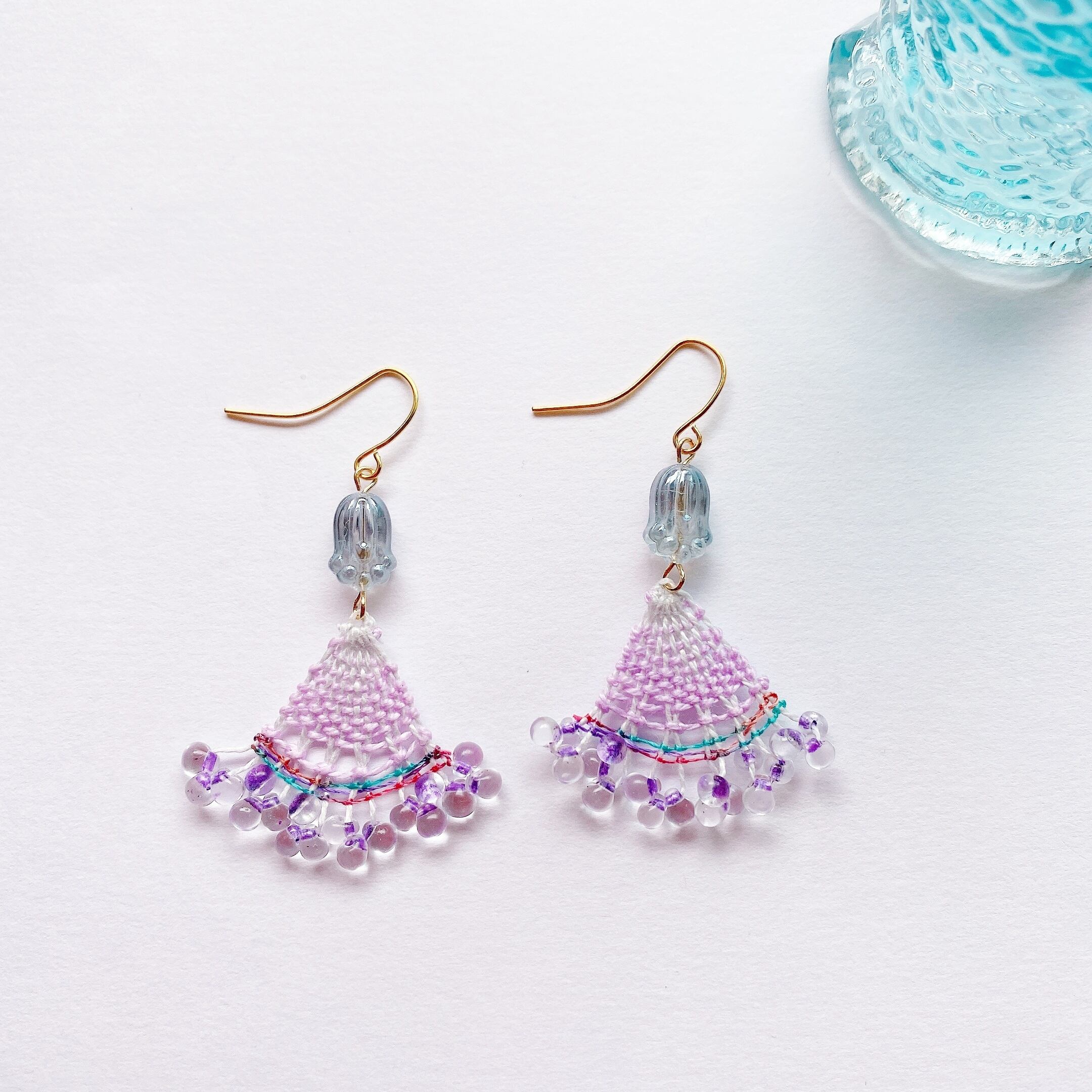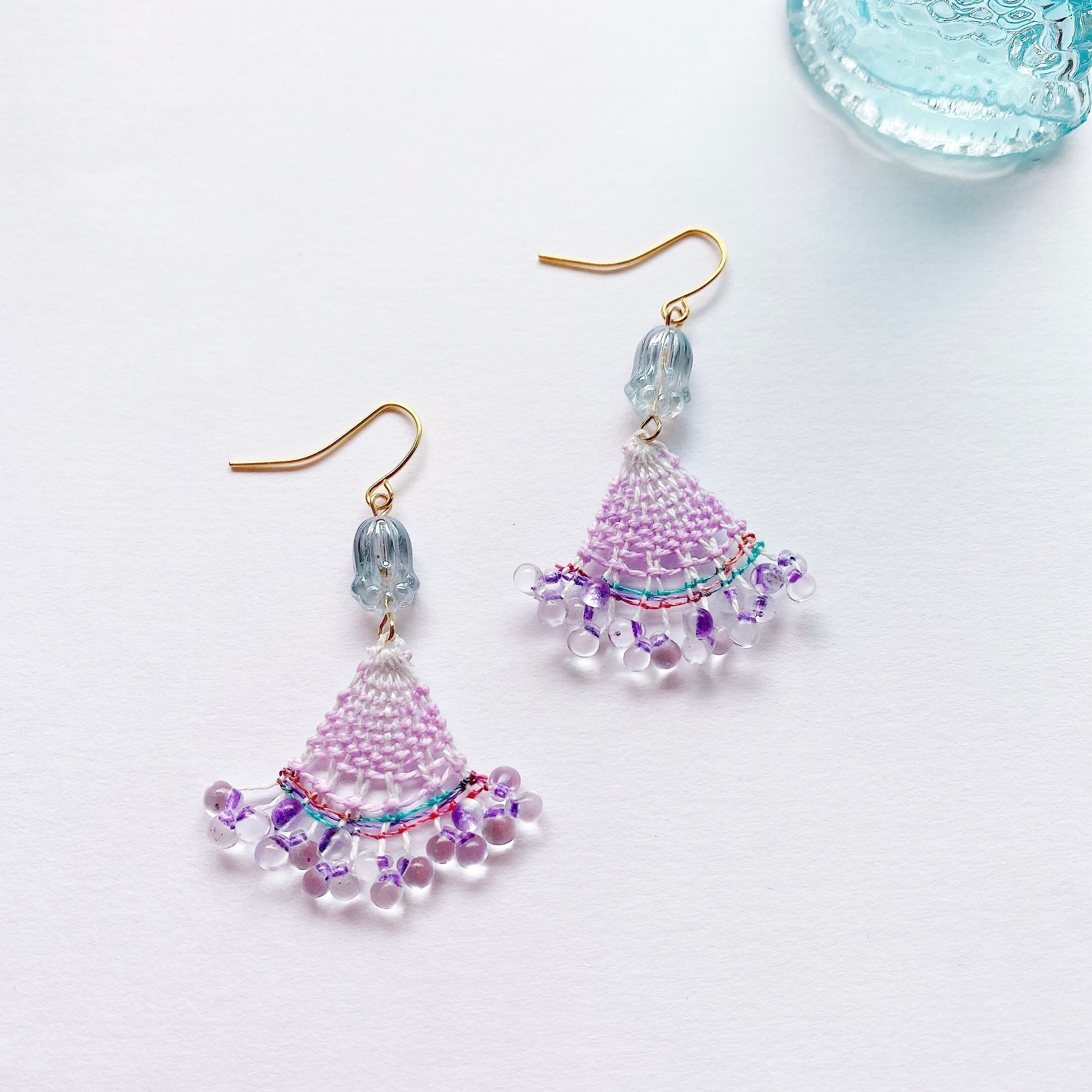 [材料]    薄いパープル色糸・グラデーション糸・しずくビーズ・お花型ガラスビーズ・ピアス金具
